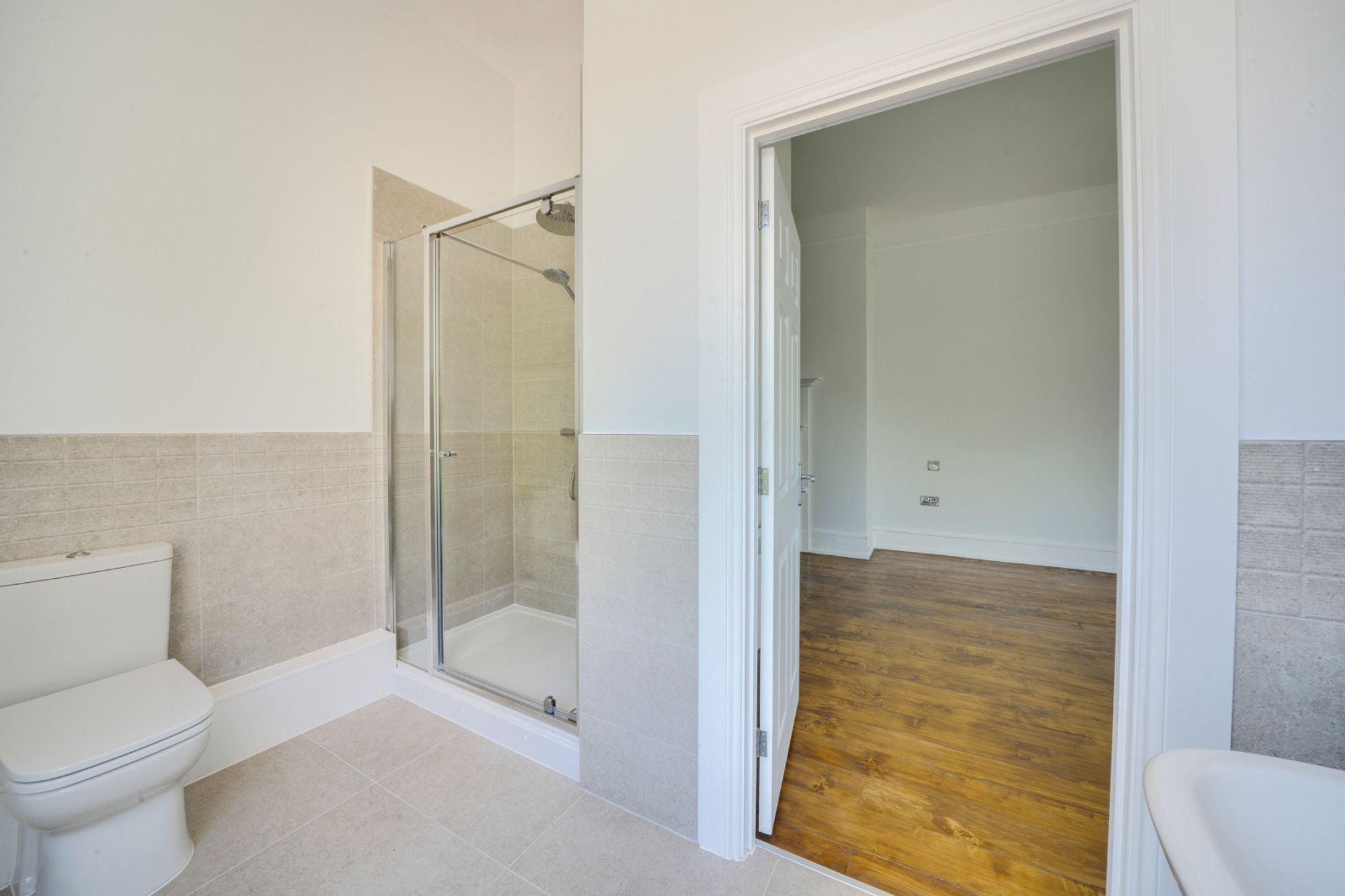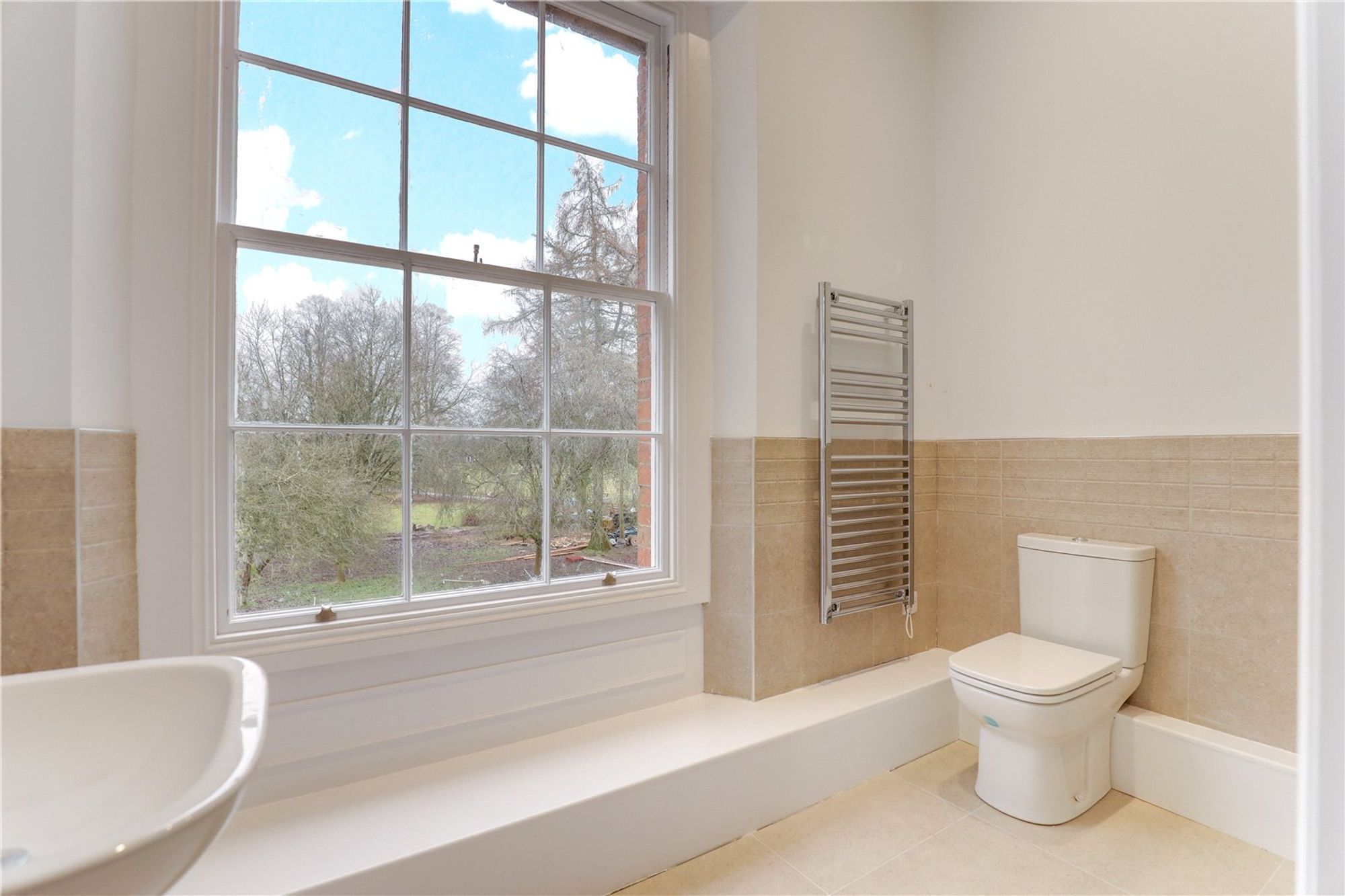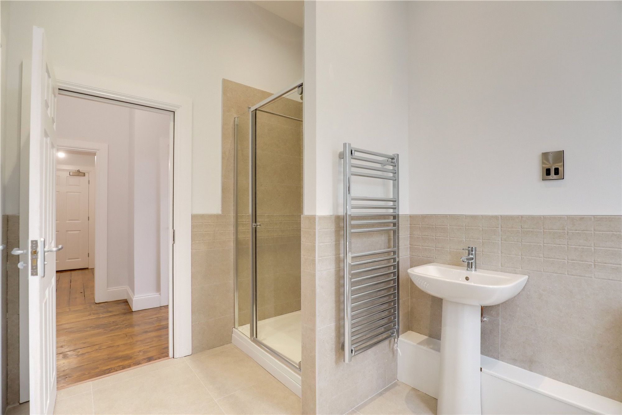 The family bathroom is well-appointed and comprises a bath, separate shower cubicle, WC, wash hand basin and heated towel rail, finished in a clean and contemporary style that complements the period setting of the apartment.