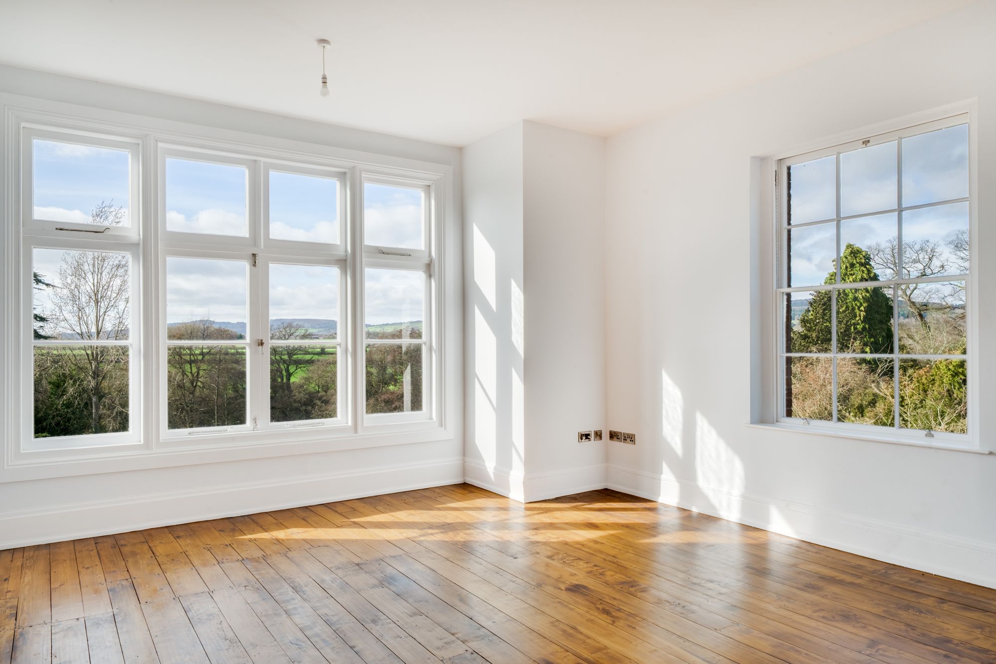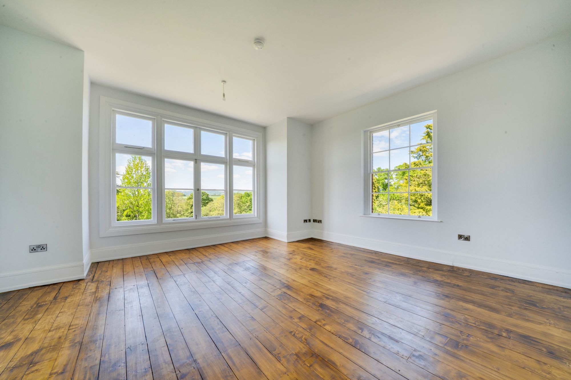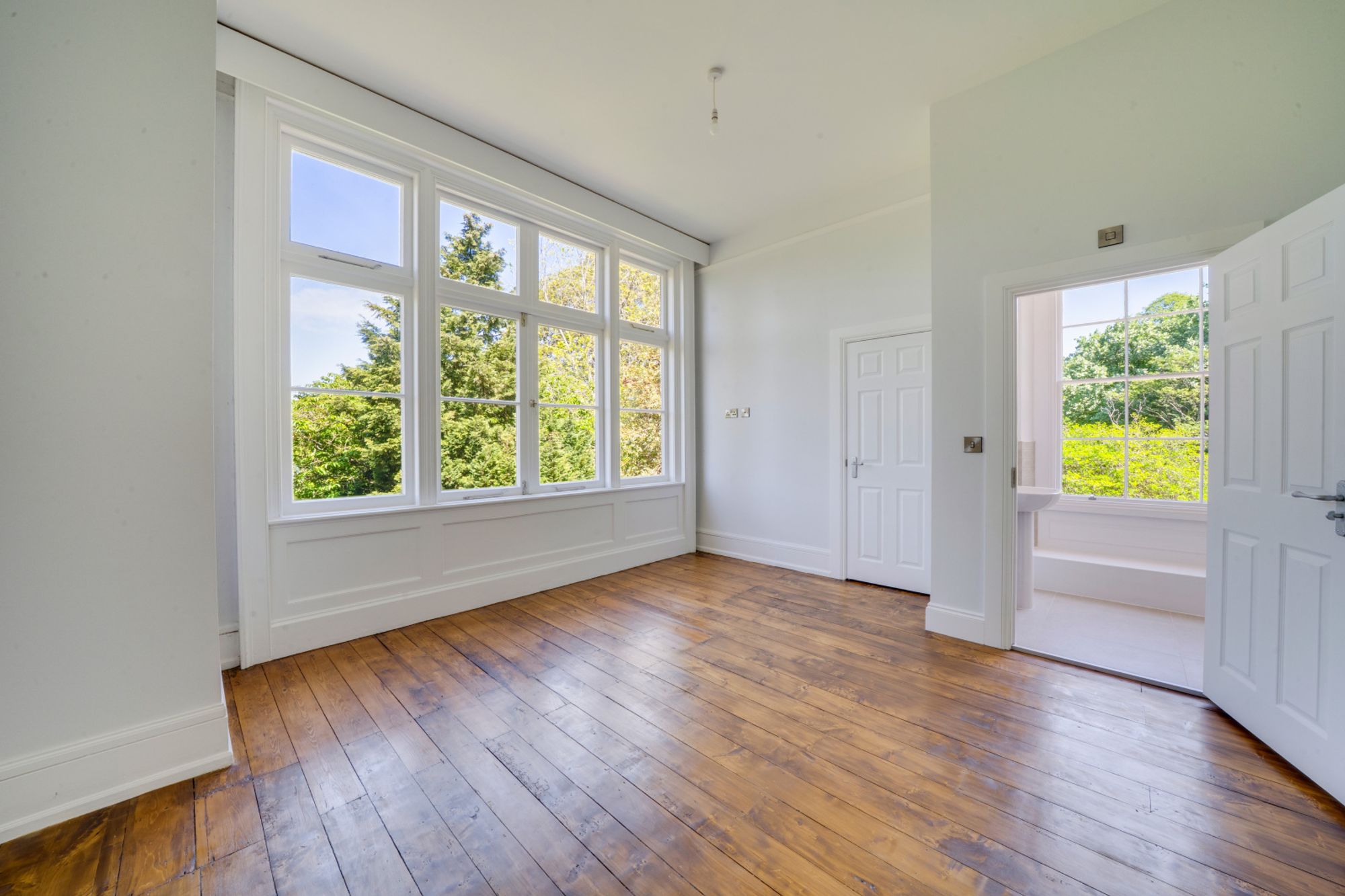 The living room is an impressive and spacious reception room, enjoying large, restored windows which frame far-reaching views and floods the space with light. Original features, including a restored fireplace and wooden flooring, create a refined yet comfortable setting, ideal for both relaxing and entertaining.