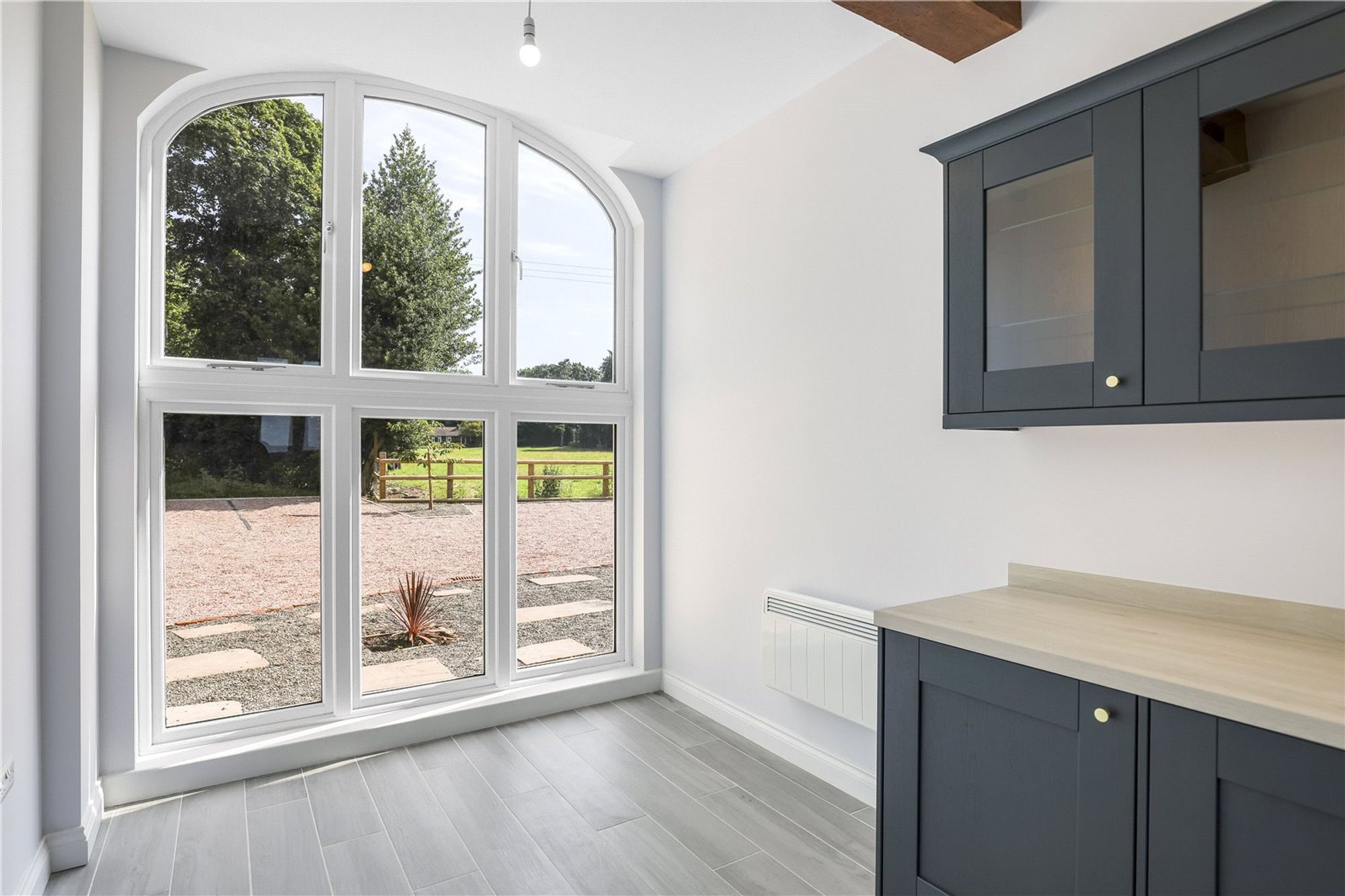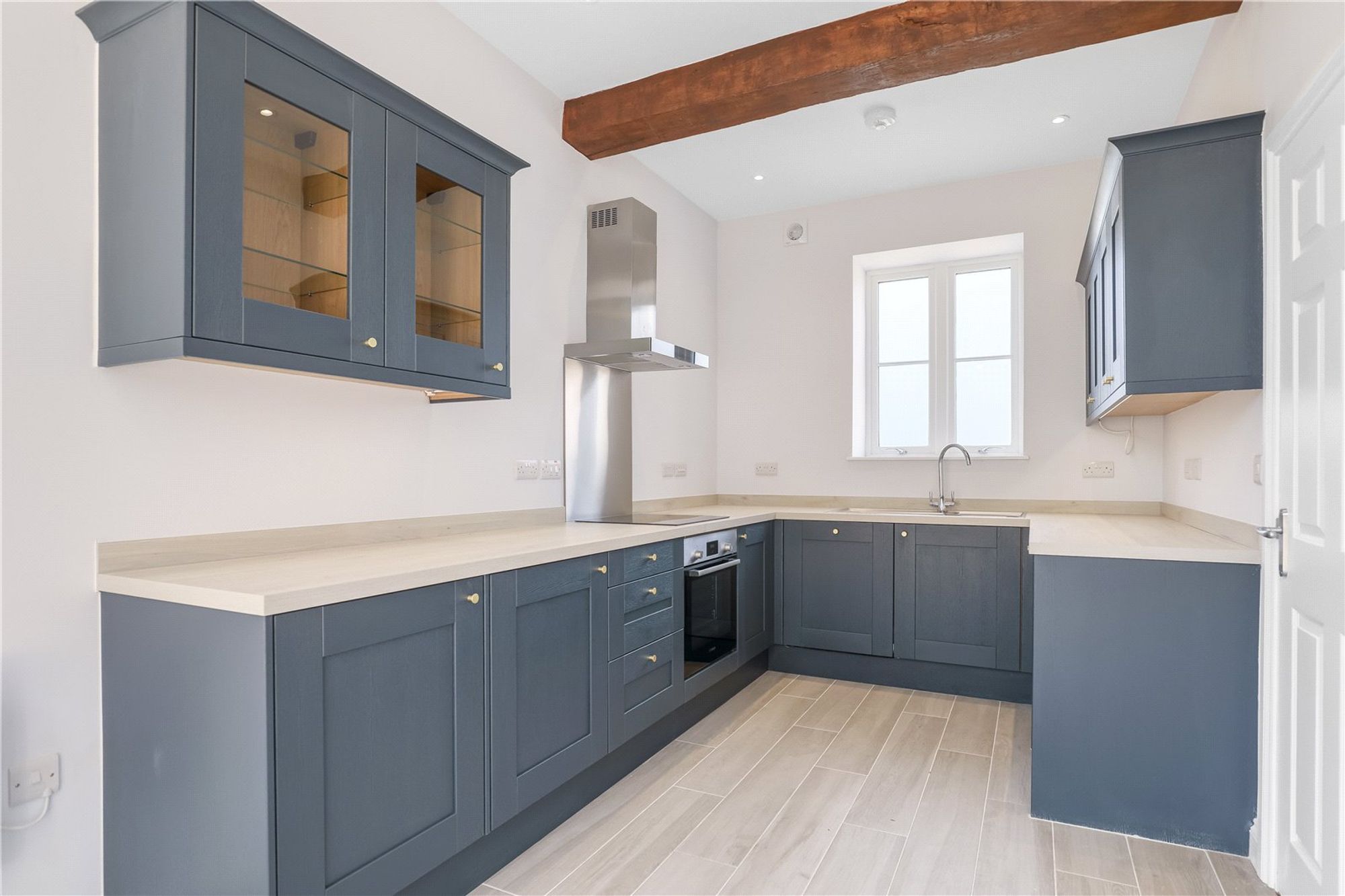 The kitchen is well proportioned and has been fitted with a bespoke range of wall and base units complemented by work surfaces. Integrated appliances include a Bosch oven with hob and extractor above, along with a Beko fridge, freezer and dishwasher, creating a functional and well-appointed space suited to everyday use. The space comfortably accommodates a dining table, making it suitable for everyday meals and informal entertaining.