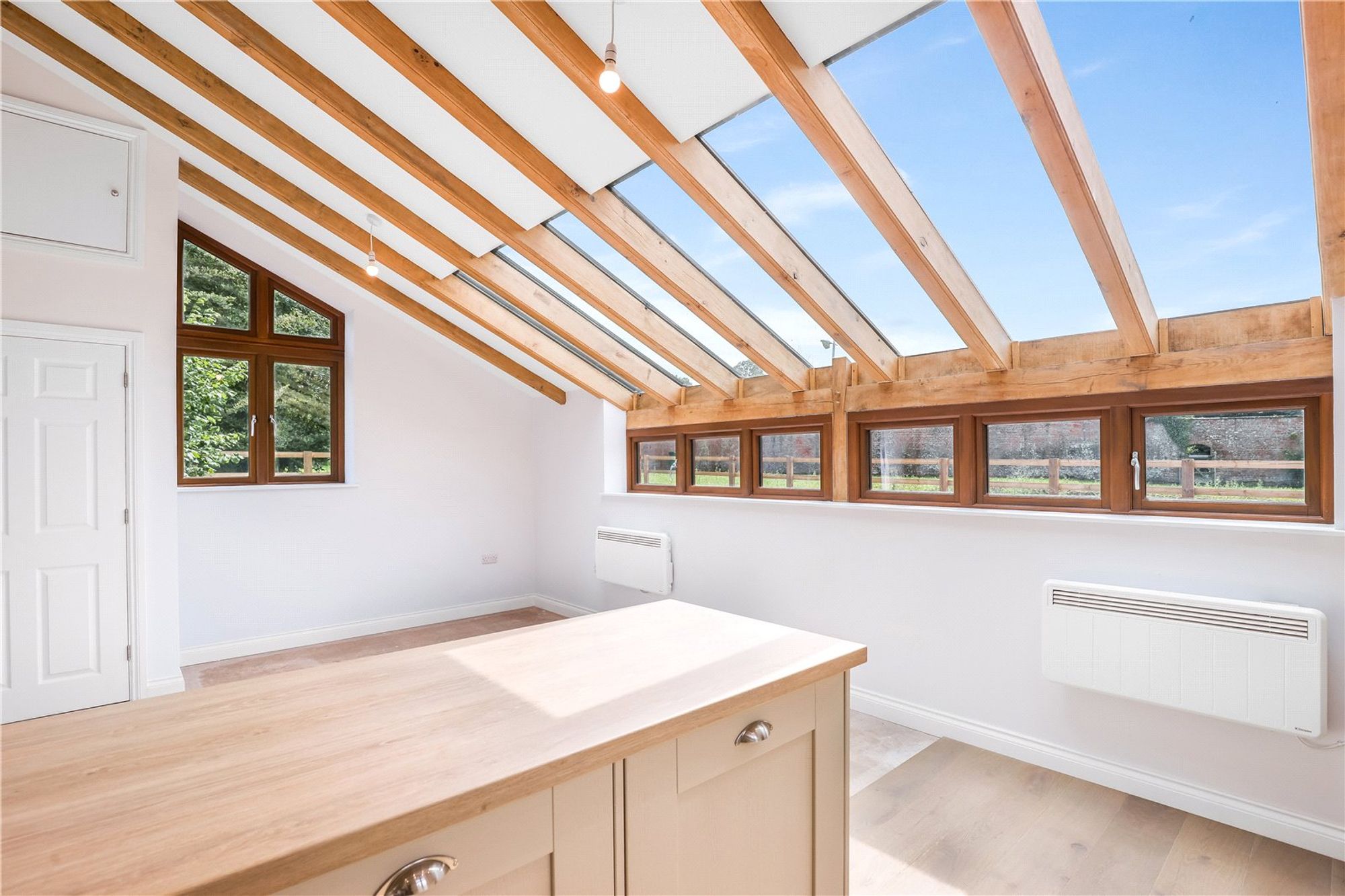 To your left, the heart of the home is the expansive living and kitchen area, perfectly suited for both relaxation and entertaining. The open-plan design creates a bright and airy atmosphere, with ample room for seating and dining. The bespoke kitchen has been fitted with a beautiful range of wall and base units with worktop over. There is a Bosch integrated oven with built in hob and extractor over. Beko built in fridge, freezer and dishwasher.