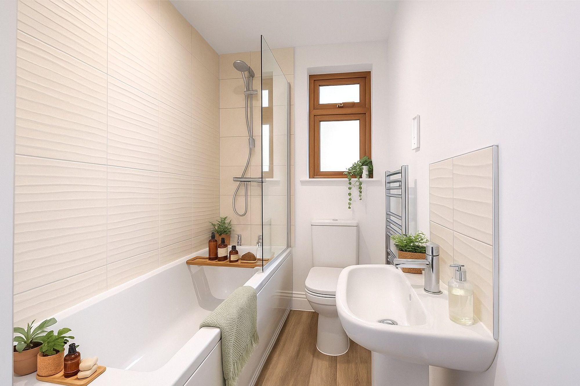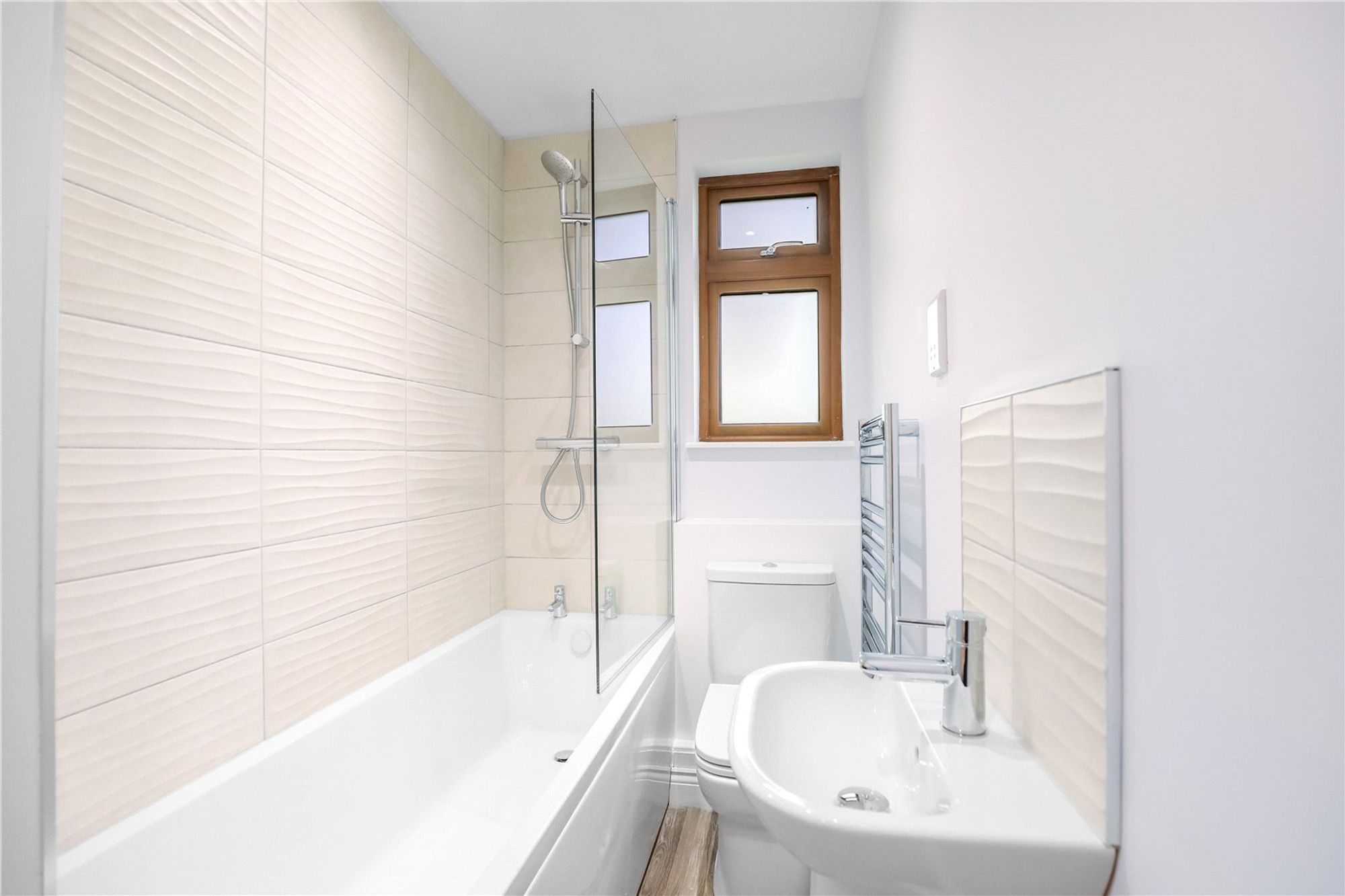 Moving to the right, the property features two generously sized bedrooms. The master bedroom, positioned towards the rear, offers a peaceful retreat with its own en-suite bathroom for added privacy, comprising of bath with shower over, wash hand basin, WC and heated towel rail. Additionally, the master bedroom features a walk-in wardrobe, providing excellent storage space.
