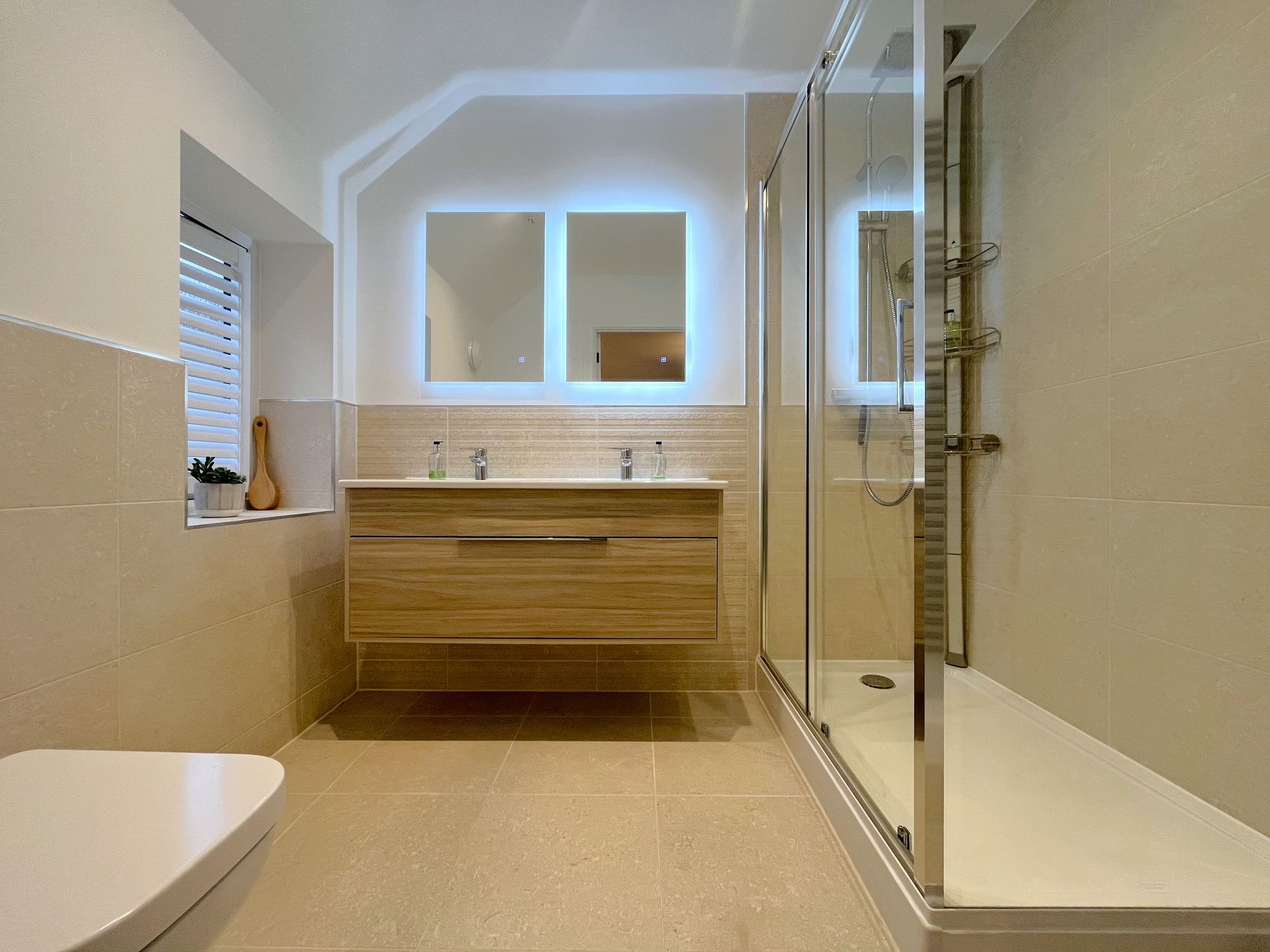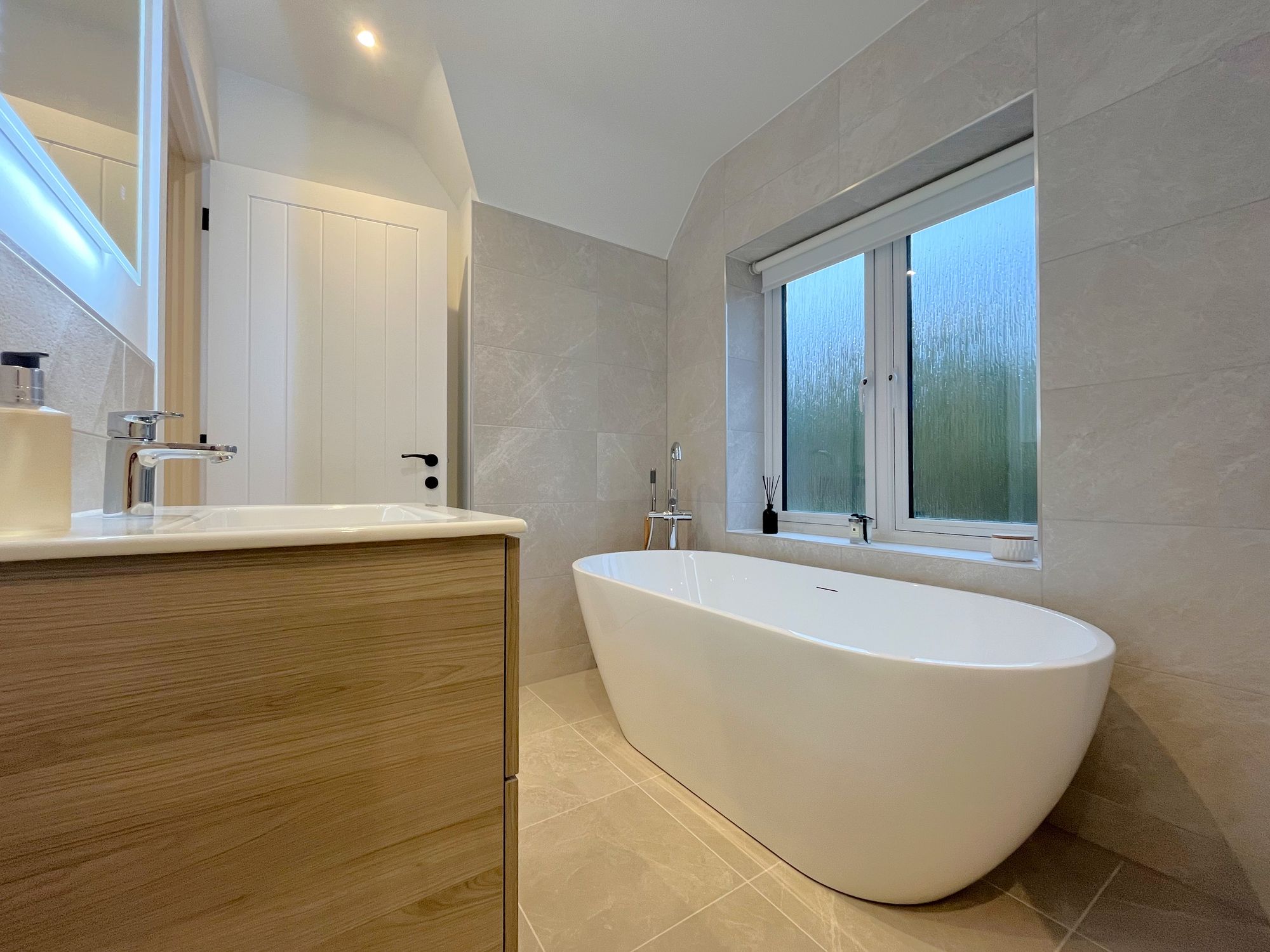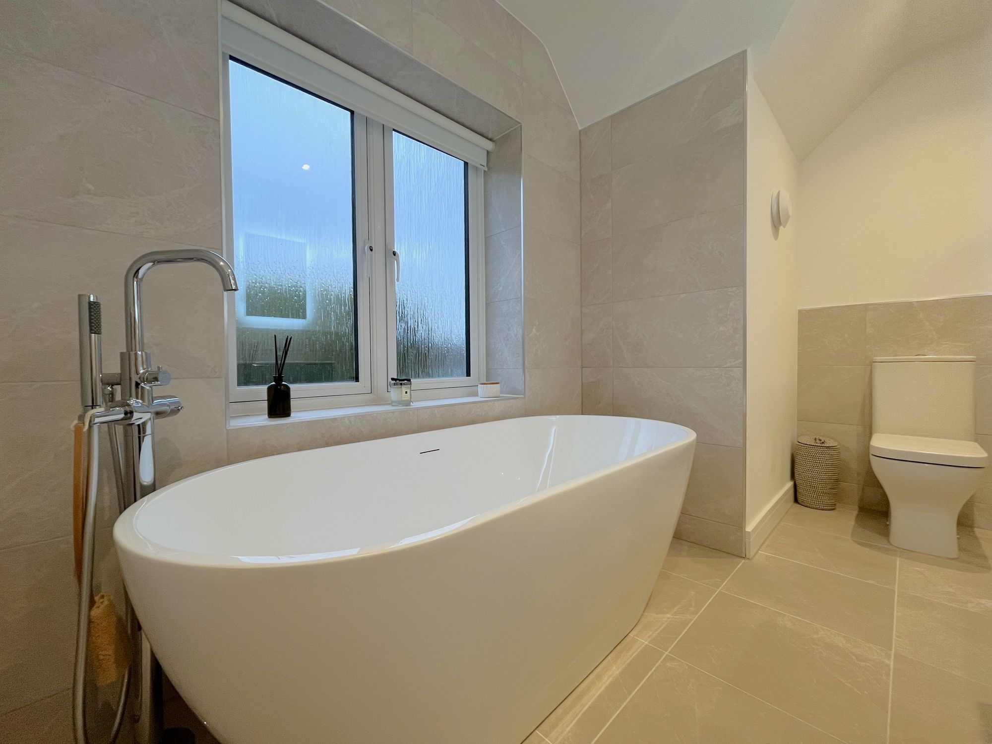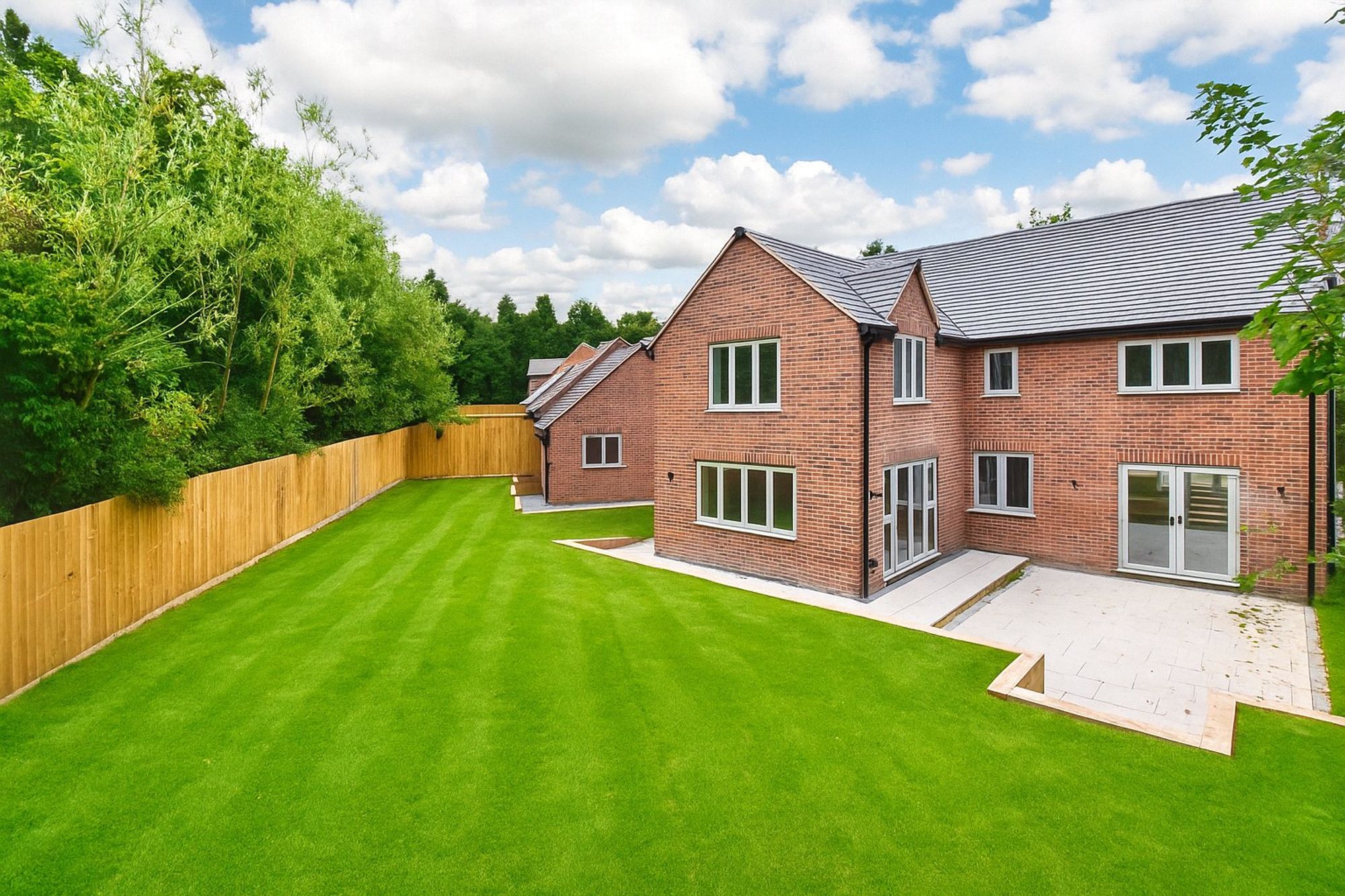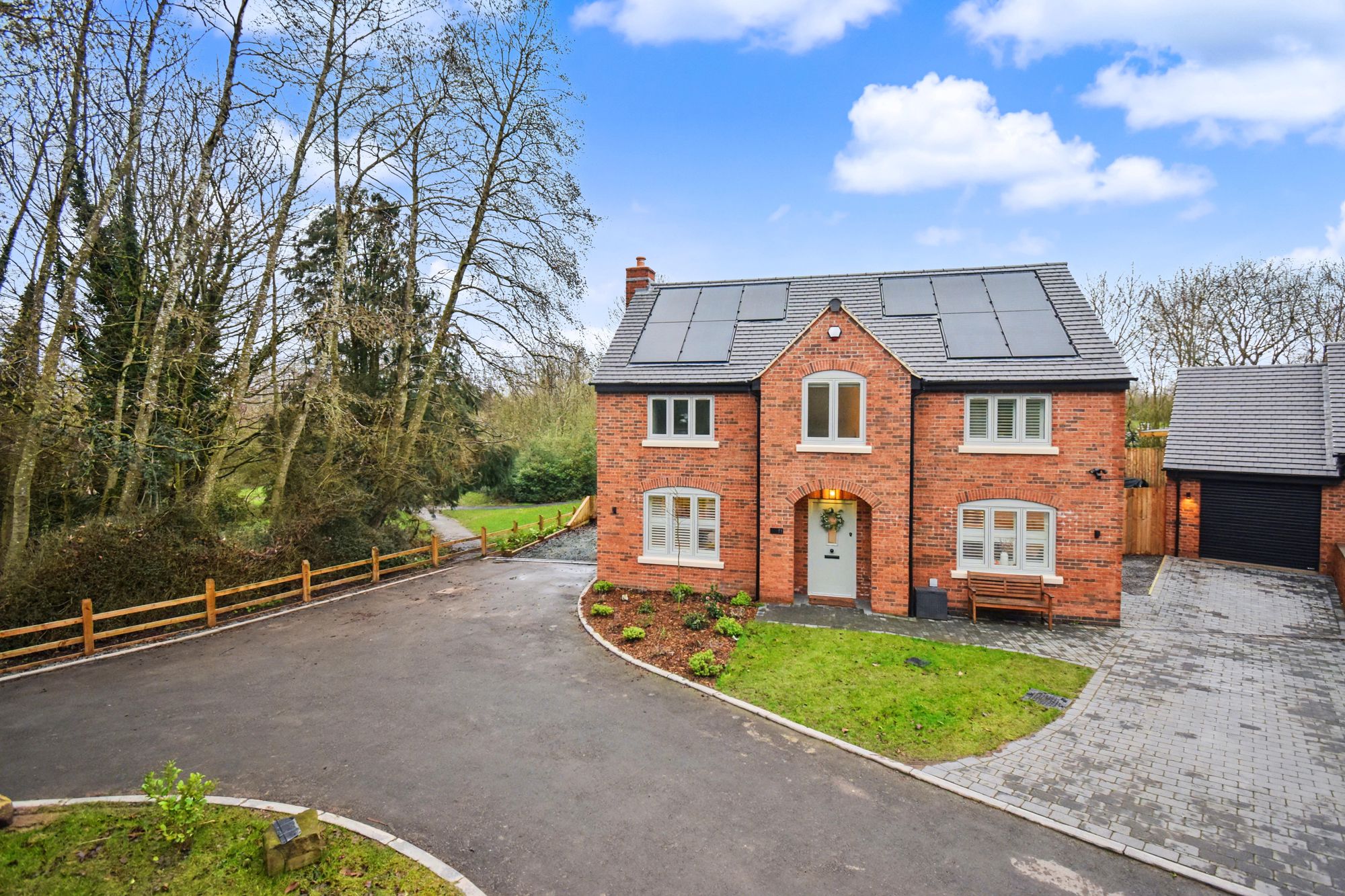 Outside, there is a large garden and a separate single garage with driveway to the front and further parking at the opposite side of the house. Garden with turf finish. The first floor has four double bedrooms with two ensuite, one with a double vanity unit, and house bathroom with freestanding bath and separate shower.