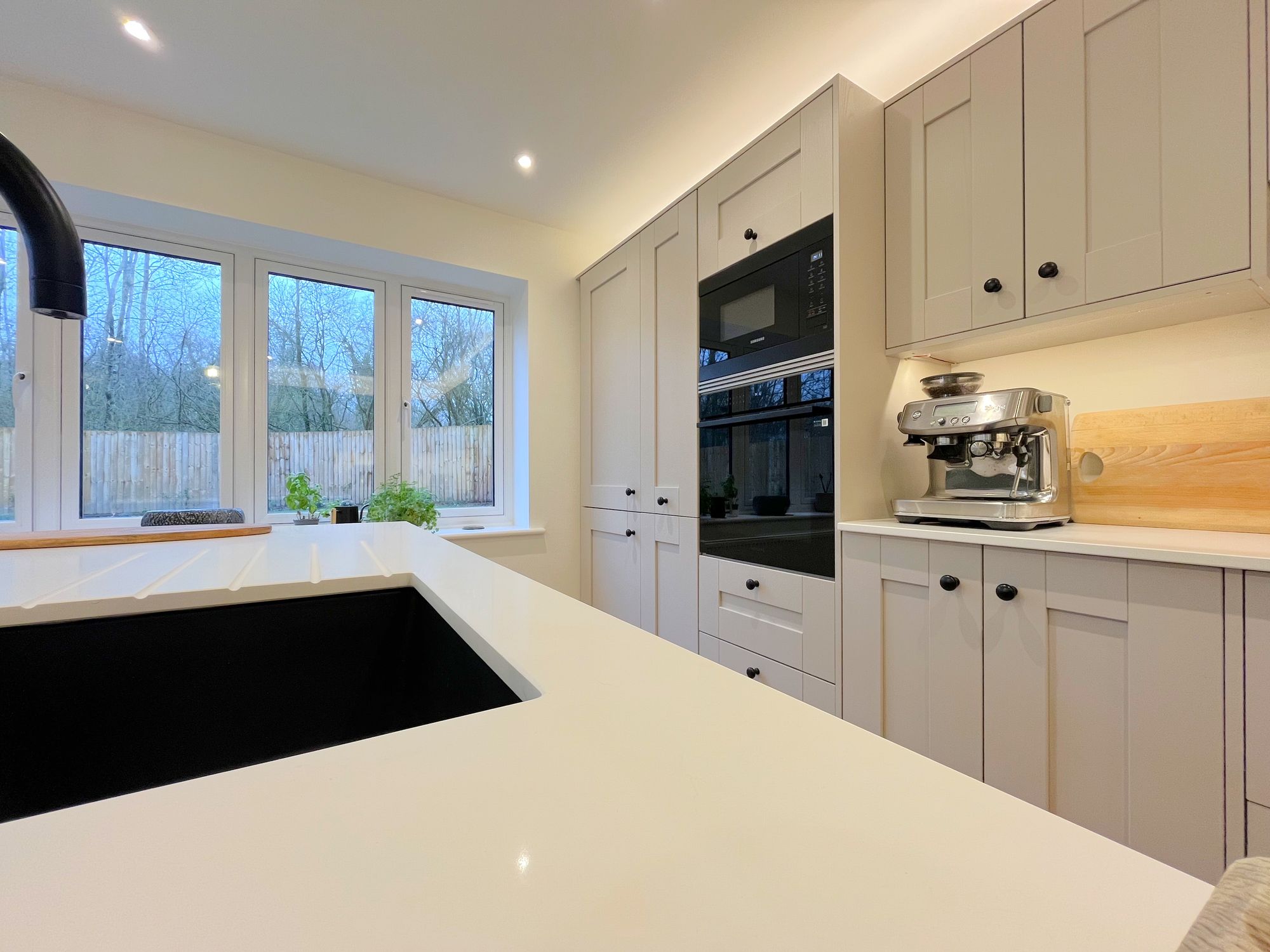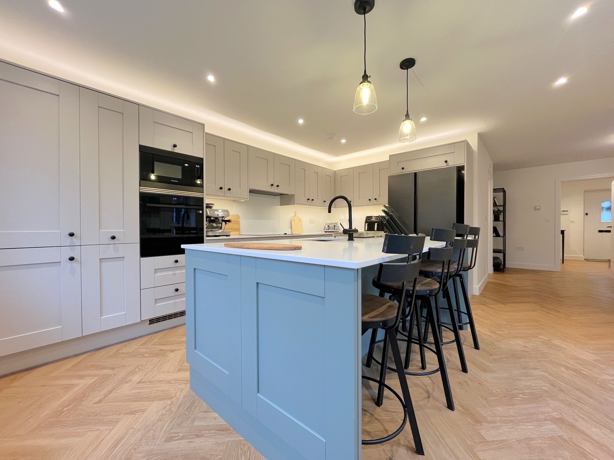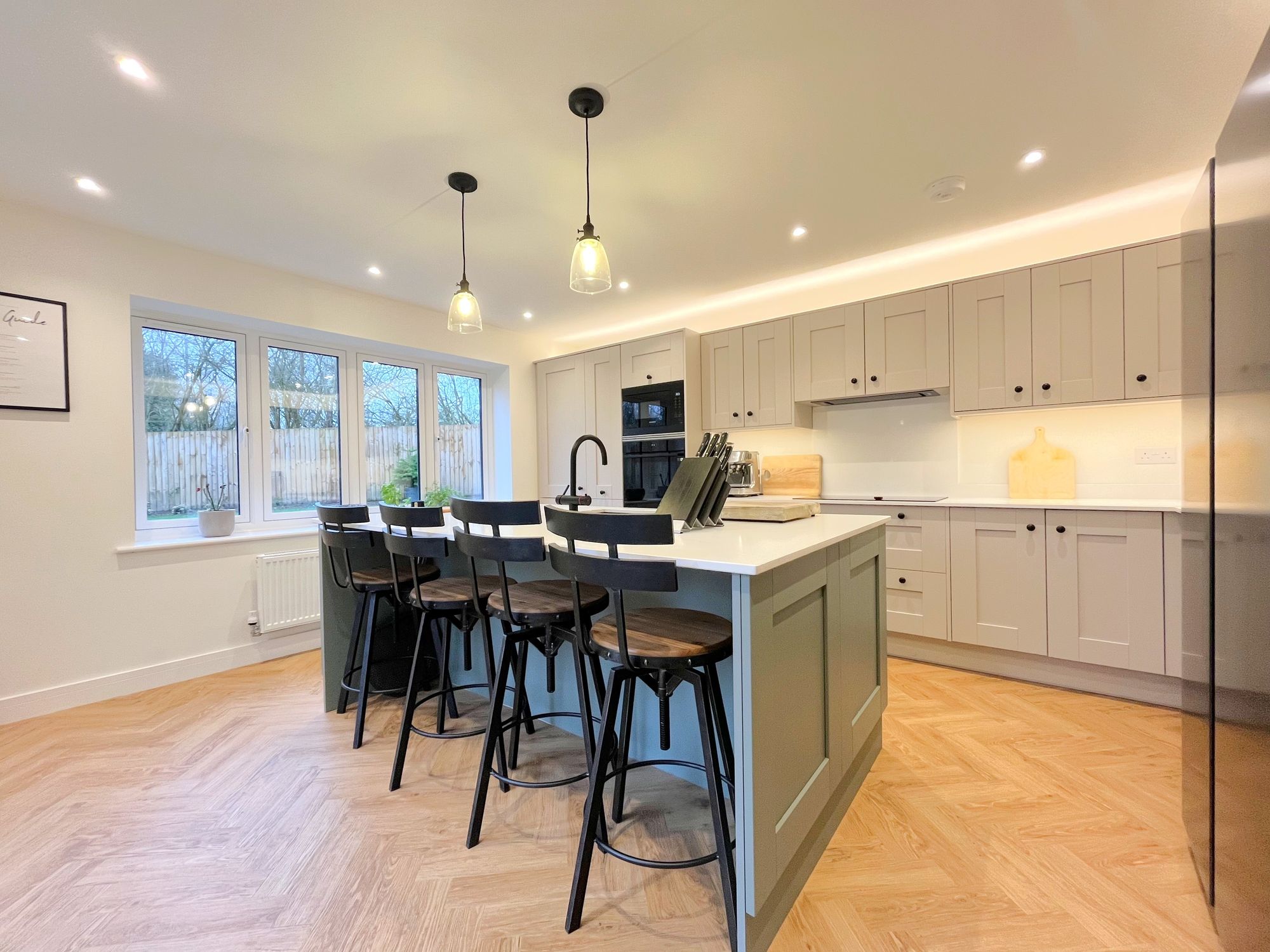 On the ground floor there are two reception rooms, a dining room and separate large kitchen with centrepiece island and utility room. The kitchen is impressively finished with Samsung Appliances including a smart oven with dual temperatures, smart dishwasher, 5 ring induction hob and american style fridge freezer. Other kitchen features include a boiling water tap in the island unit, pantry cupboard, wine cooler, recycling drawers and quartz worktops. Doors opening from both kitchen and sitting room onto the garden patio.