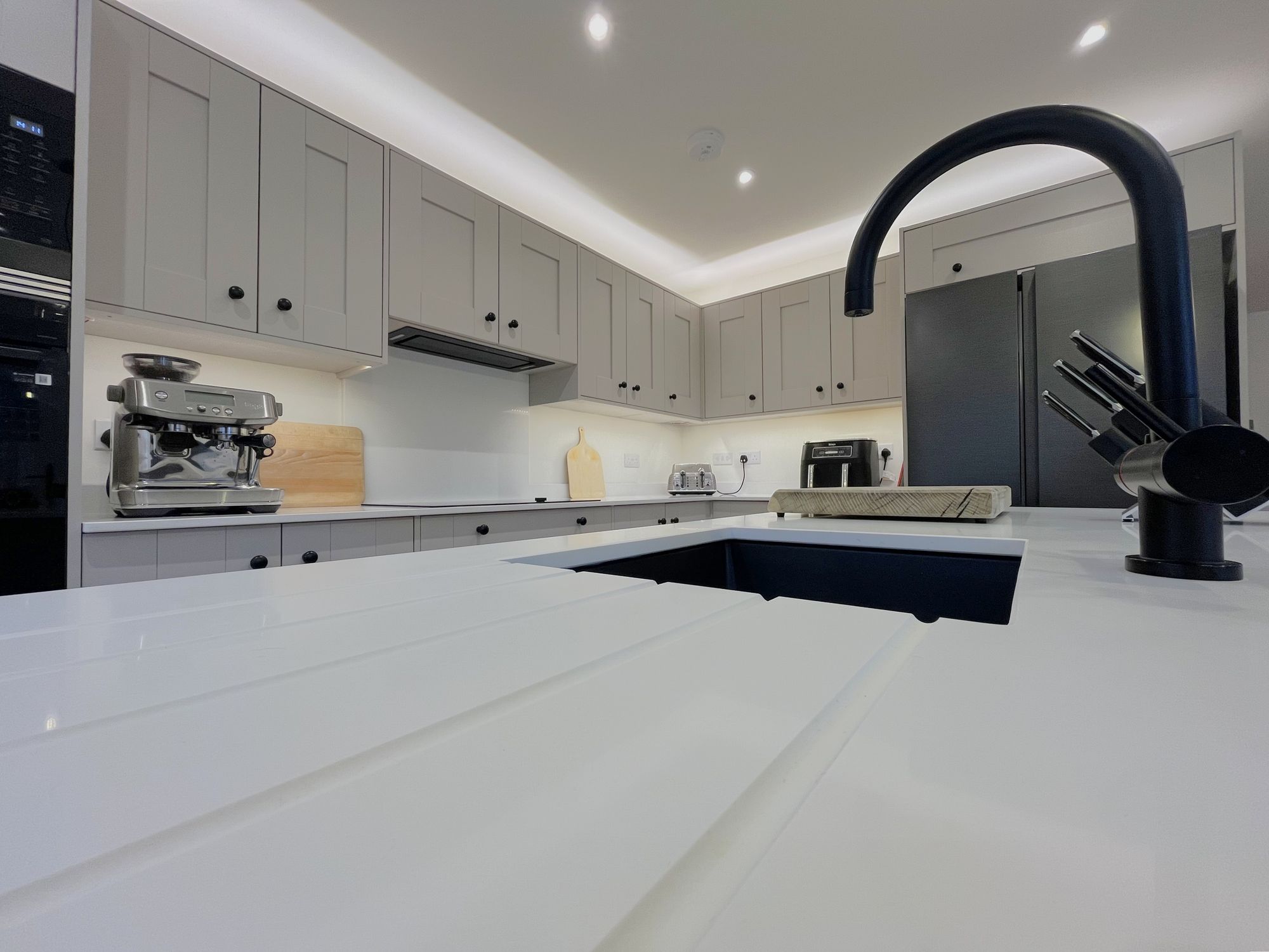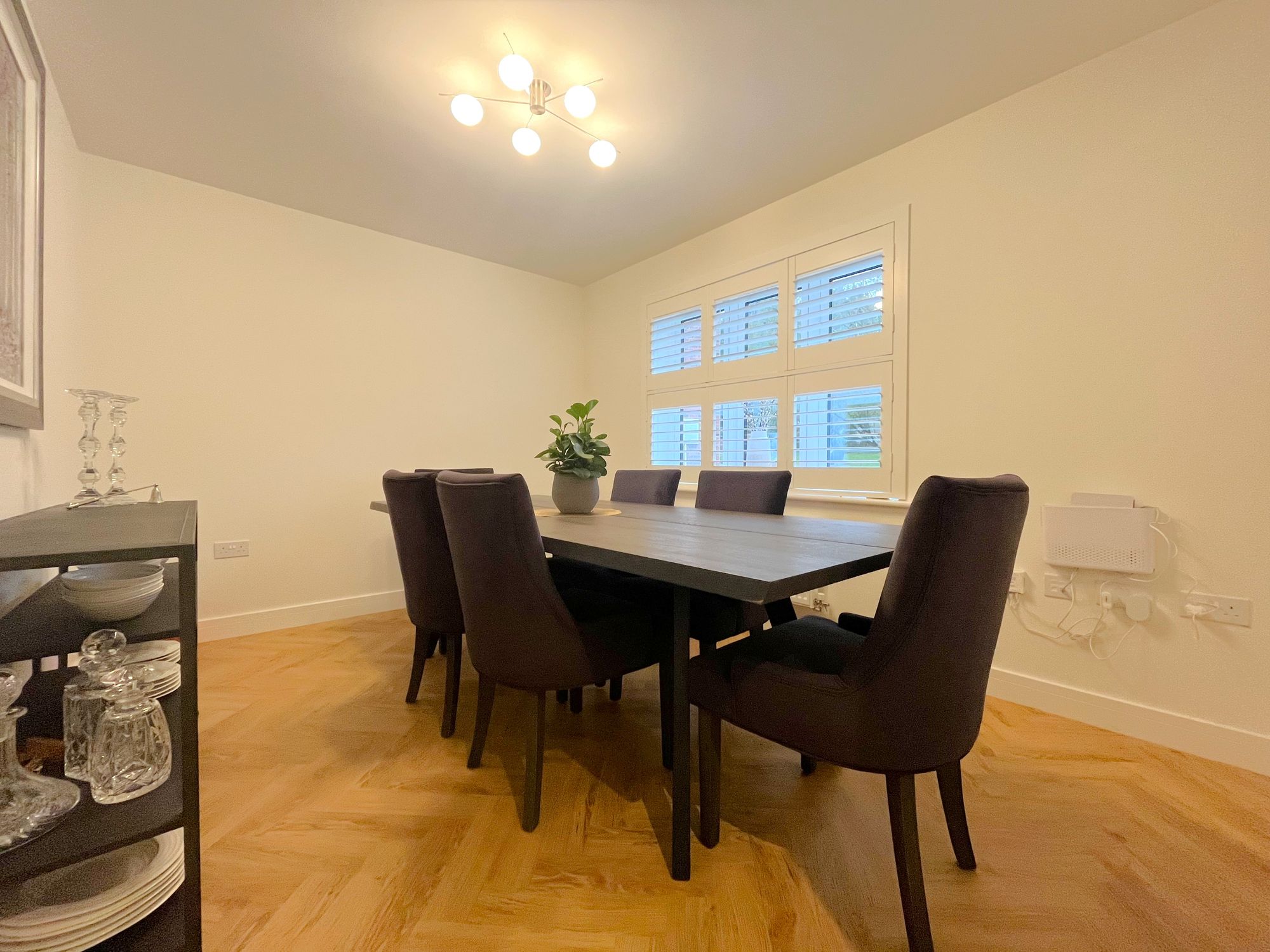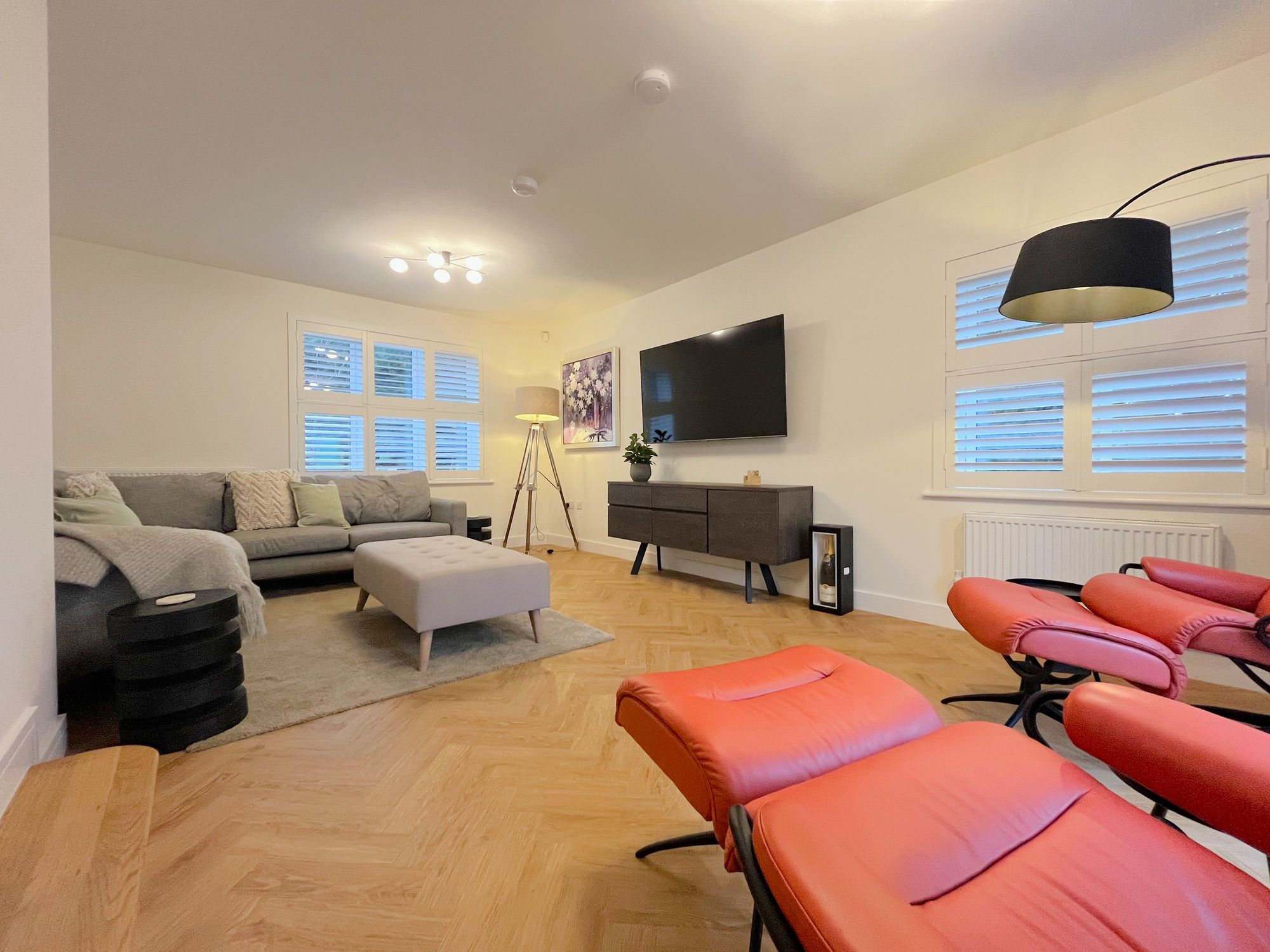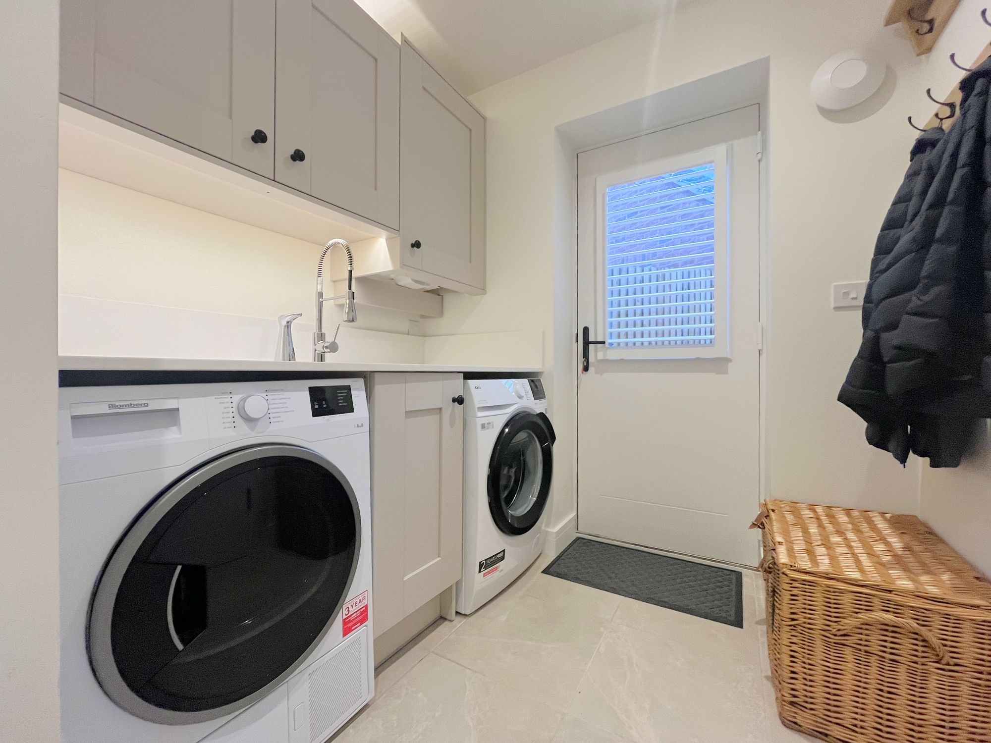 On the ground floor there are two reception rooms, a dining room and separate large kitchen with centrepiece island and utility room. The kitchen is impressively finished with Samsung Appliances including a smart oven with dual temperatures, smart dishwasher, 5 ring induction hob and american style fridge freezer. Other kitchen features include a boiling water tap in the island unit, pantry cupboard, wine cooler, recycling drawers and quartz worktops. Doors opening from both kitchen and sitting room onto the garden patio.