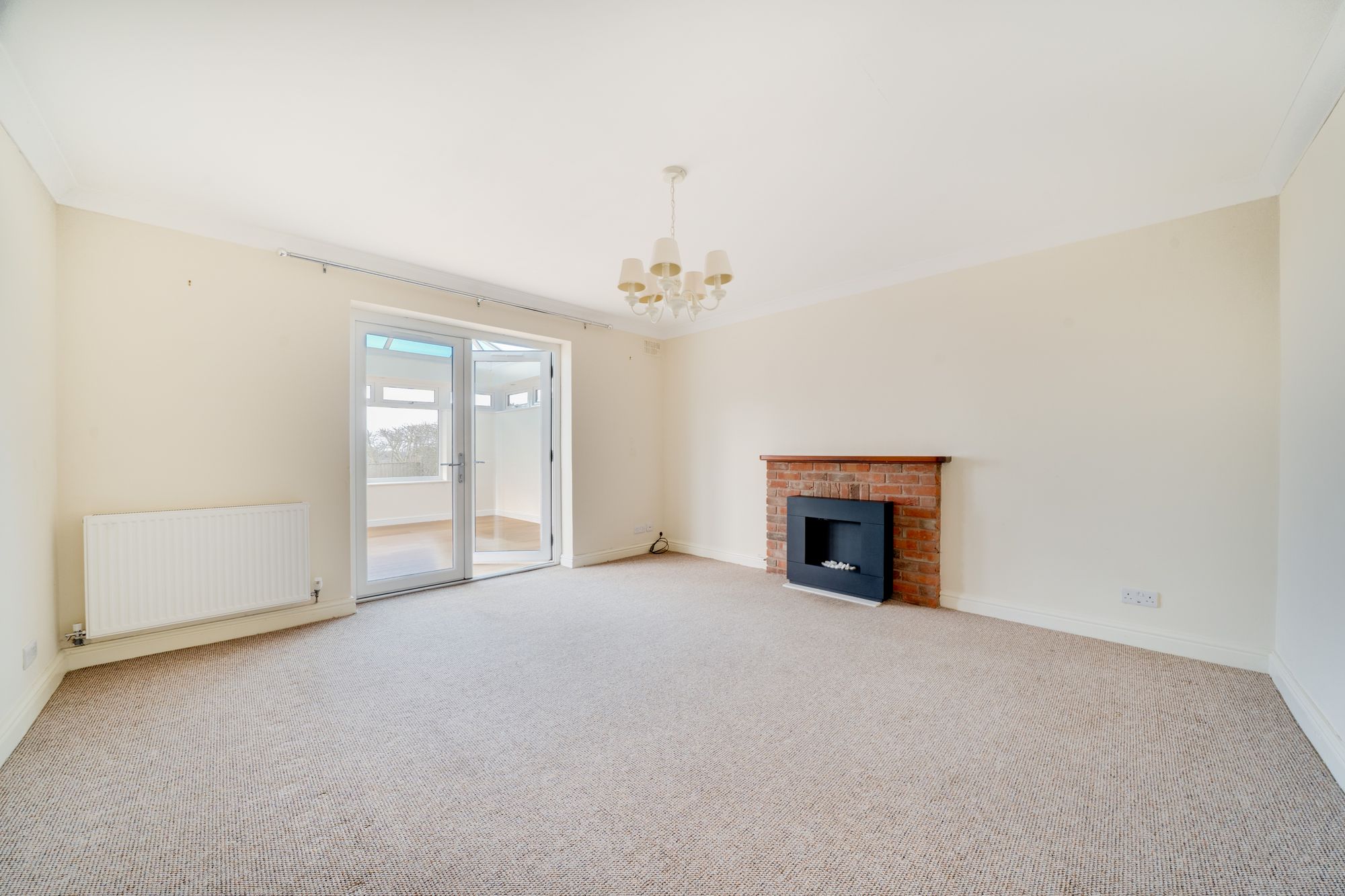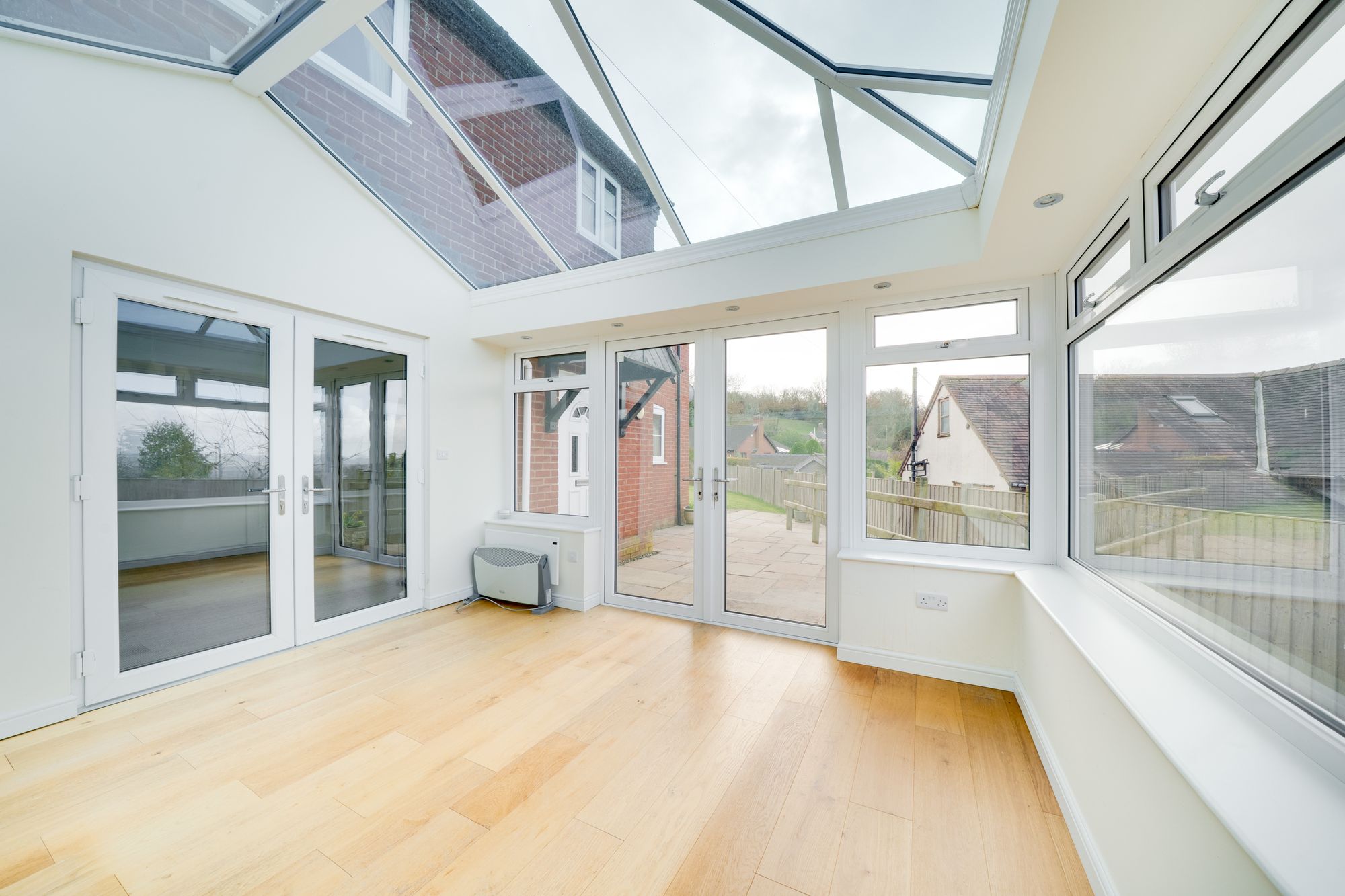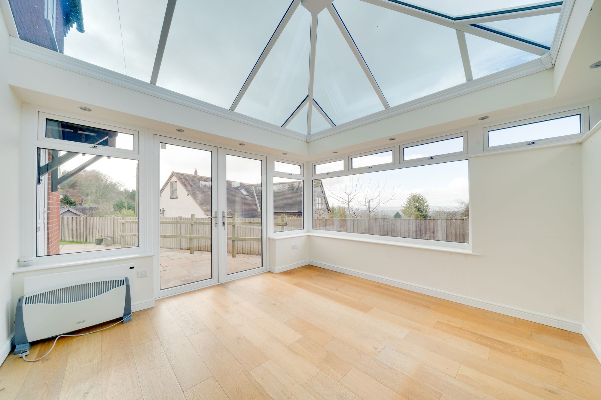 The main living room is a comfortable and well-proportioned space, centred around a feature fireplace, creating a natural focal point. Double doors open through to the conservatory, enhancing the sense of space and flow. The conservatory itself is a standout feature, with a glazed roof and wraparound windows maximising light and enjoying uninterrupted views across the garden and surrounding countryside. French doors lead directly onto the rear terrace, ideal for entertaining and outdoor living.