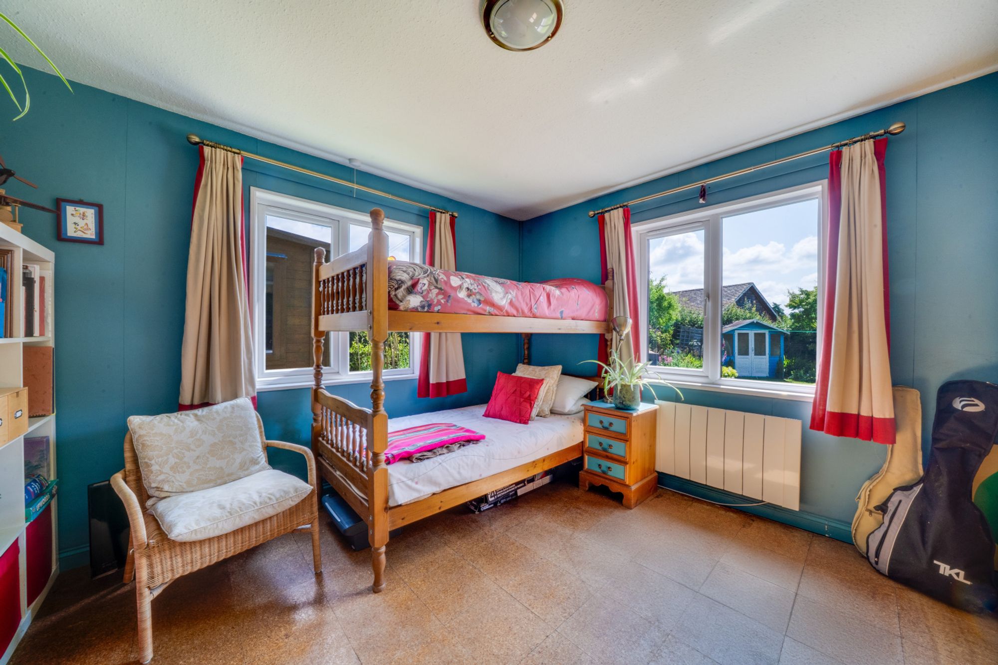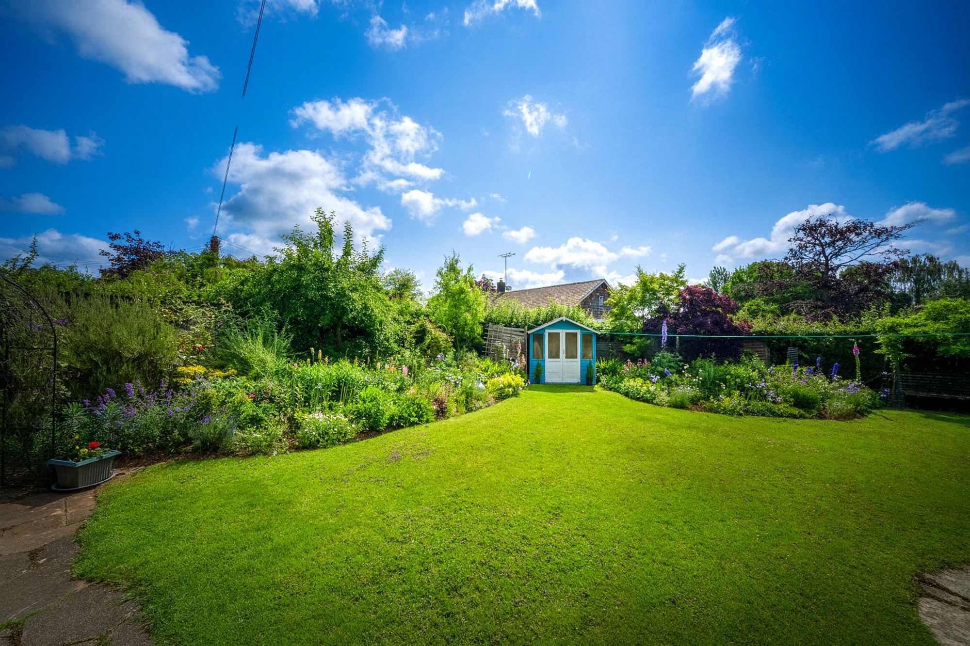 The rear garden has been thoughtfully landscaped to offer a variety of spaces to enjoy. It is predominantly laid to lawn with deep, well-stocked flower borders bursting with colour. To one side, a summerhouse sits amongst vibrant planting, offering a peaceful spot to sit and enjoy the surroundings. A greenhouse and productive kitchen garden lie to the rear, ideal for keen gardeners wishing to grow their own fruit and vegetables. There is also a paved area seating area, ideal for entertaining. Well-enclosed by mature hedging and planting, the garden enjoys a good degree of privacy. In addition to the main garden, the side area includes a insulated log cabin—currently used as a music room— but offers excellent versatility for hobbies or further storage as needed.
