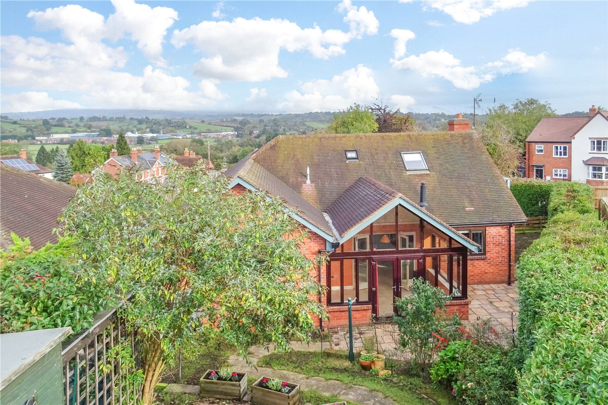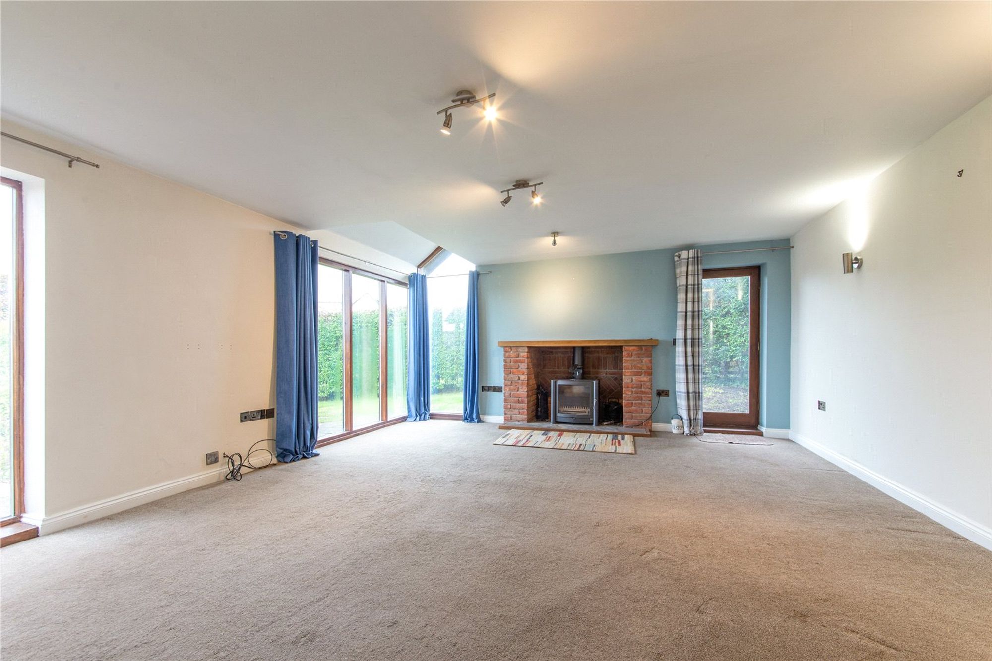 A pathway leads to the front entrance, where you step into a welcoming tiled reception hall. To the left, a bright and airy living room features a striking red brick fireplace with a wood-burning stove, highlighted by herringbone detailing and a rustic wooden beam. Large, full-length windows flood the room with natural light, while a glazed door provides convenient side access.