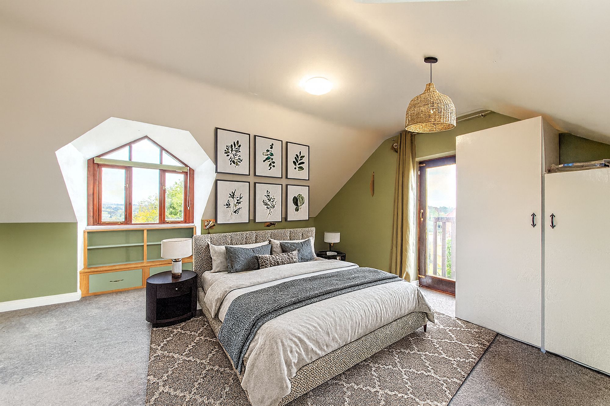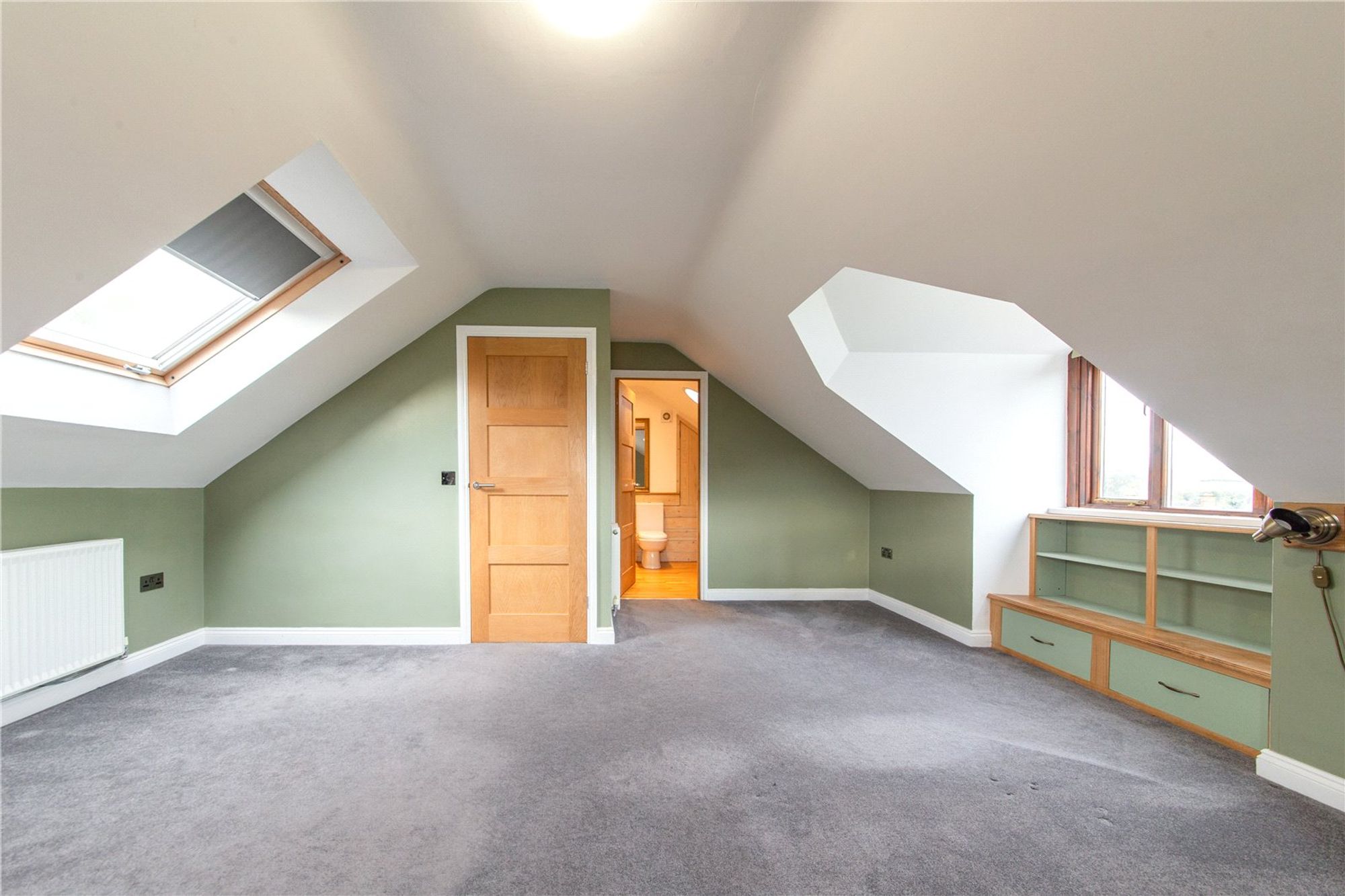 The first floor, accessed via a charming spiral staircase, is dedicated to the principal suite. This spacious bedroom benefits from eaves storage, a large window with built-in shelving, and French doors leading to a Juliet balcony. A generous storage area doubles as a dressing room, while the ensuite shower room is equipped with a WC, hand basin, and a walk-in shower.