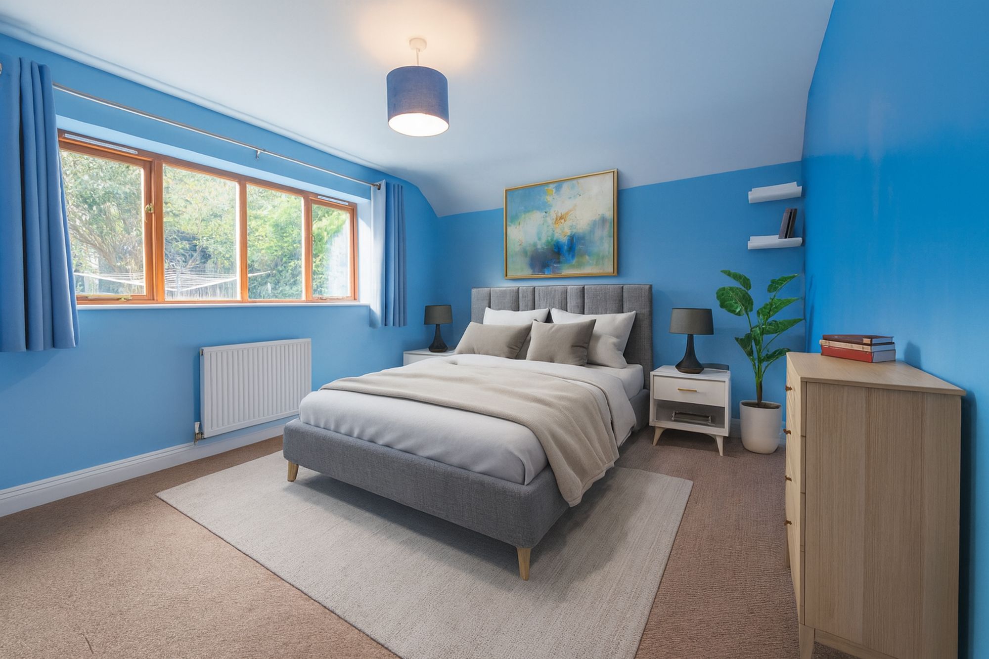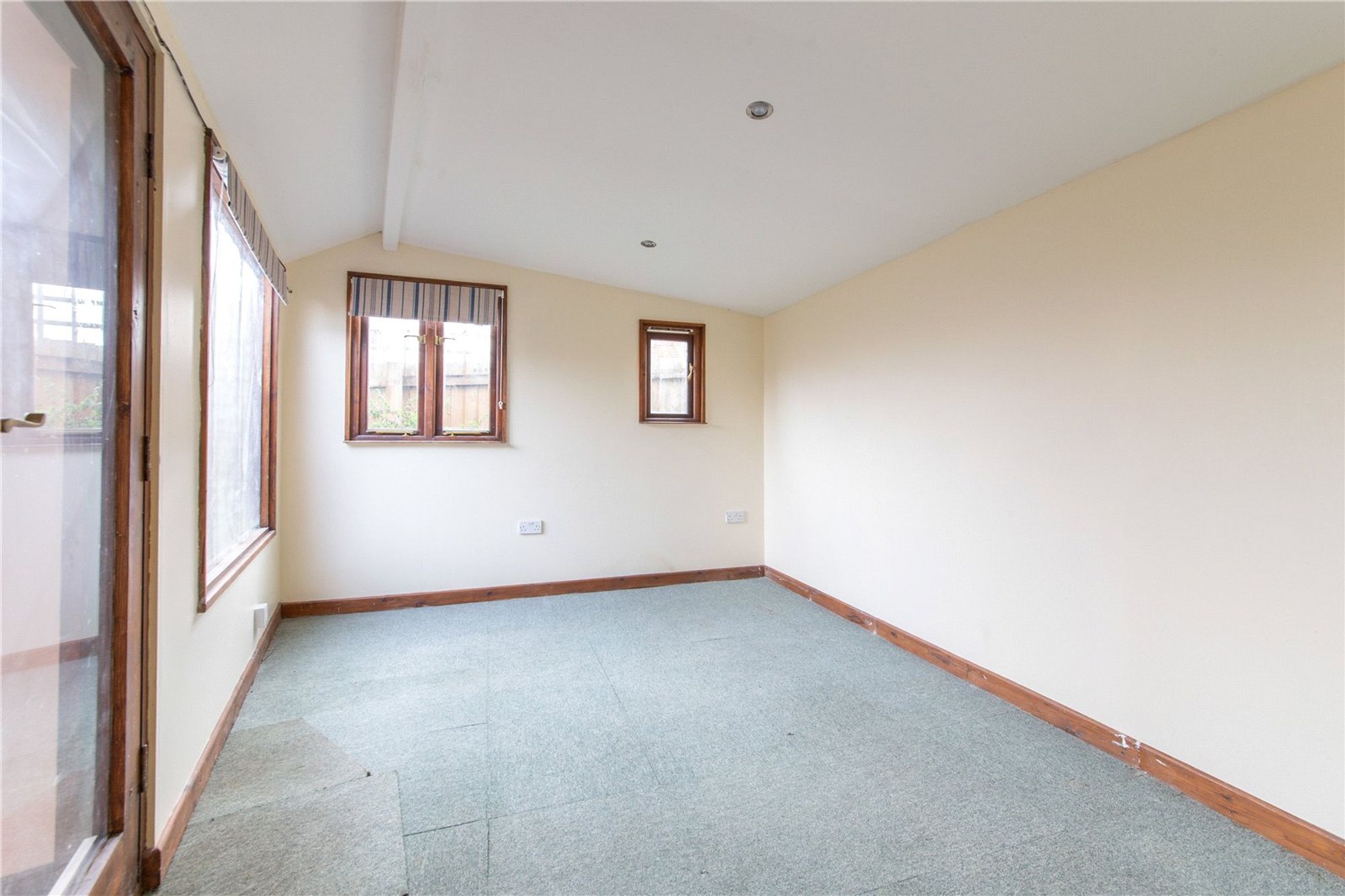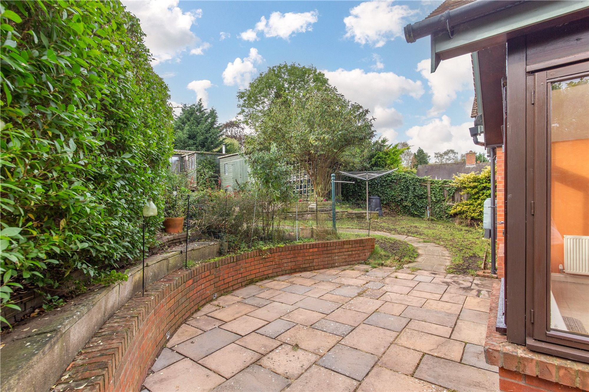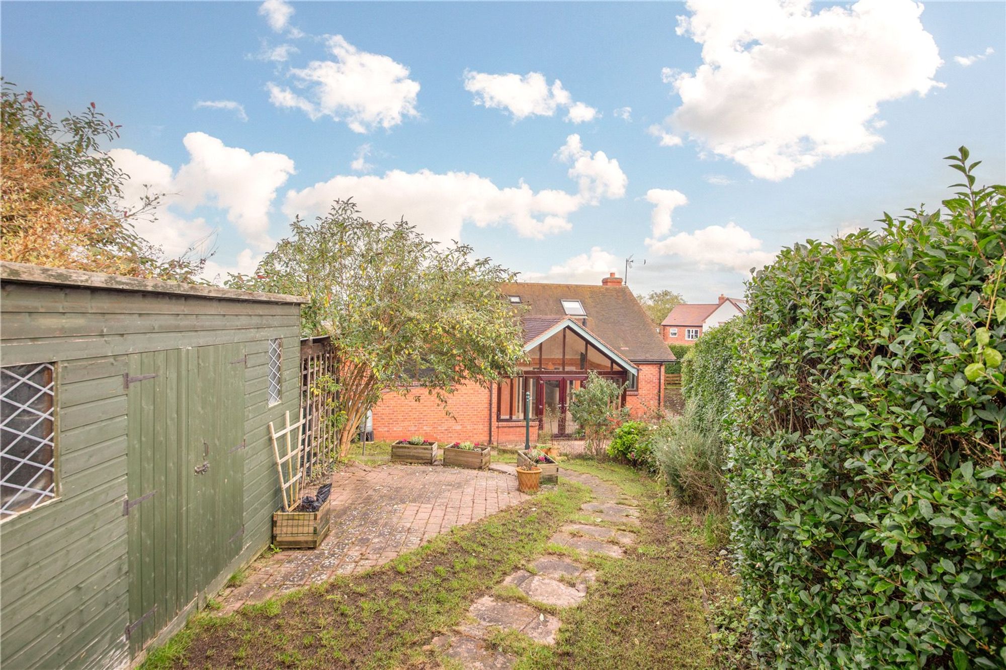 Outside, the enclosed garden provides a tranquil retreat, featuring a paved seating area framed by a curved low-level brick wall. A meandering path leads through the lawn to a spacious garden room/office, which is glazed Is divided into two separate workspaces. This versatile outbuilding is ideal for a home office, games room, studio, or gym. A second shed is nestled within the mature gardens, which are bordered by shrubs and hedges. Additionally, a separate lawned area to the side of the property offers further versatile outdoor space, complete with its own gated access and suitable for a shepherd’s hut and summerhouse.