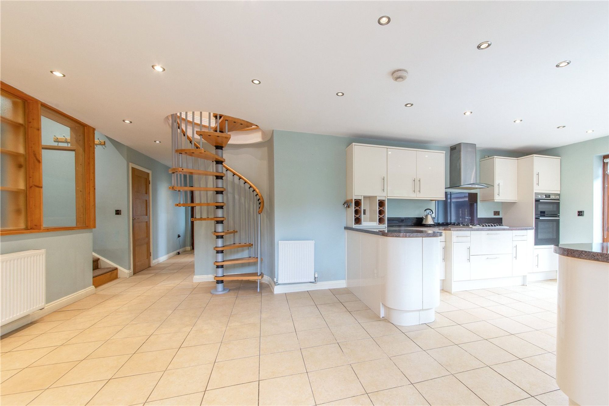 To the right of the entrance, a staircase descends to the garage/workshop and additional storage space, while a spiral staircase ascends to the first floor.