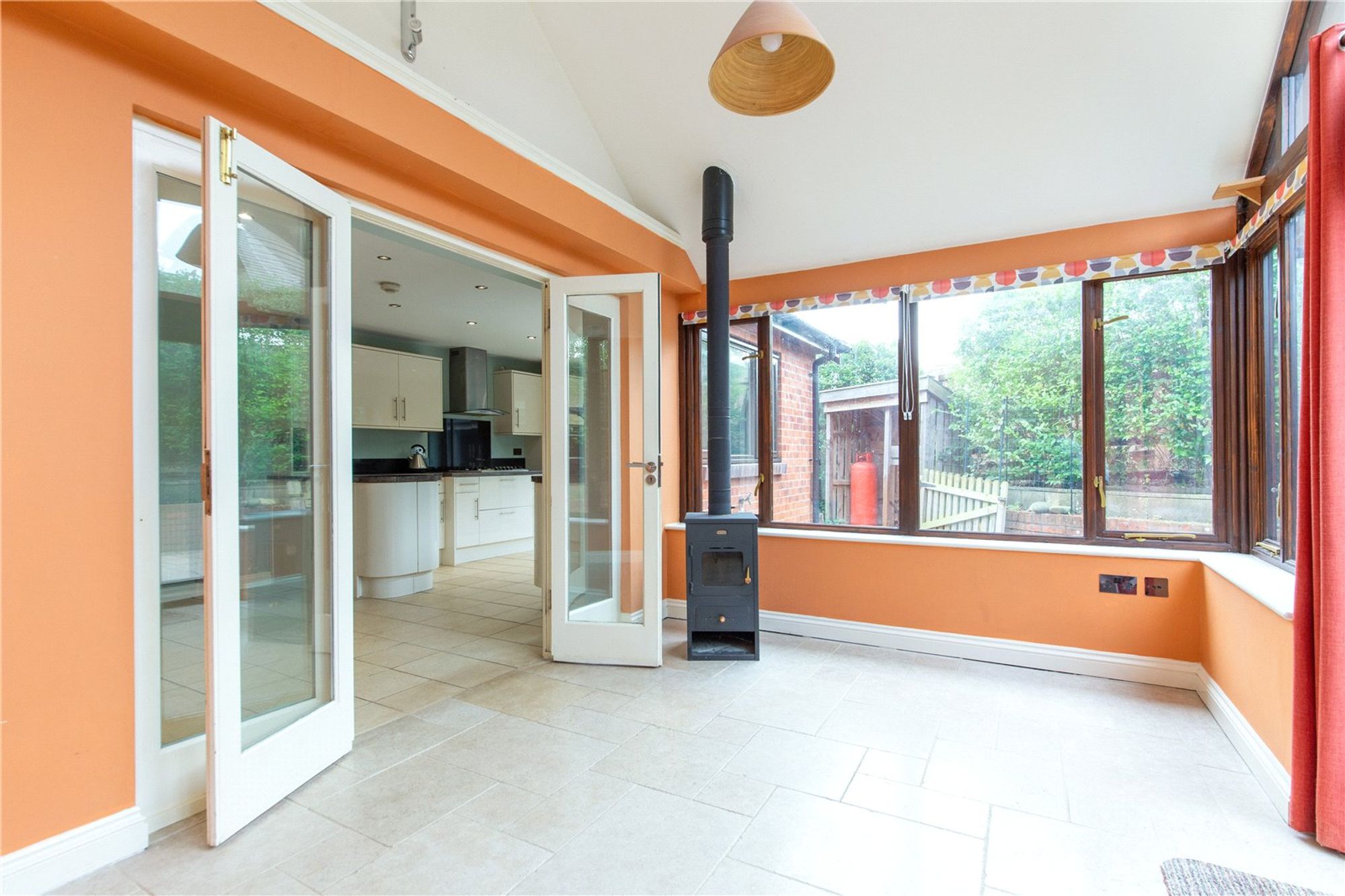 At the heart of the home lies the well-appointed kitchen, fitted with cream wall and base units, laminate work surfaces, a stainless-steel LPG gas hob with extractor, an inset oven, and an integrated fridge freezer and dishwasher. A breakfast bar offers additional seating, while ample space is available for a large dining table. The kitchen has direct access to the garden, and double doors lead into the conservatory, a bright and inviting space with underfloor heating and a wood-burning stove. French doors open onto the garden, creating a seamless connection between indoor and outdoor living.