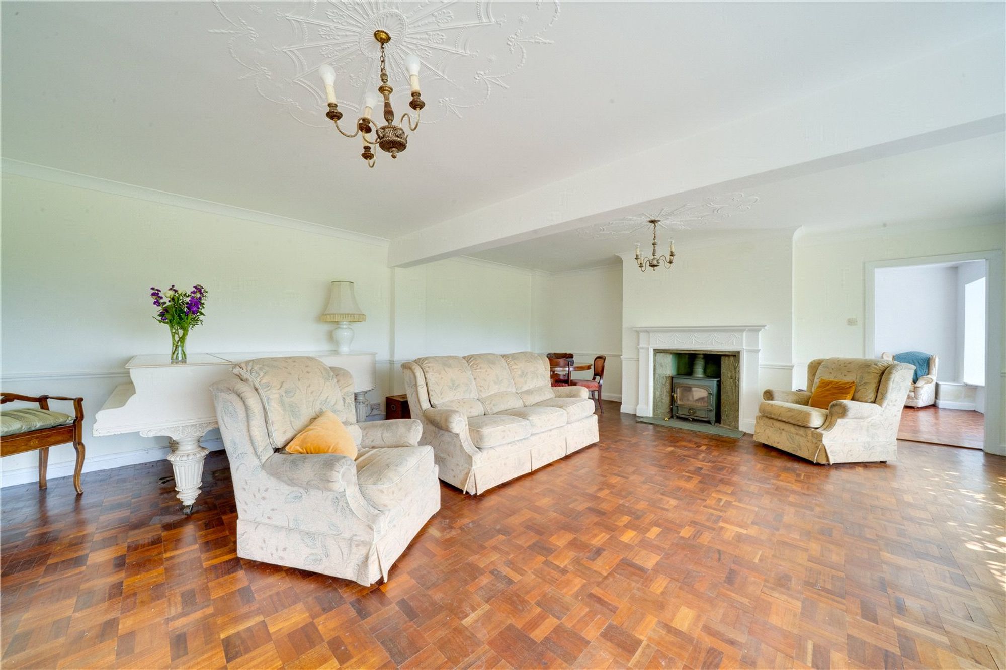 A door to your right from the hallway leads you into the incredibly spacious living room with two large windows looking out over the view and open countryside beyond. This elegant space features intricate ceiling mouldings and a wood-burning stove set within a period-style fireplace.