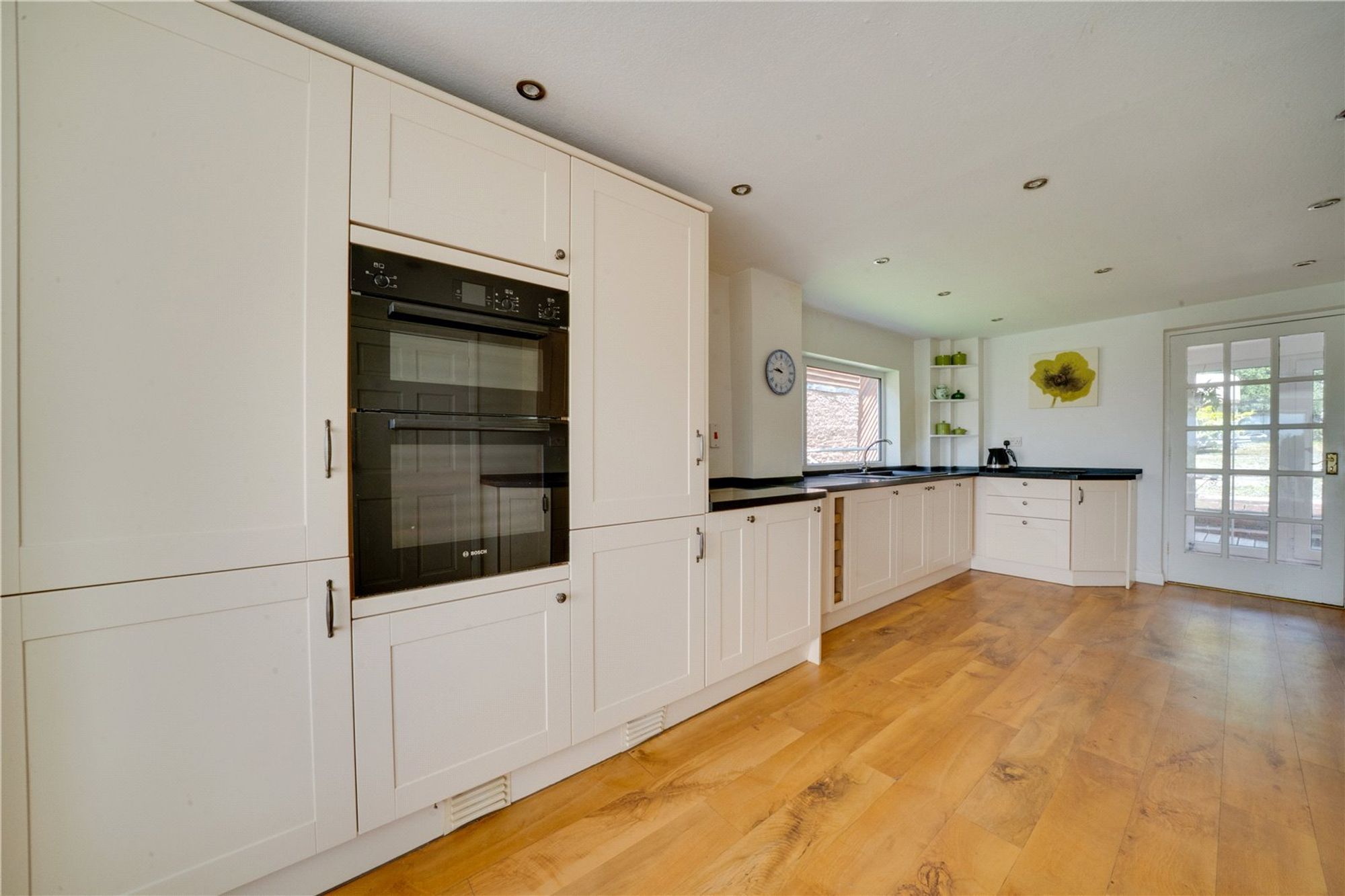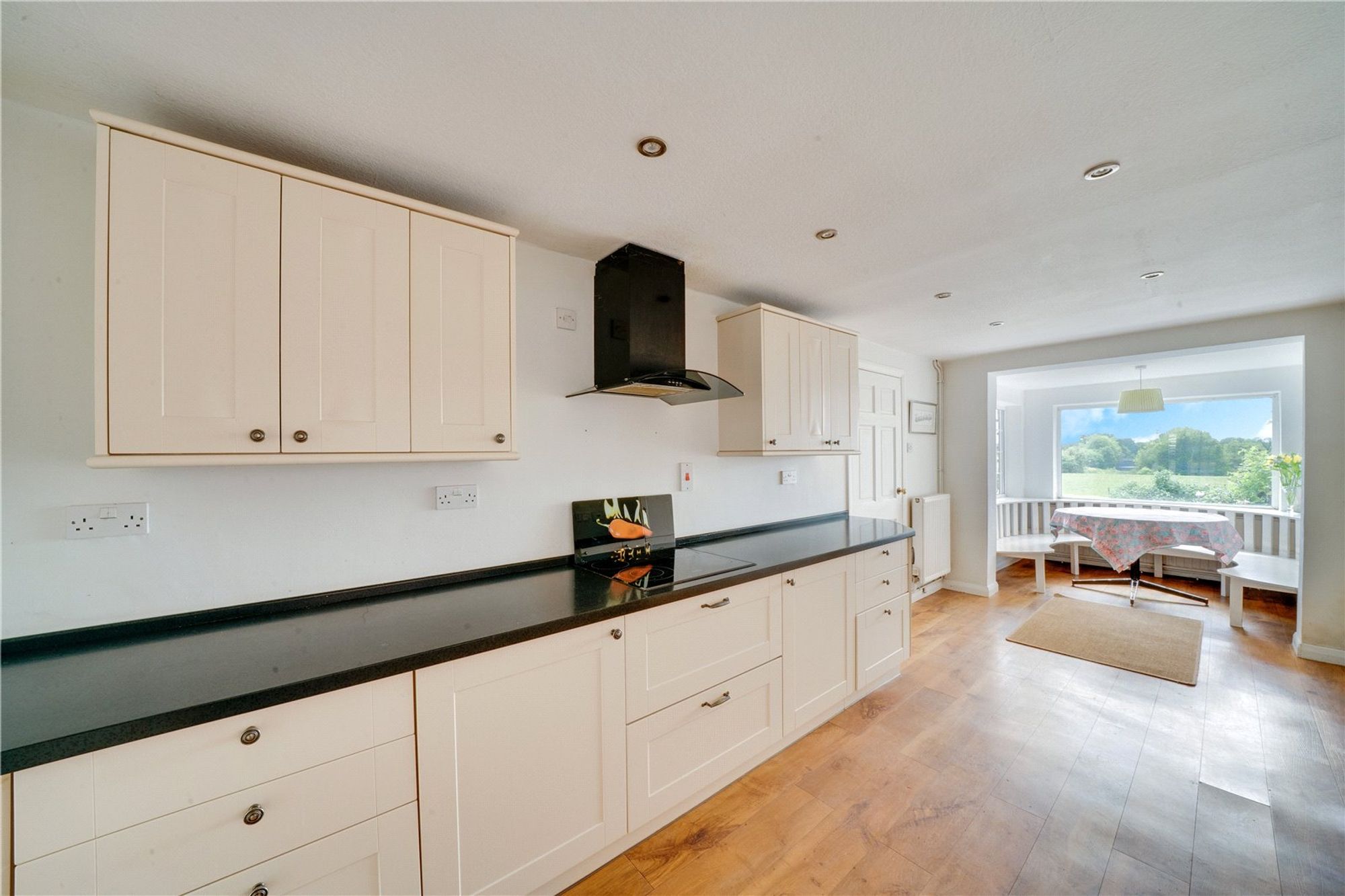 To the other end of the home is the fantastic kitchen/breakfast room. It has been fitted with an excellent range of base and wall units, offers plenty of worktop space and has integrated appliances including a double oven, hob with extractor over, fridge freezer and dishwasher. There is a lovely eating area to one end of the kitchen with built-in seating and a large window looking across the garden and paddocks – an exceptional everyday dining space framed by green views.