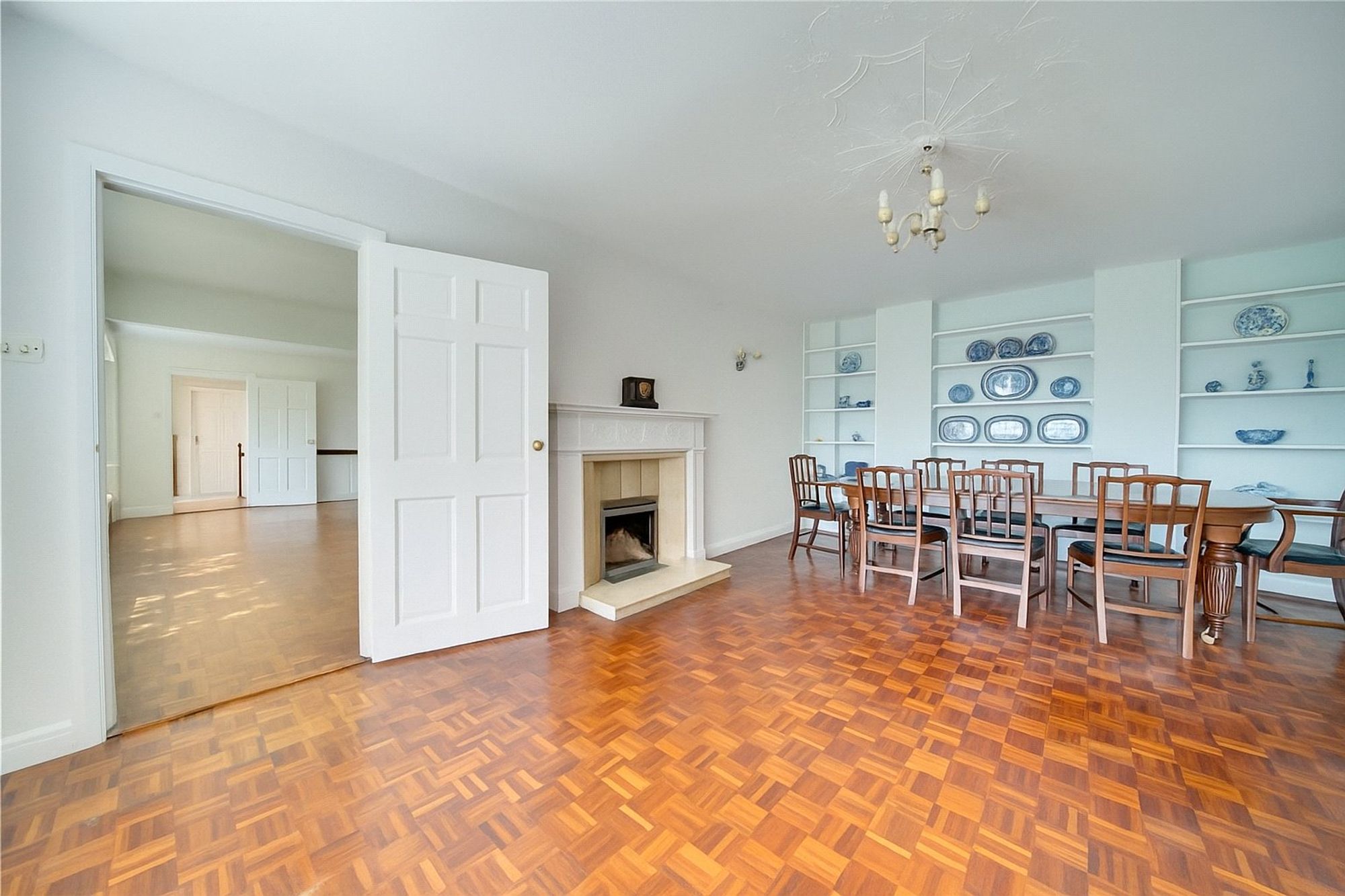 Beyond the living room is the second reception room, currently used as a dining room, again with the parquet flooring. There is bespoke shelving, window looking out over the view and an open fireplace.