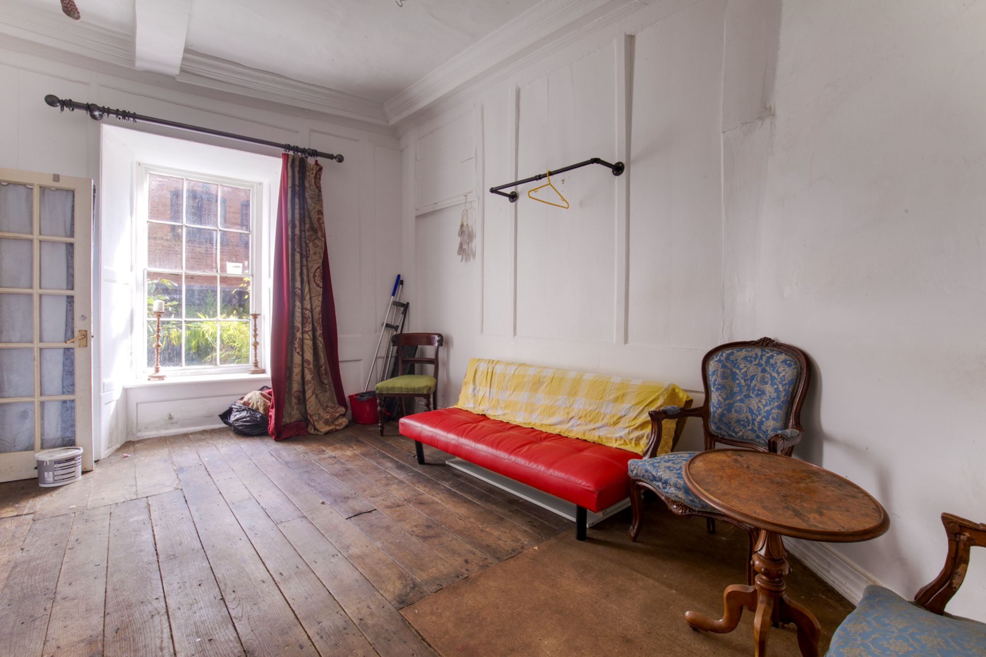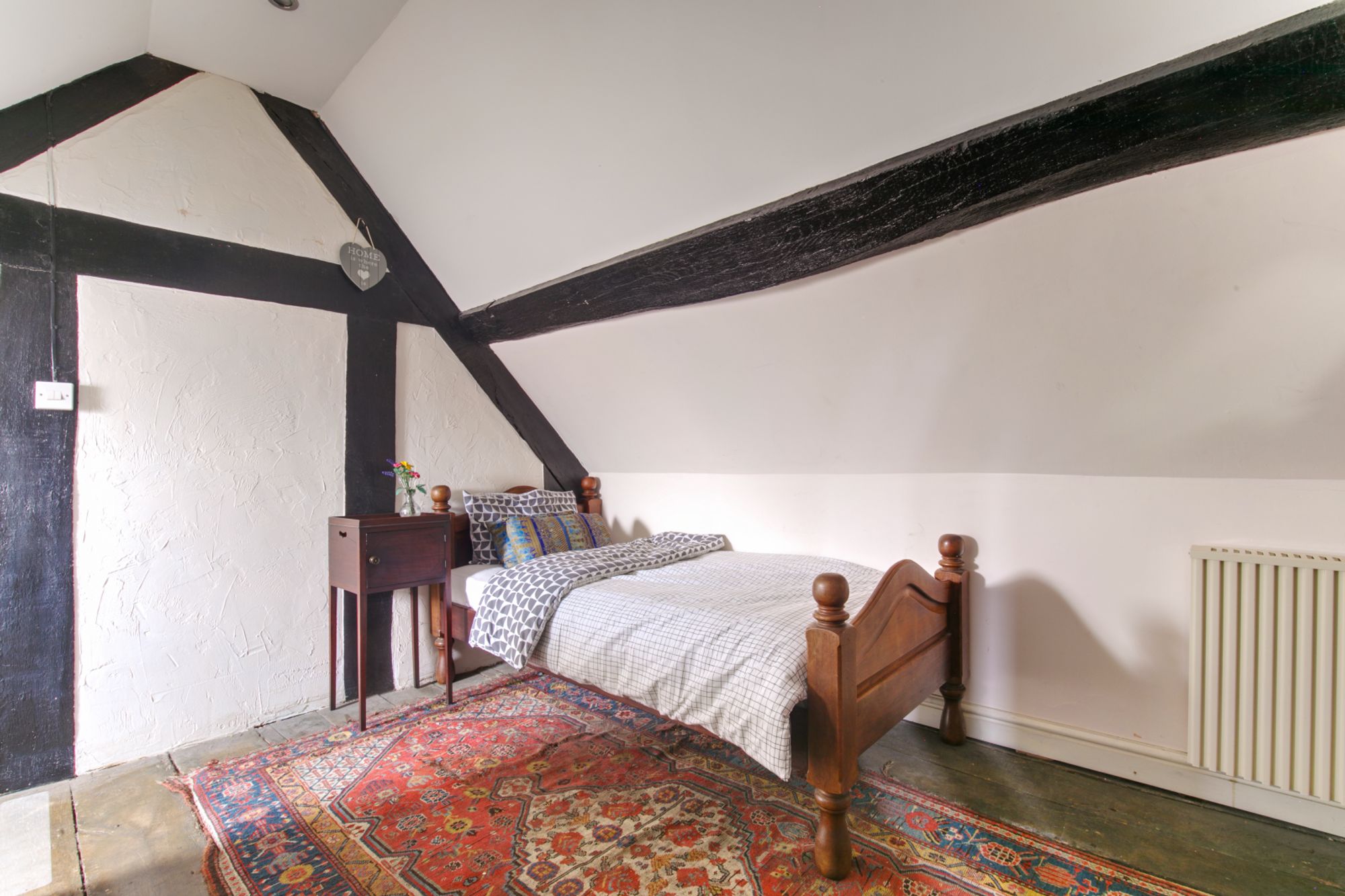 The principal bedroom occupies the first floor, a generous double room with a large sash window overlooking the square. The room features exposed ceiling timbers and sloping walls, giving a wonderful sense of character and history.