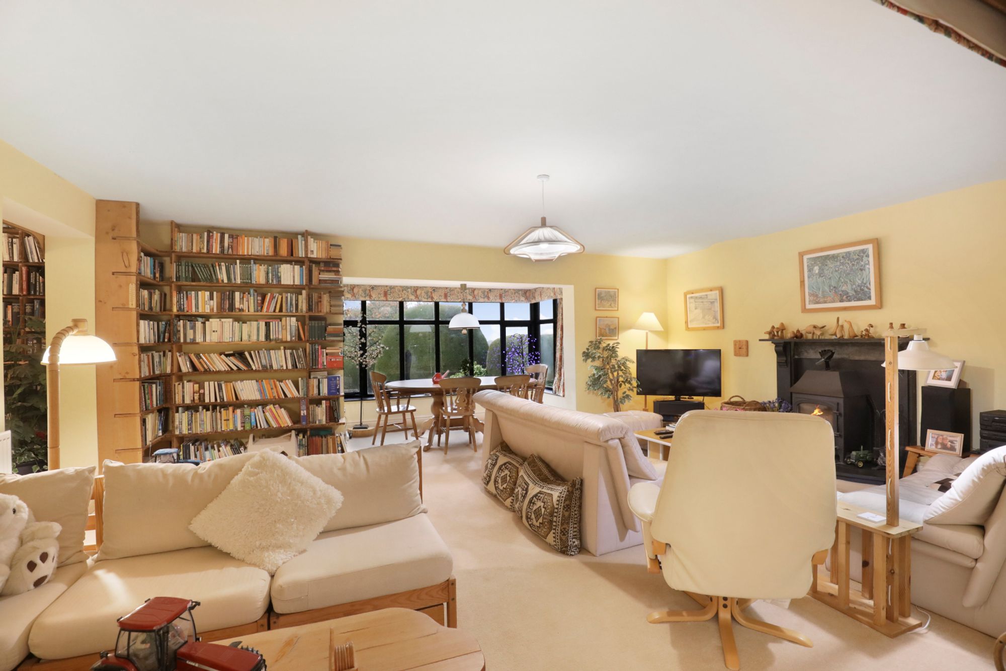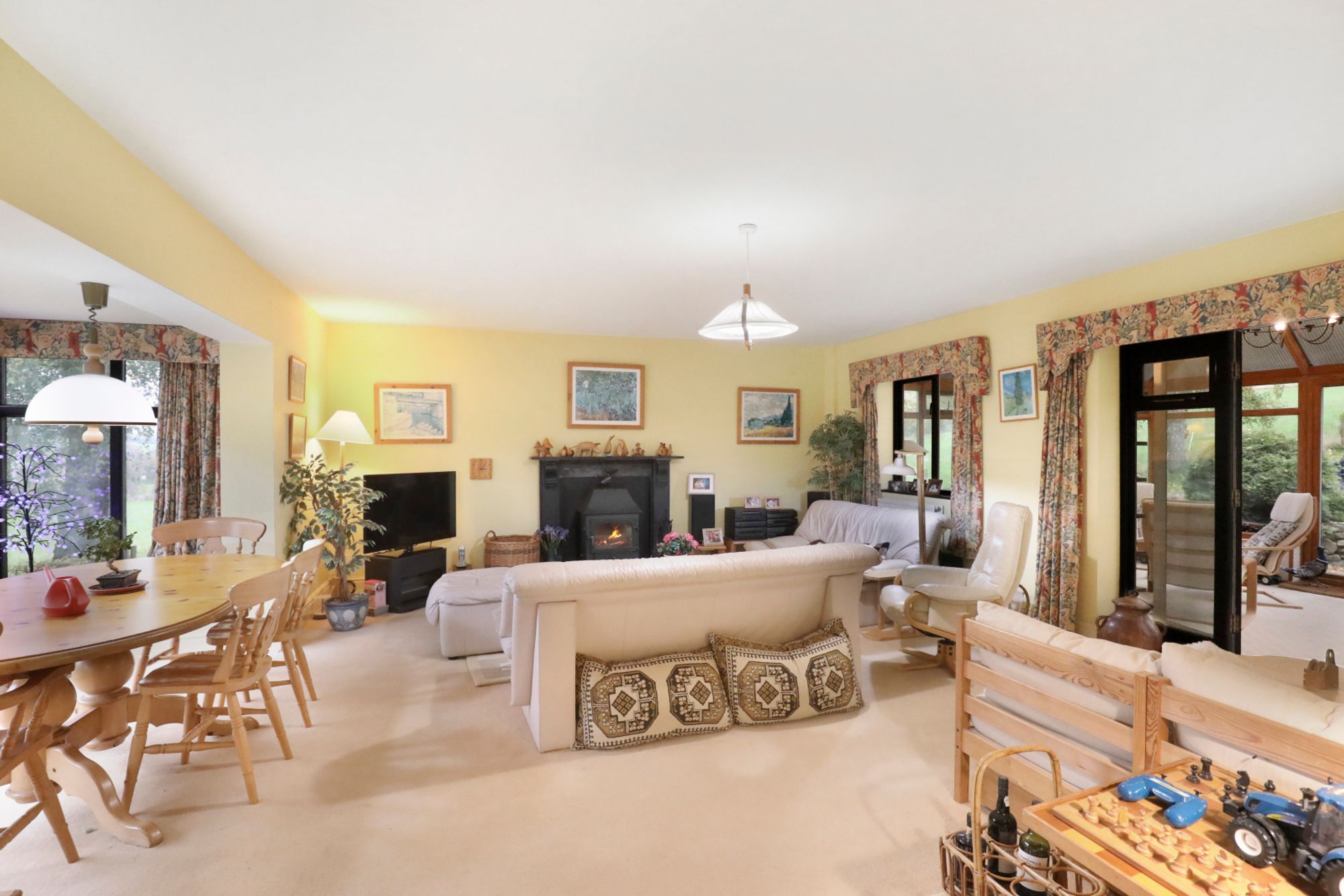 Entering Oak Lodge, you’re welcomed into a central hallway that sets the tone with its inviting warmth and traditional features. To the right is the spacious living room with a central wood-burning stove framed by a rustic stone fireplace. Exposed beams overhead enhance the room’s cosy charm, while the many windows provide lovely views over the surrounding gardens and fields, filling the room with natural light and creating a sense of connection with the outdoors.
