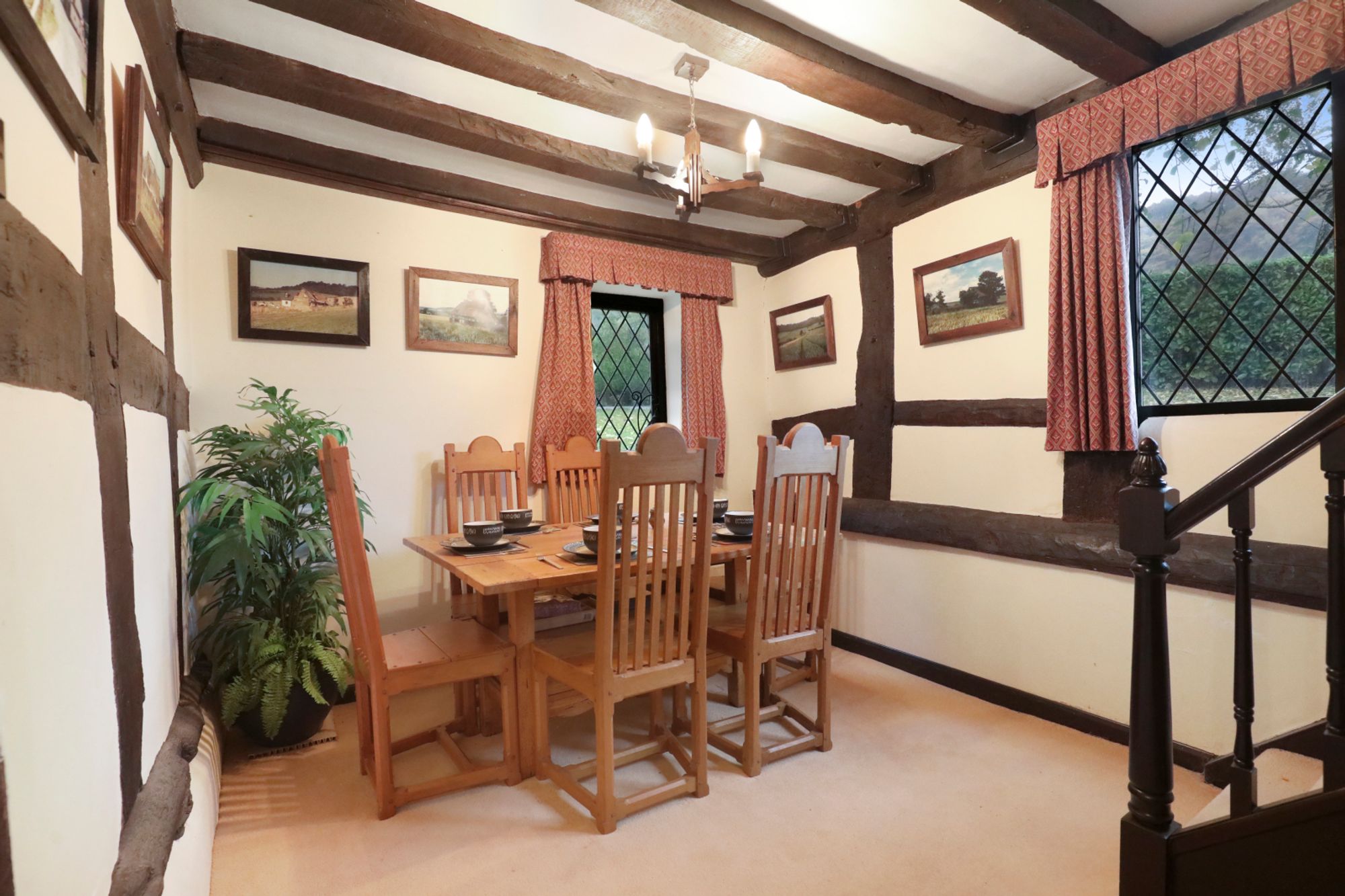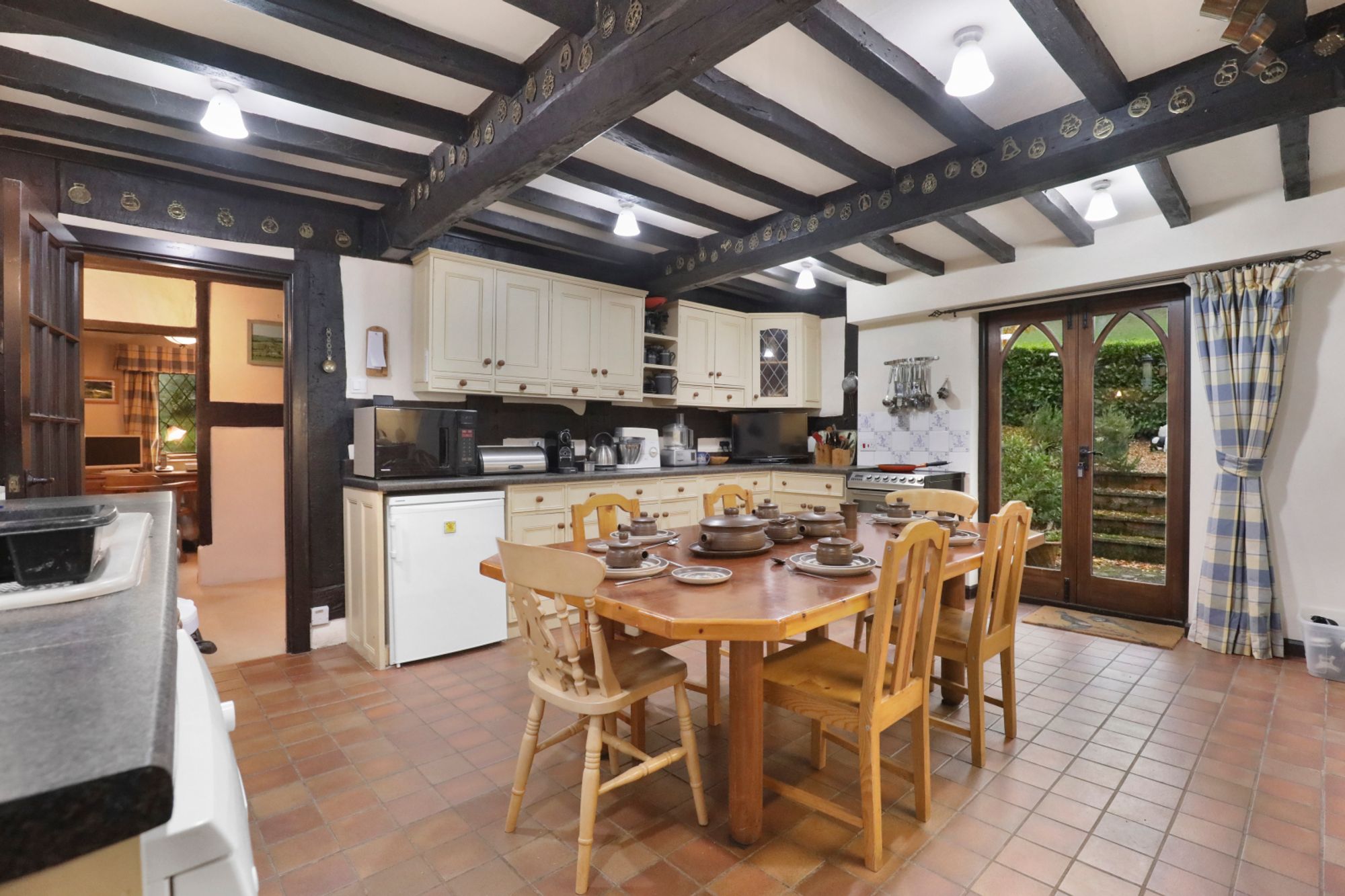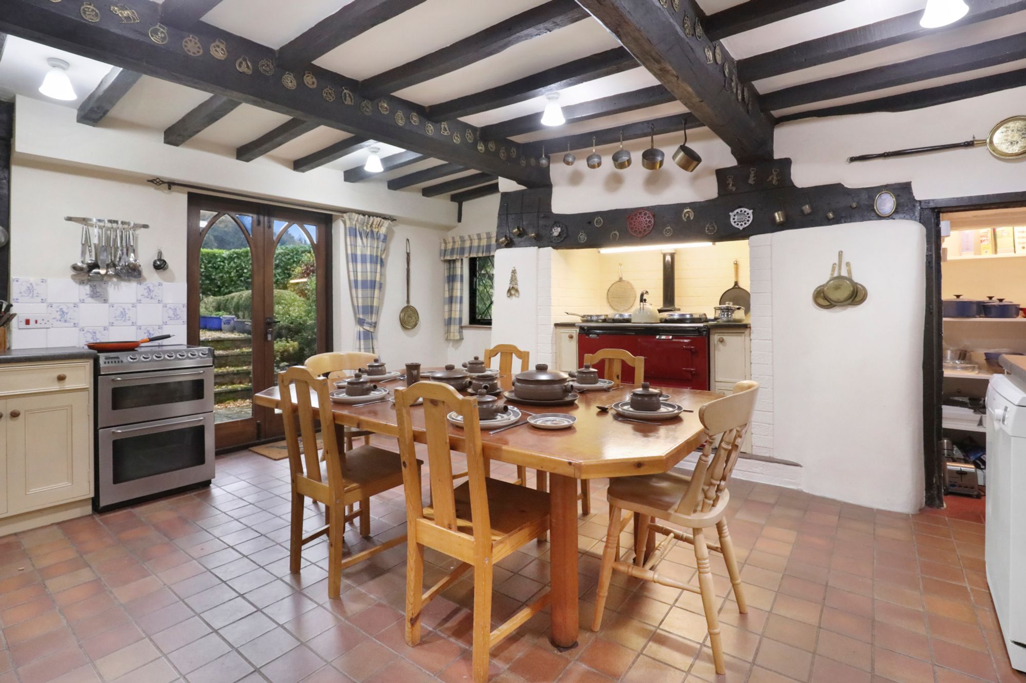Next to the kitchen is the dining room, a welcoming space that radiates rustic charm. Exposed wooden beams and traditional leaded windows frame this room, which easily accommodates a large table.