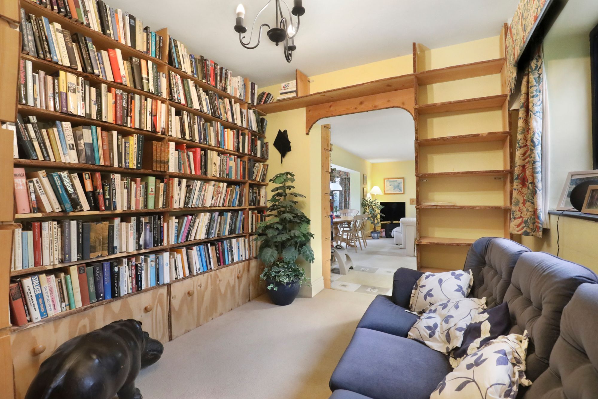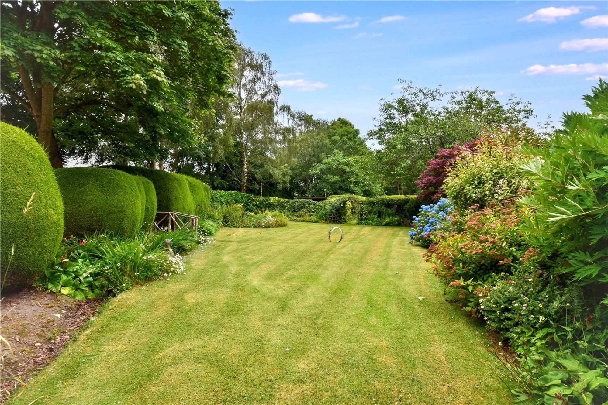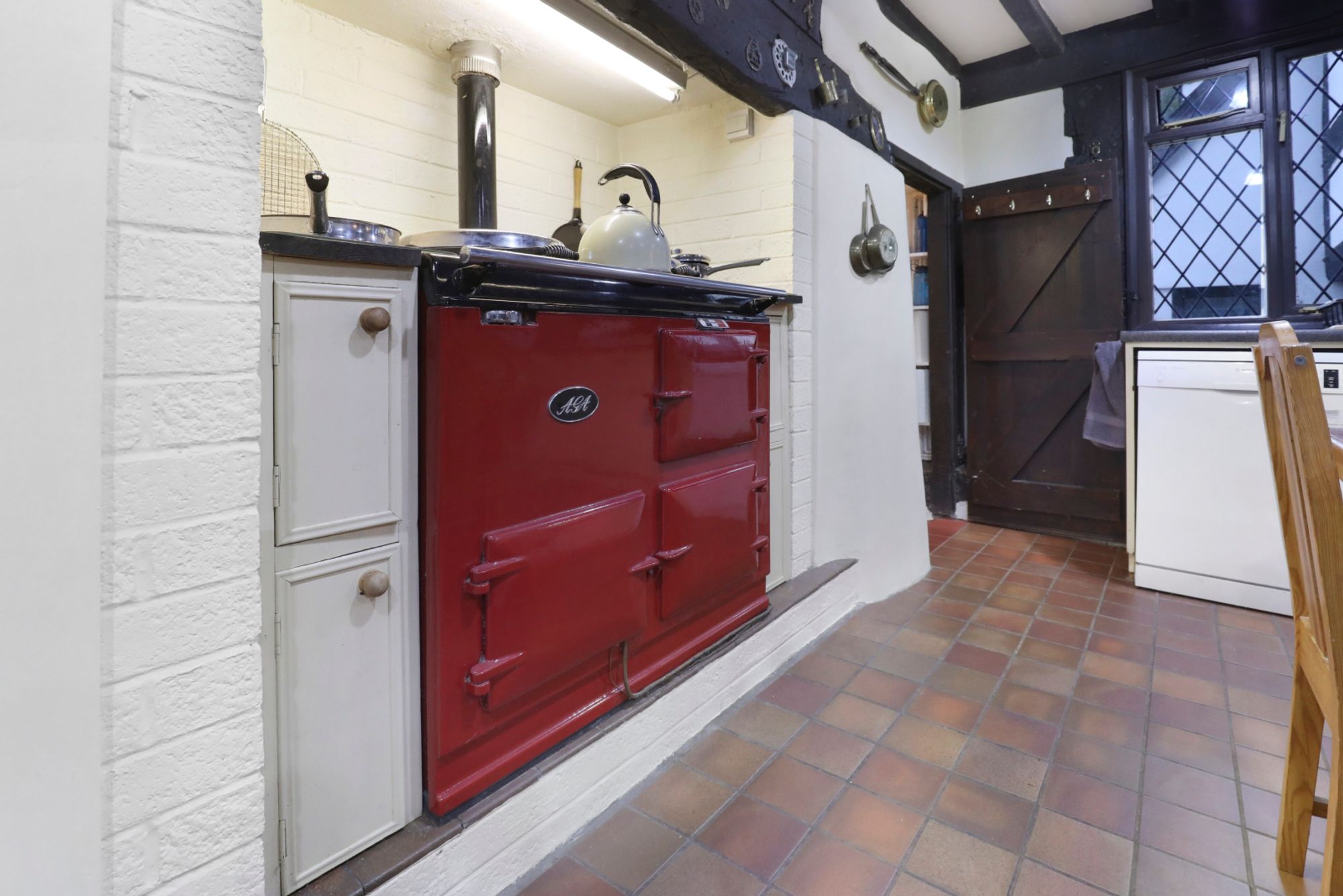 The kitchen is designed in a classic farmhouse style, featuring warm wooden cabinetry, a range of fitted units, and an impressive Aga. A separate freestanding oven and hob add to the kitchen’s functionality, while a convenient pantry area provides extra storage. French doors lead directly from the kitchen to the garden, seamlessly blending indoor and outdoor living.