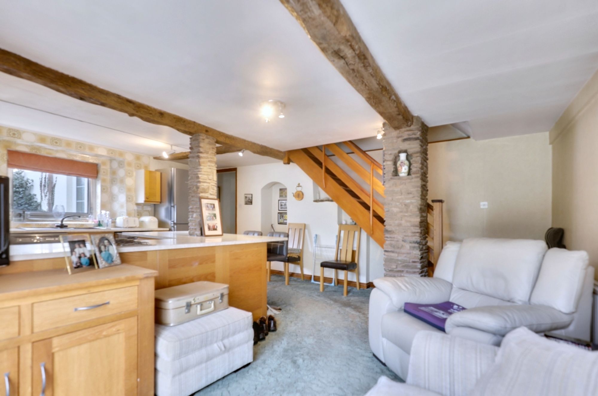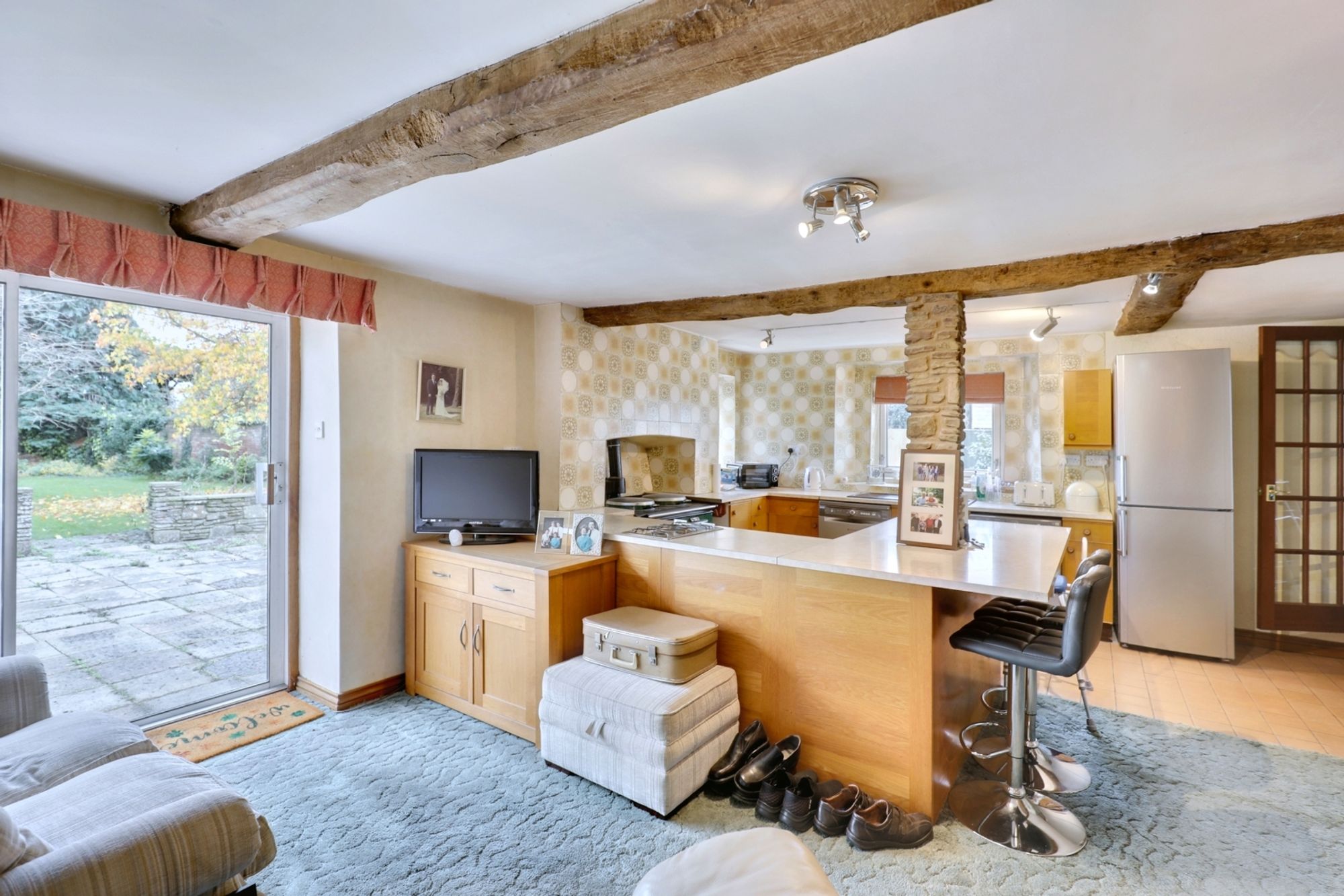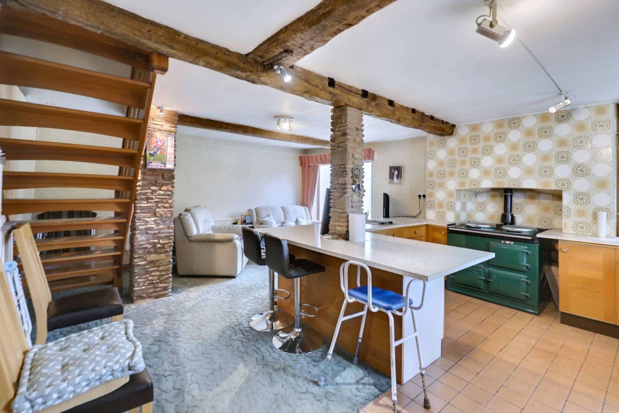 At the heart of the home is the expansive kitchen and family room. This beautifully designed space features a well-appointed kitchen with a central island, a striking green Aga, and generous counter space. Exposed beams and rustic stone details add charm, while sliding glass doors open onto the rear patio, offering easy access to outdoor entertaining areas. The cosy seating area within this space enhances its versatility.