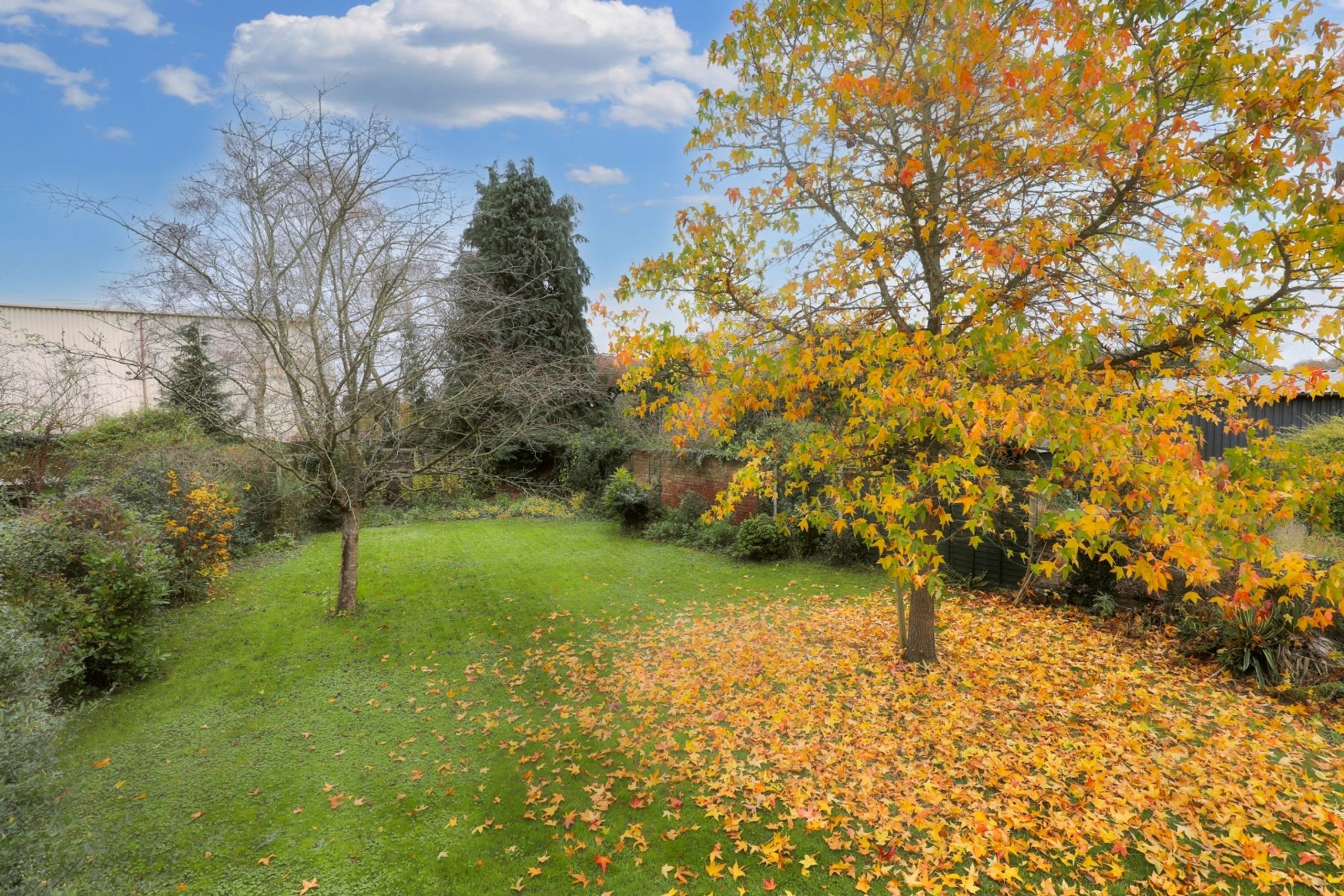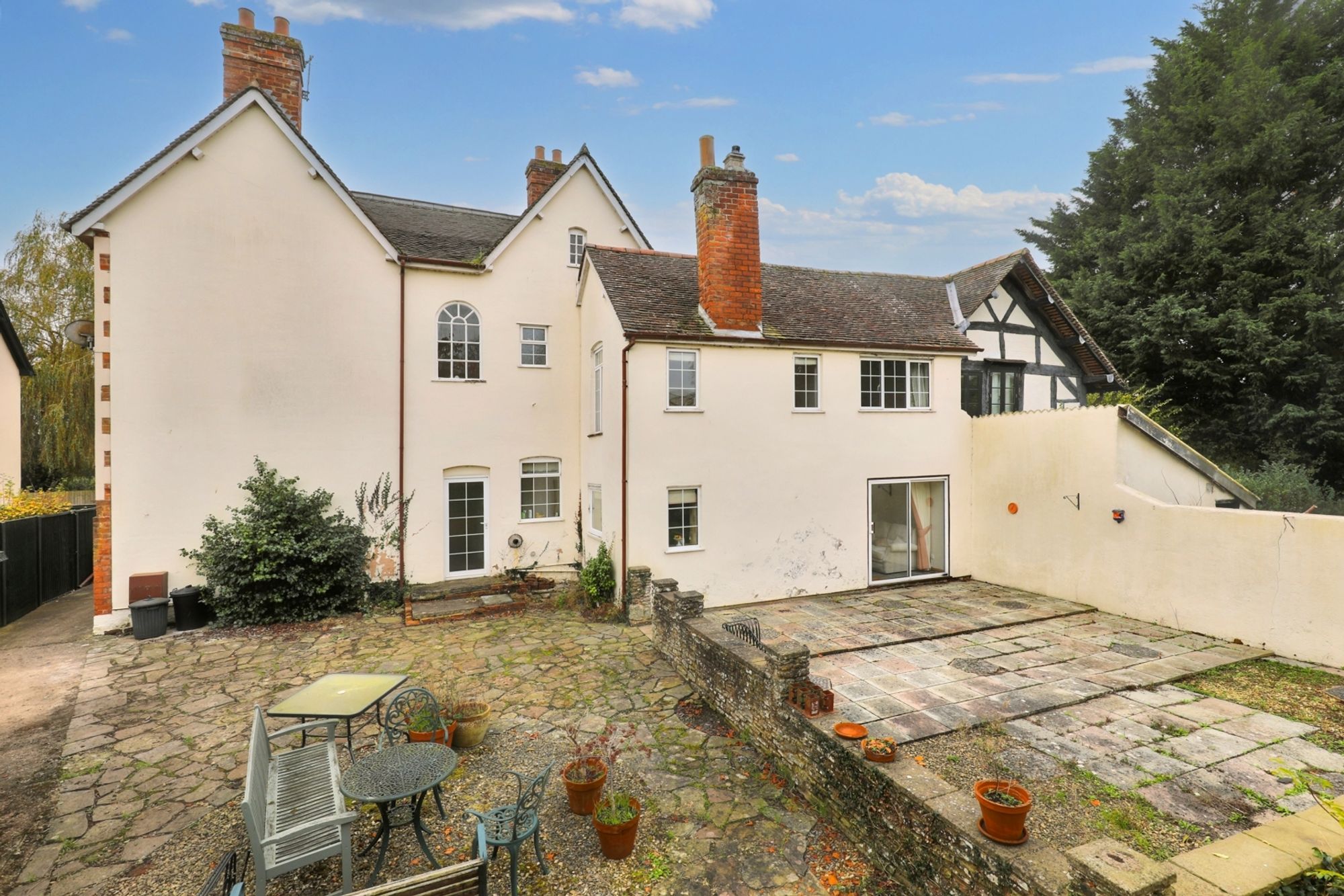 Outside is a spacious rear garden, combining a large patio area, mature trees, and lawn. The patio is ideal for outdoor dining and entertaining, while the garden offers ample space for relaxation and gardening.