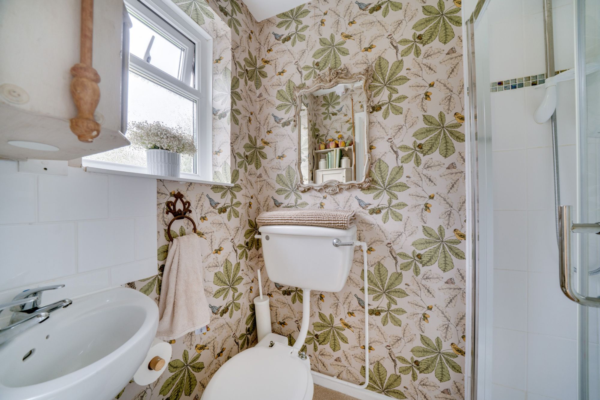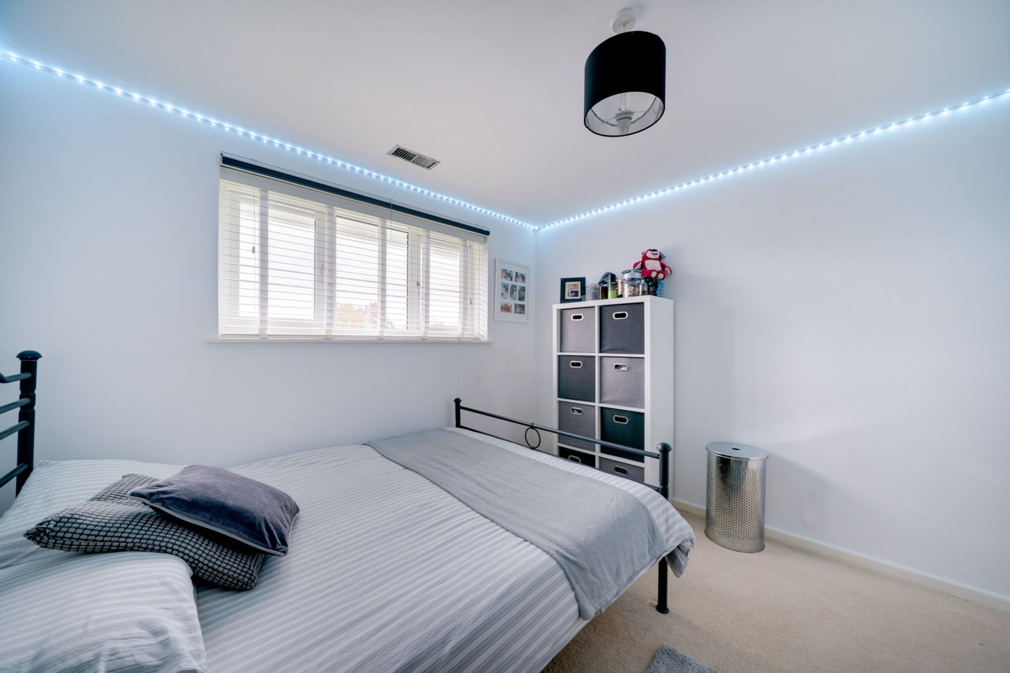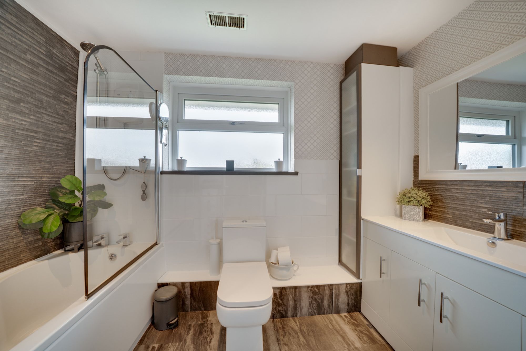 Upstairs, the accommodation continues to impress. The principal bedroom enjoys a bay window and built-in wardrobes, while two further double bedrooms and a fourth smaller double each include fitted storage. The family bathroom is finished in neutral tones and includes a bath with shower over, vanity basin unit, and WC.