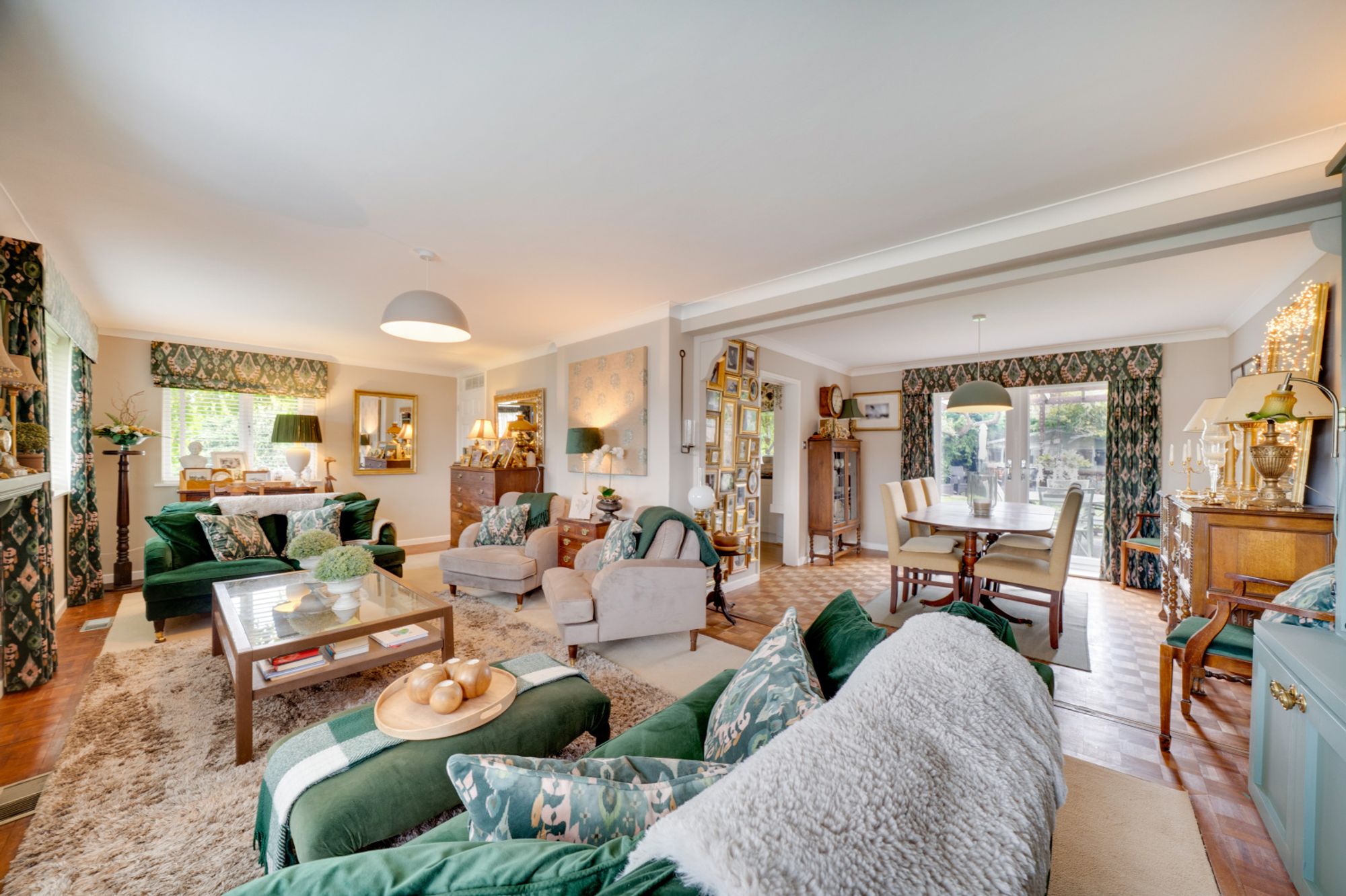 The kitchen is fitted with a range of contemporary units and integrated appliances including a double oven and gas hob, with a window overlooking the garden and a door connecting to the rear terrace. The layout flows seamlessly into the open-plan dining area, perfect for family gatherings or entertaining guests. The adjoining sitting room is particularly light, featuring a wide bay window, a fitted display unit with shelving and cupboards, and a decorative fireplace that forms a central focal point.
