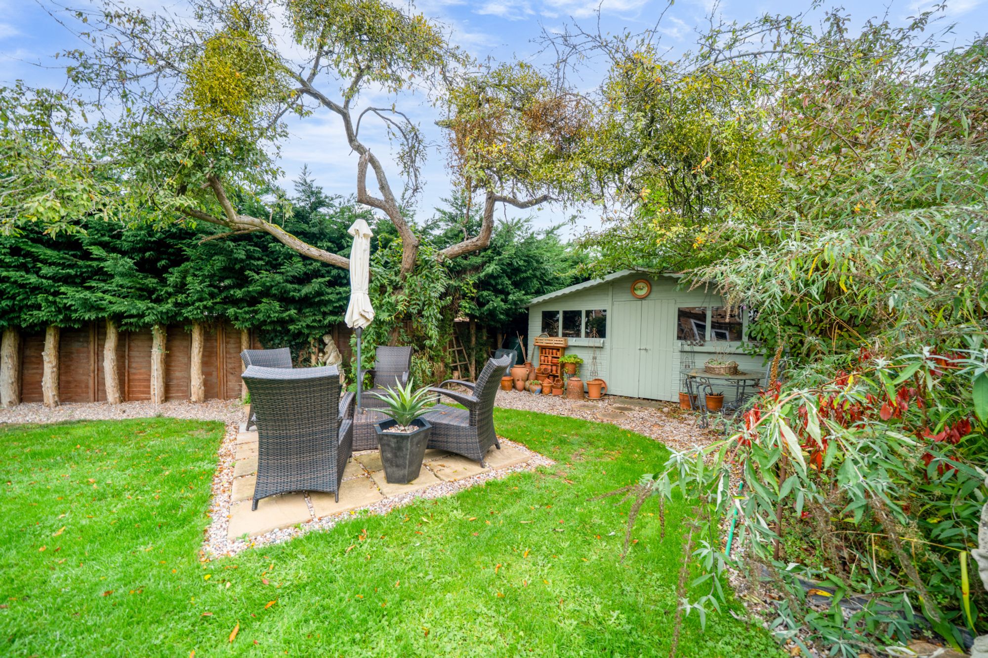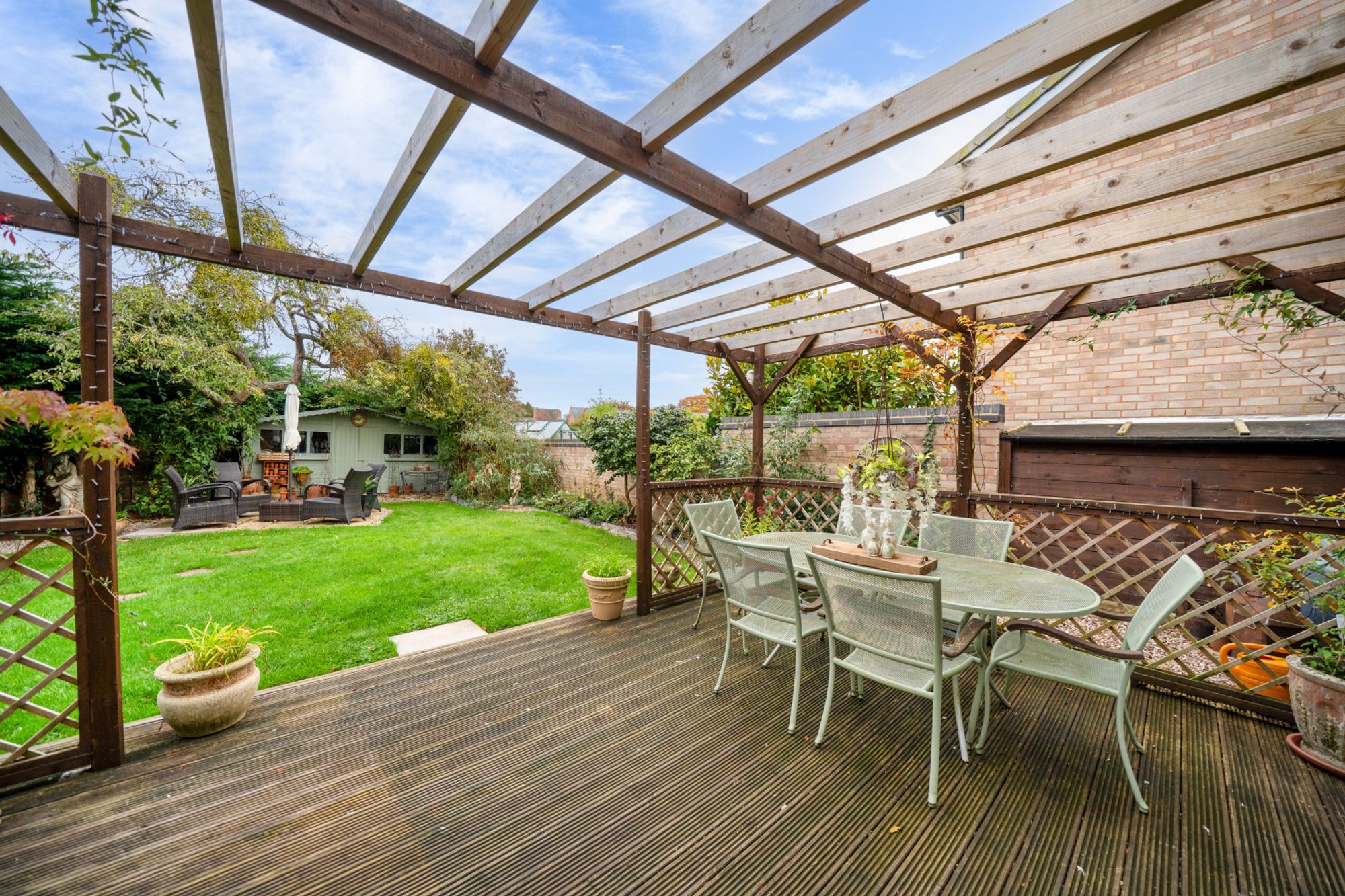 Outside, the front of the property features a neatly kept lawn and a driveway providing parking for several vehicles. Gated side access leads to a private rear garden which has been thoughtfully landscaped, incorporating a raised deck with a pergola ideal for al fresco dining, a lawn bordered by established planting, a separate seating area, and a timber summerhouse.