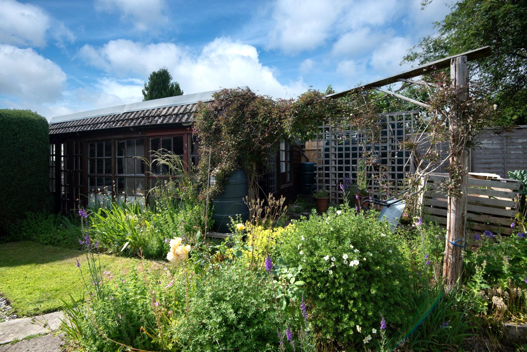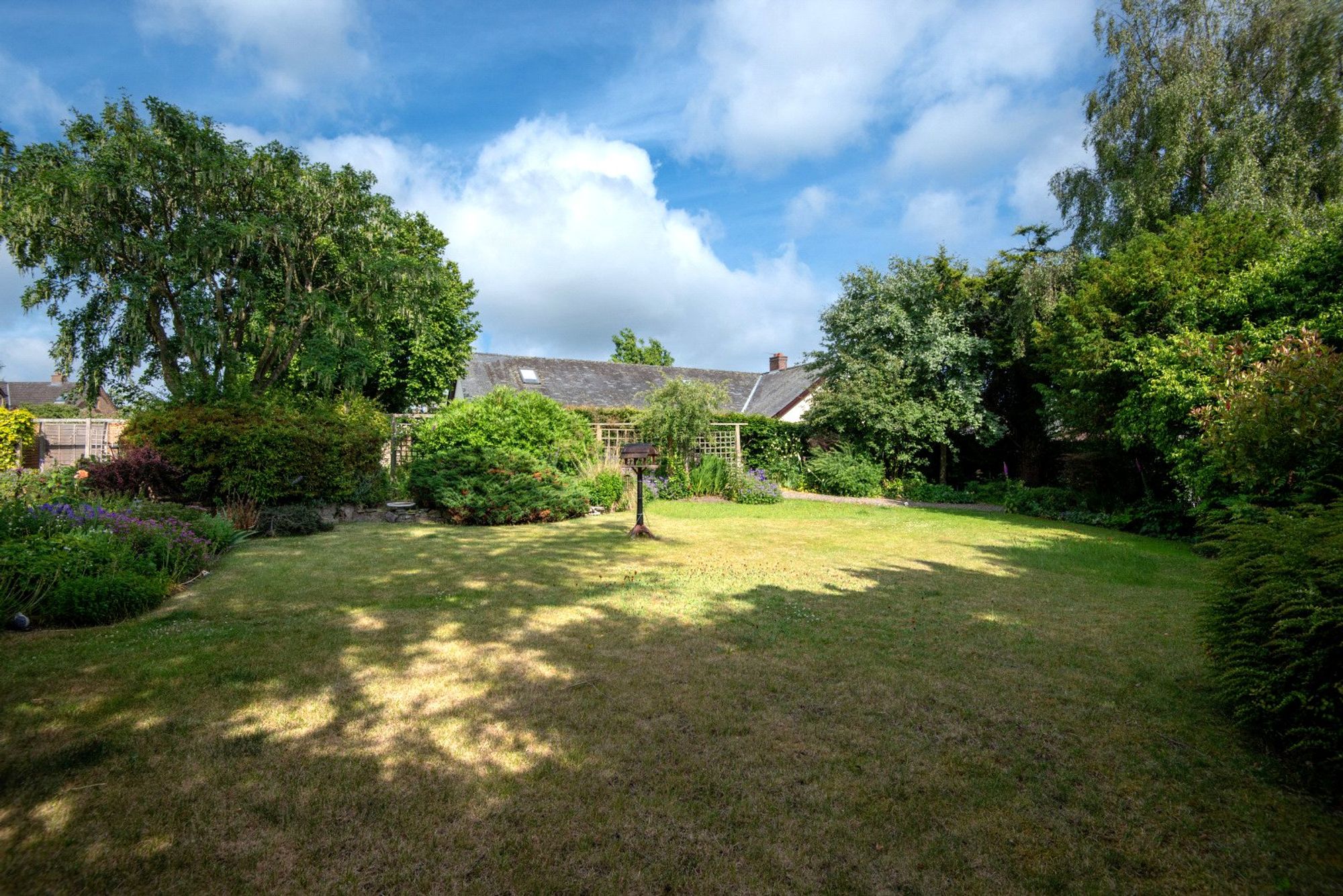 The gardens are a notable feature of the property, offering a combination of shaped lawns, flowering borders, mature trees and established planting. The garden is arranged in tiers, creating distinct areas for entertaining, relaxing and wildlife enjoyment. A charming paved terrace adjoins the rear of the house, ideal for alfresco dining, and there is also a detached workshop/store tucked away at the top of the garden.