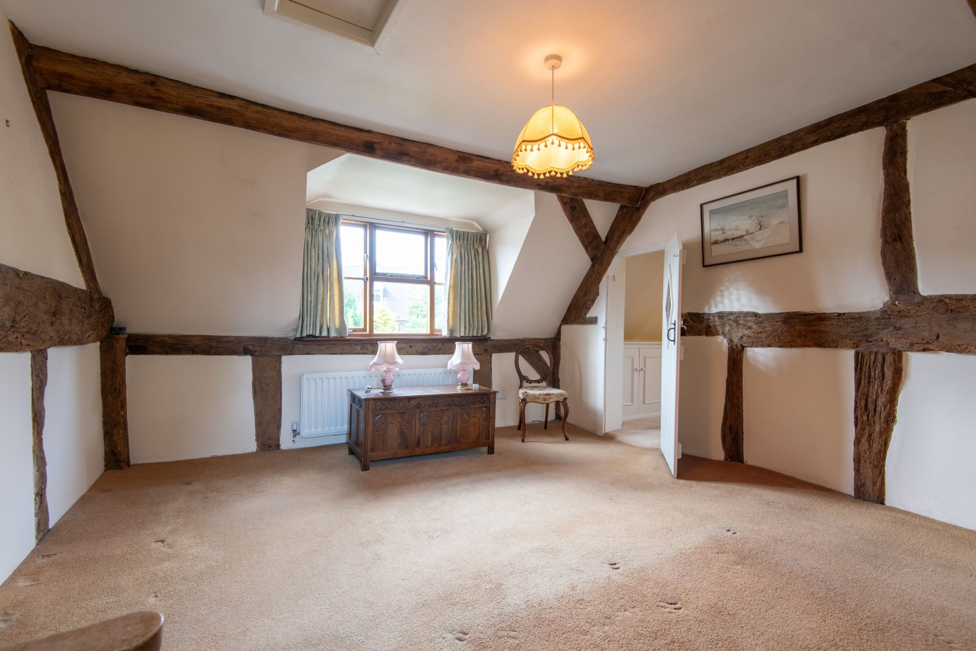 The property is approached via a private driveway with off-road parking. The property opens into a welcoming lounge, featuring exposed timbers and generous proportions. This leads through to a ground-floor cloakroom and bathroom, and a spacious double bedroom, making the layout highly adaptable.