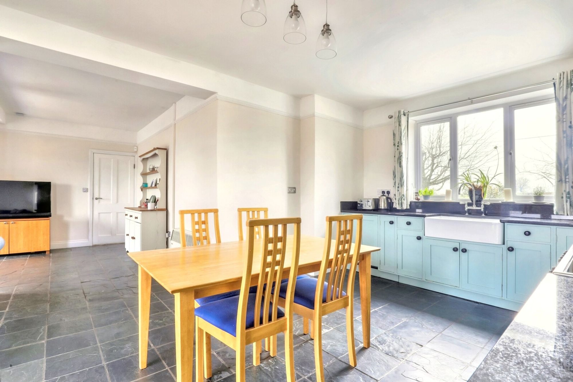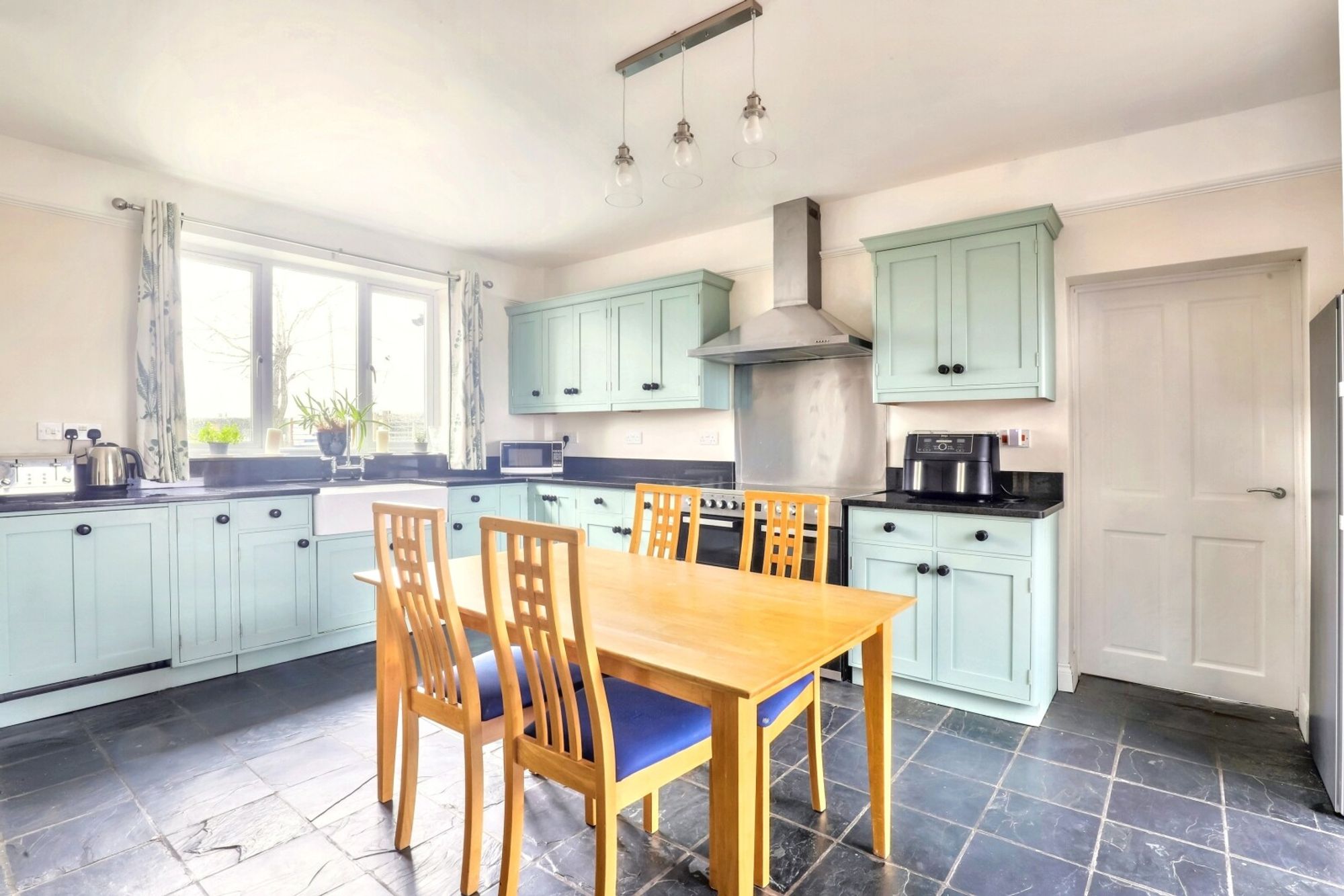 The kitchen/breakfast room is the heart of the home, featuring bespoke cabinetry, modern appliances, and ample space for informal dining. The adjoining family room provides a relaxed living area complete with woodburner with doors opening onto the garden, seamlessly blending indoor and outdoor living.