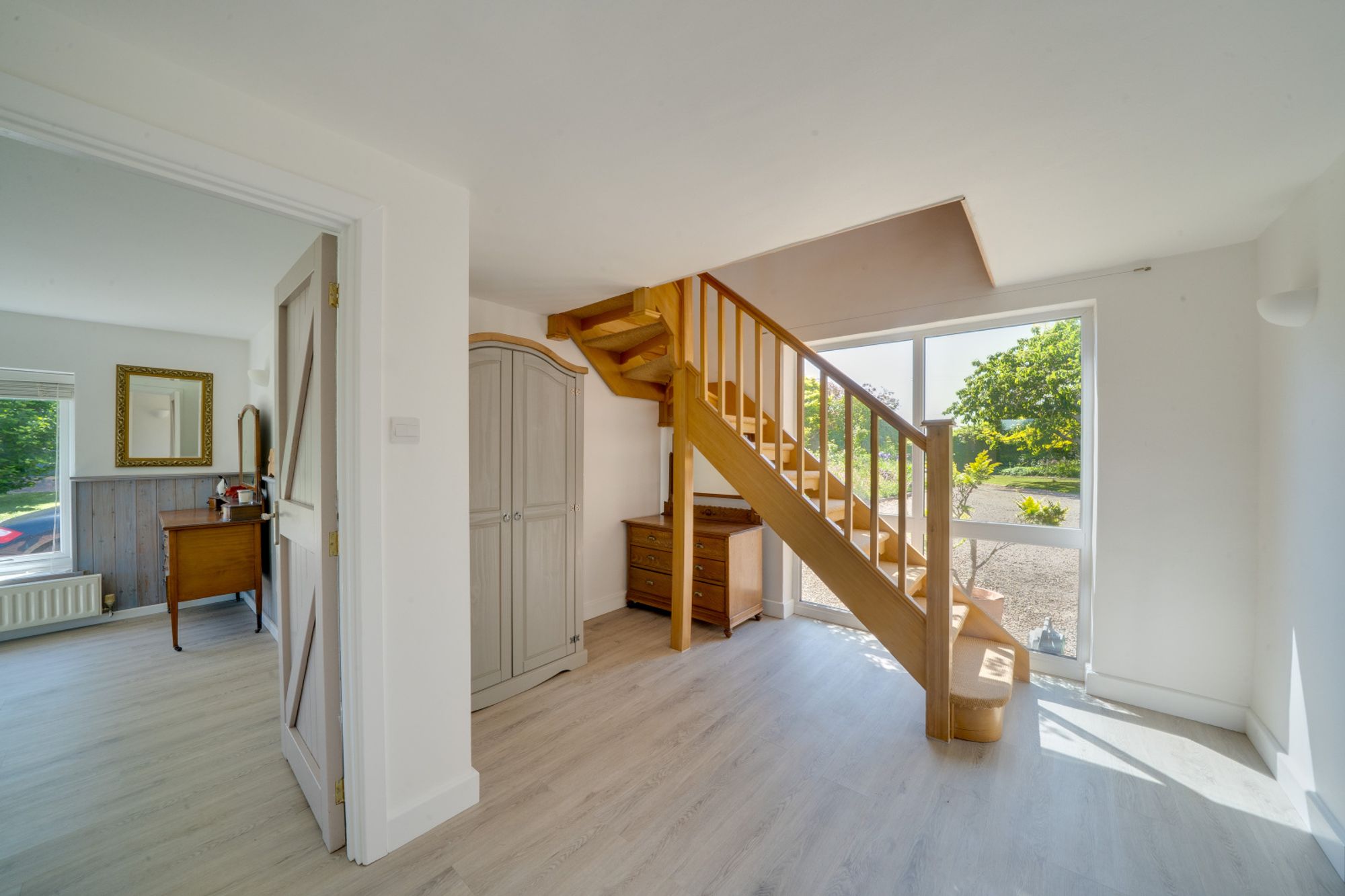 Also on the ground floor is a versatile bedroom suite, ideally suited for a dependent relative or guest accommodation. This includes a generously proportioned double bedroom with garden access, a dressing room, and an adjoining bathroom with both bath and separate shower.
