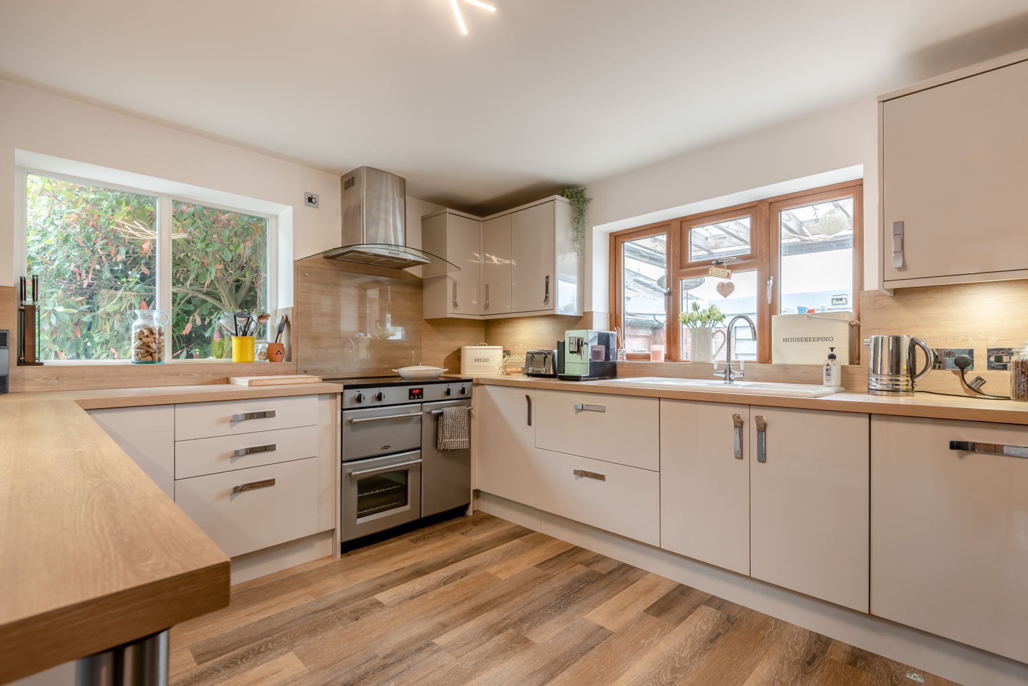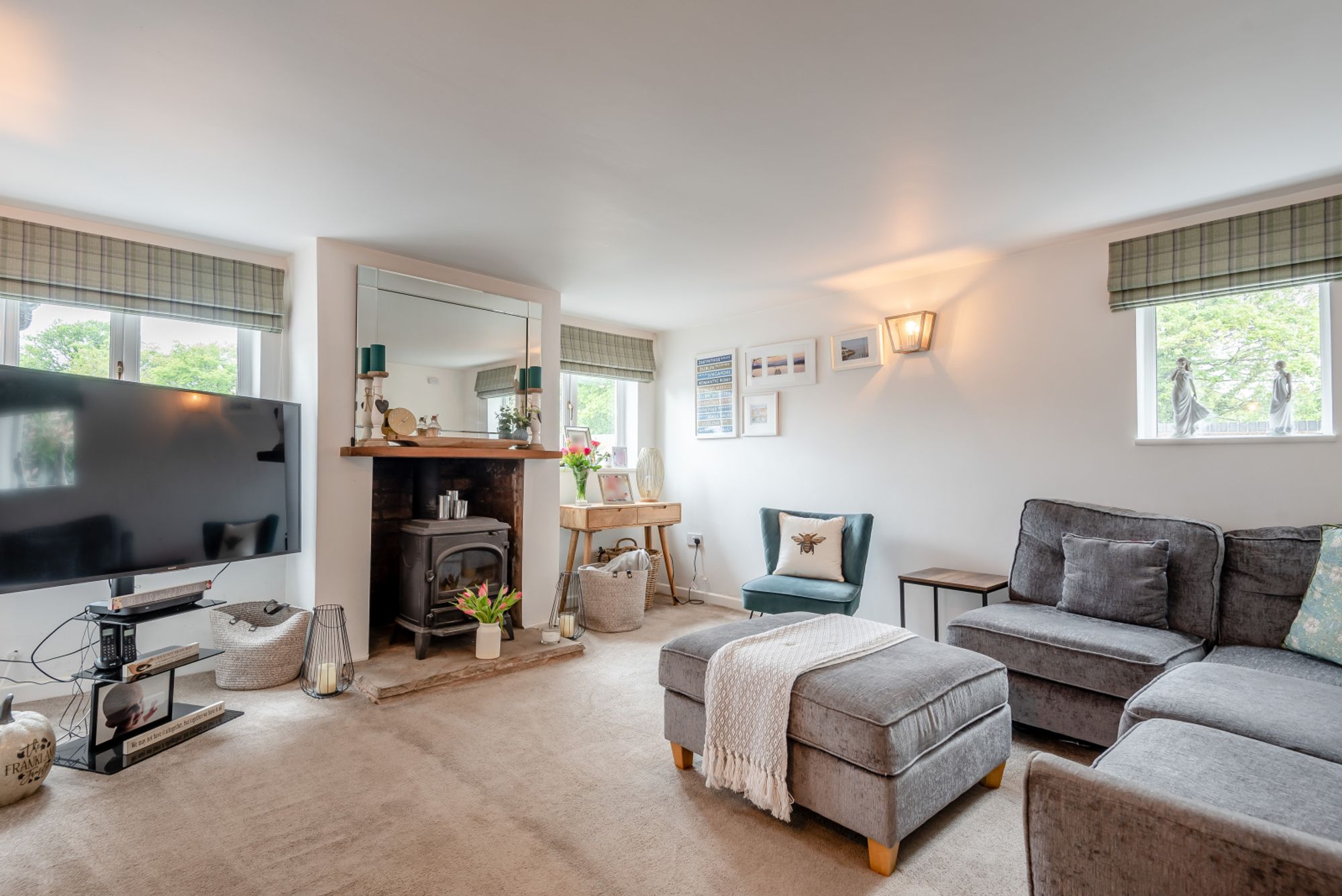Stepping into the property, you enter a small porch which opens into the hallway. To your left, the kitchen is fitted with a range of contemporary units and worktops, with space for freestanding appliances and a useful breakfast bar. The dual-aspect windows provide plenty of natural light, making it a bright and functional space for everyday cooking and informal dining. A door leads directly into the adjoining living room, which is well-proportioned and offers a warm and relaxing environment, featuring a central wood-burning stove set within a brick recess on a stone hearth. Dual aspect windows and neutral décor make this an inviting space for both family use and entertaining.