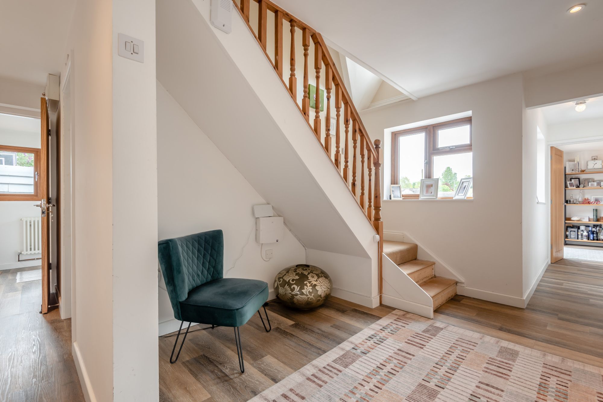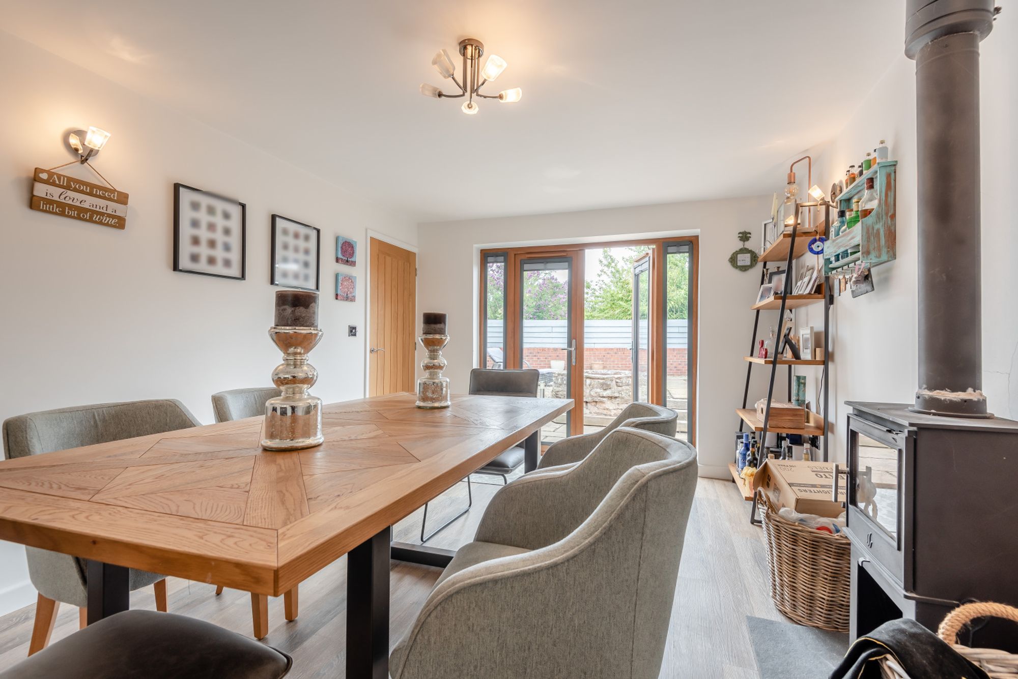 On the opposite side of the hallway, Bedroom 3 is a comfortable double room with a front-facing window. Bedroom 2, currently used as a home office alone, was previously a double bedroom and office space is a flexible space that would also serve well as a double bedroom or nursery. Towards the end of the hallway a formal dining room featuring a wood burning stove, is a versatile and generously proportioned space. With ample room to accommodate a large dining table and additional furniture, it serves well as an elegant setting for entertaining. Alternatively, it could easily be reconfigured as a further family room or lounge, with French doors overlooking the garden ensuring a pleasant outlook and good natural light.