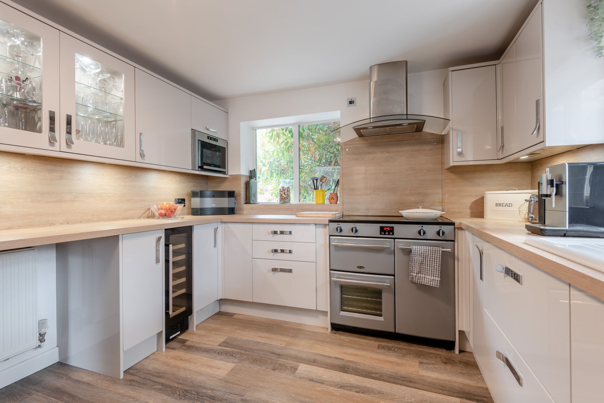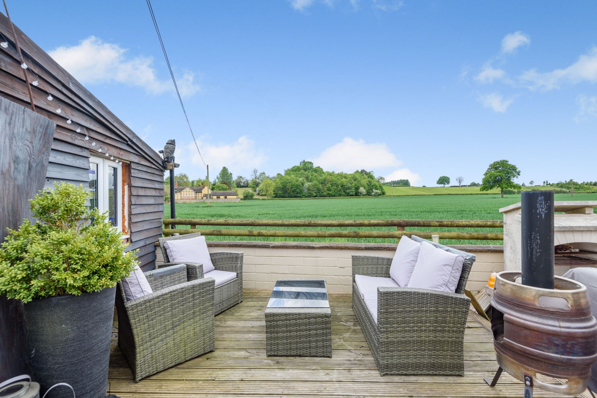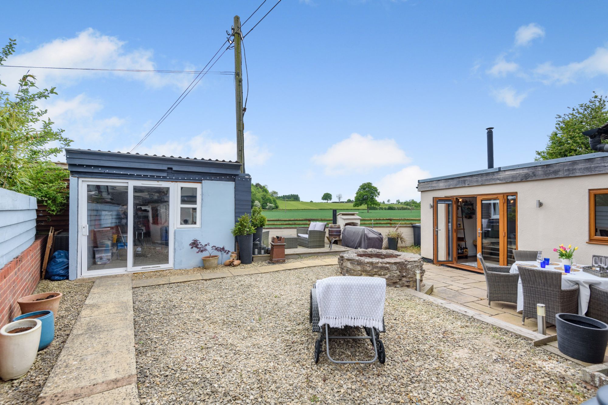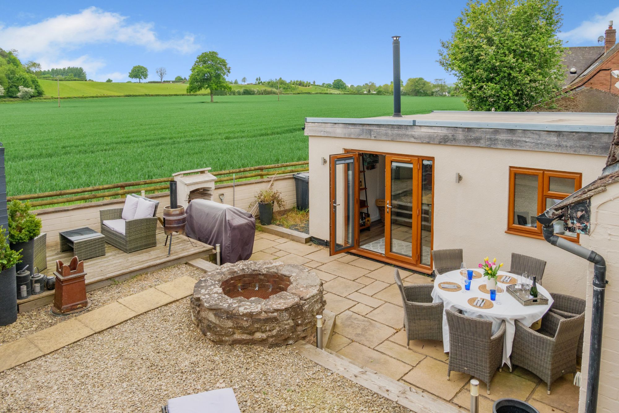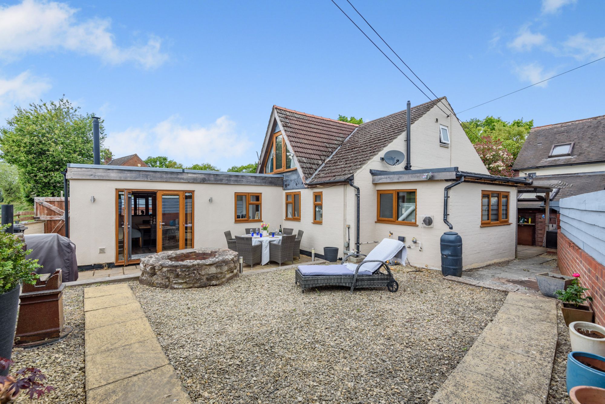 The rear garden has been landscaped for ease of maintenance and offers a combination of gravelled areas and paved terraces, ideal for al fresco dining and entertaining. A circular well forms an attractive central feature and could easily be transformed into a fire pit area, and there is a raised decked area that enjoys unspoilt views across the surrounding countryside.