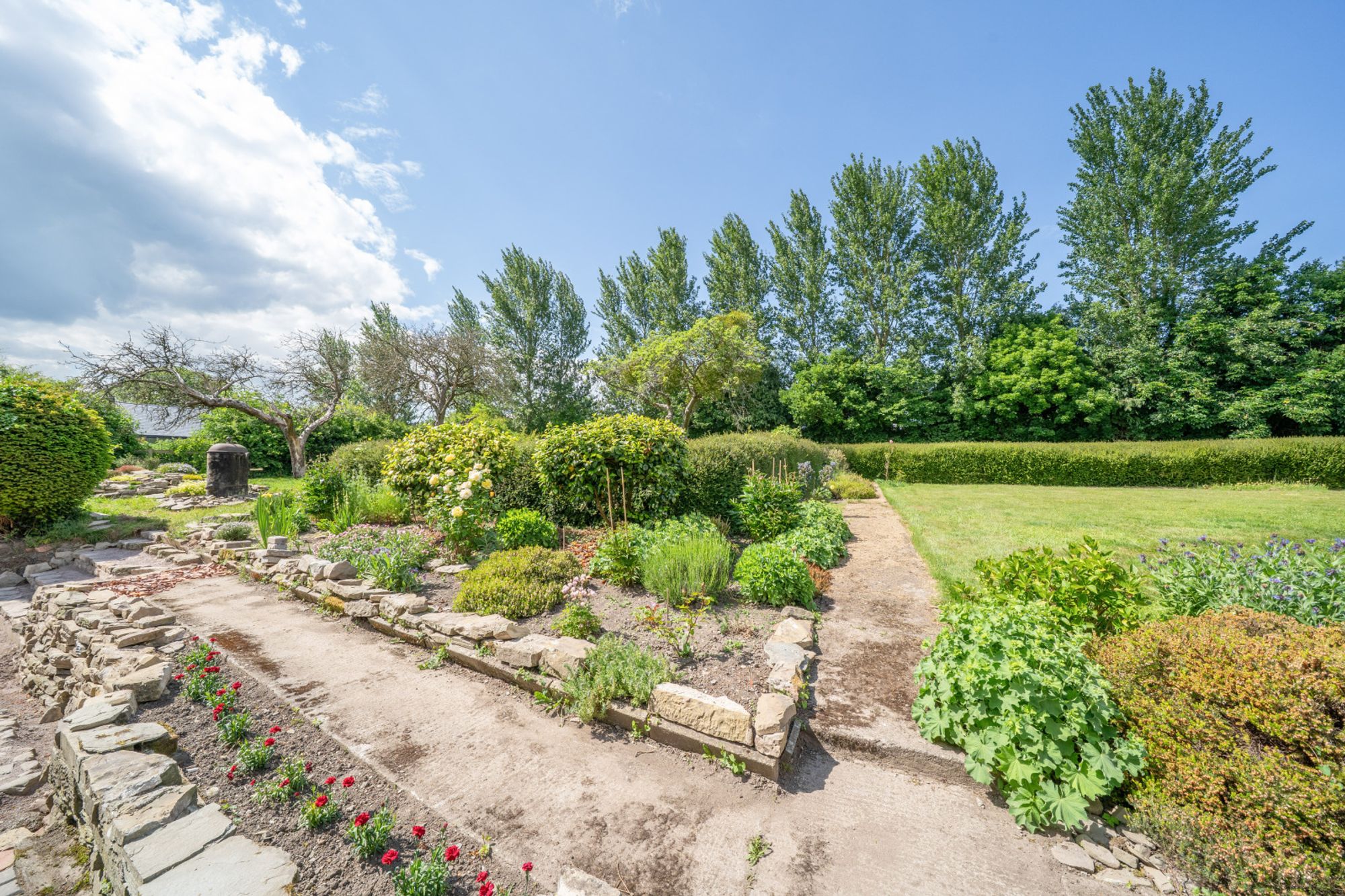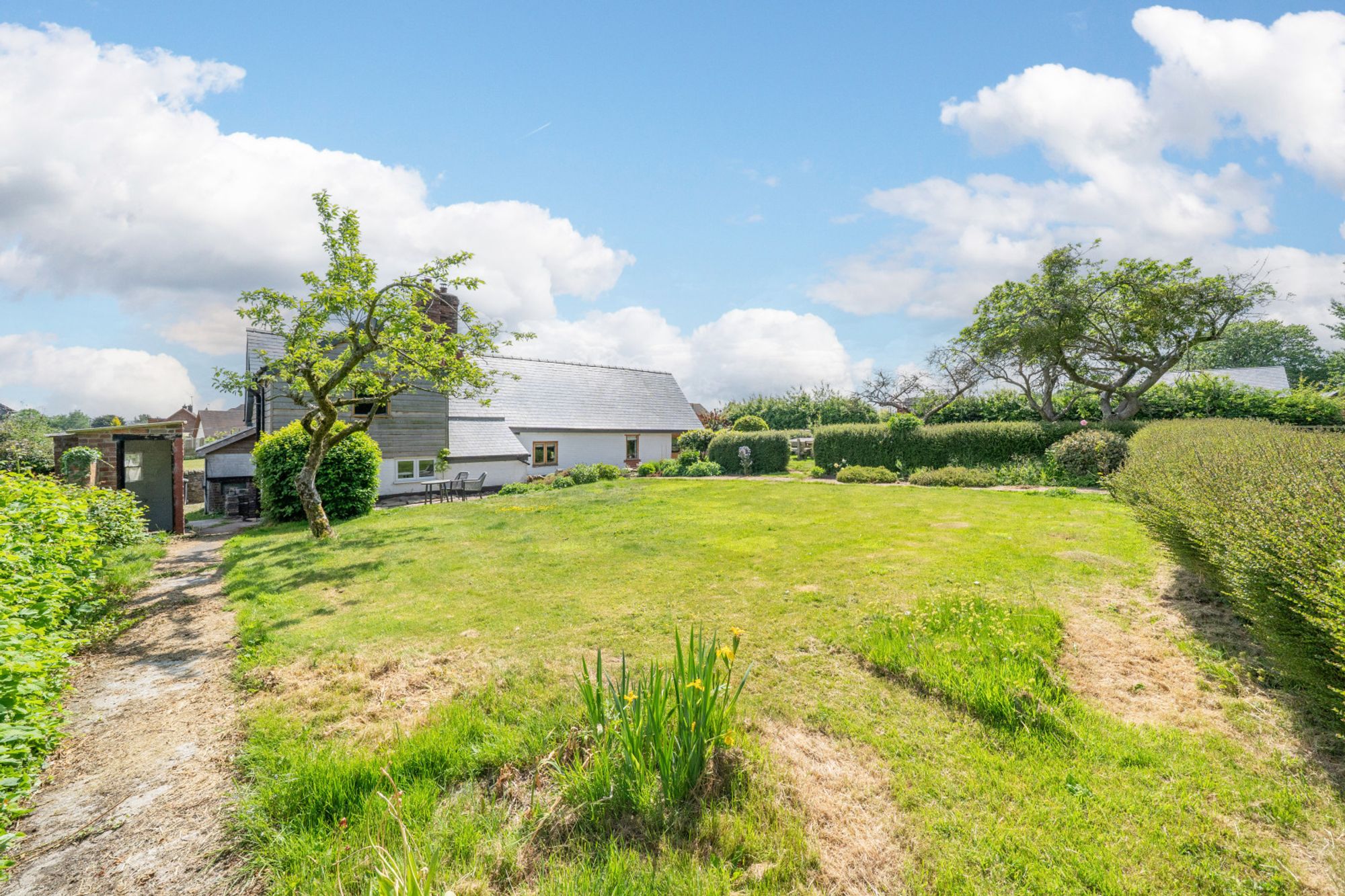To the rear of the house, the garden is fully enclosed and has been divided into different areas to enjoy. There are large areas laid to lawn which are bordered by mature hedging and well stocked herbaceous borders. There is access to the external store and to the side of the home. A further parking area has been created, meaning there is now parking for up to 6 vehicles.