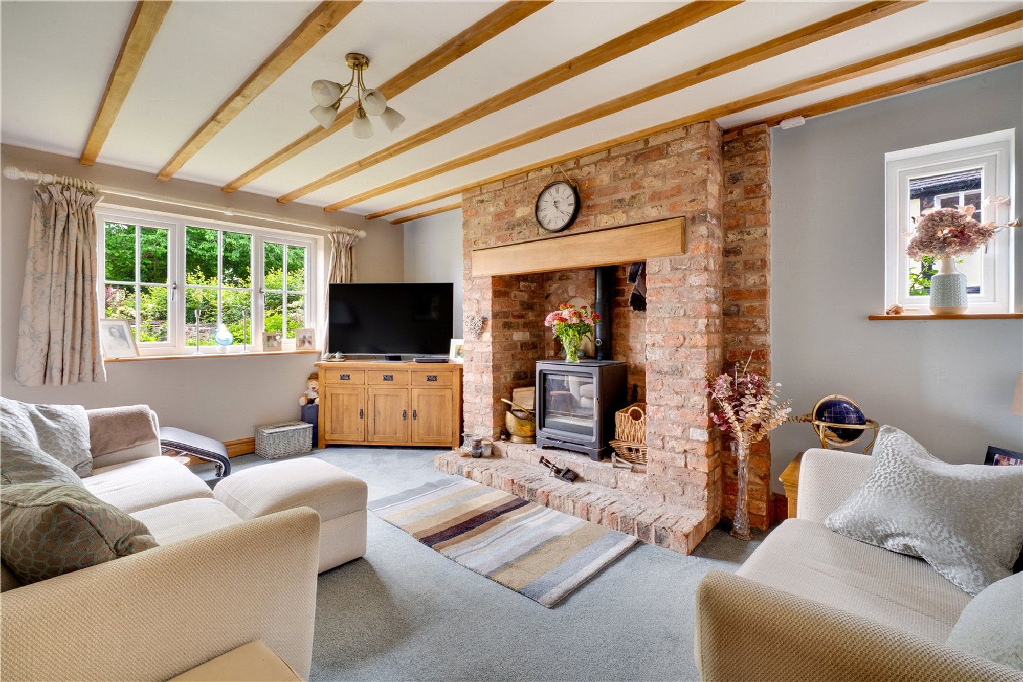 The living room is situated at the front of the property and exudes warmth and character. A large brick inglenook fireplace with oak mantel and wood-burning stove creates a central focal point, while dual-aspect windows frame the manicured gardens.