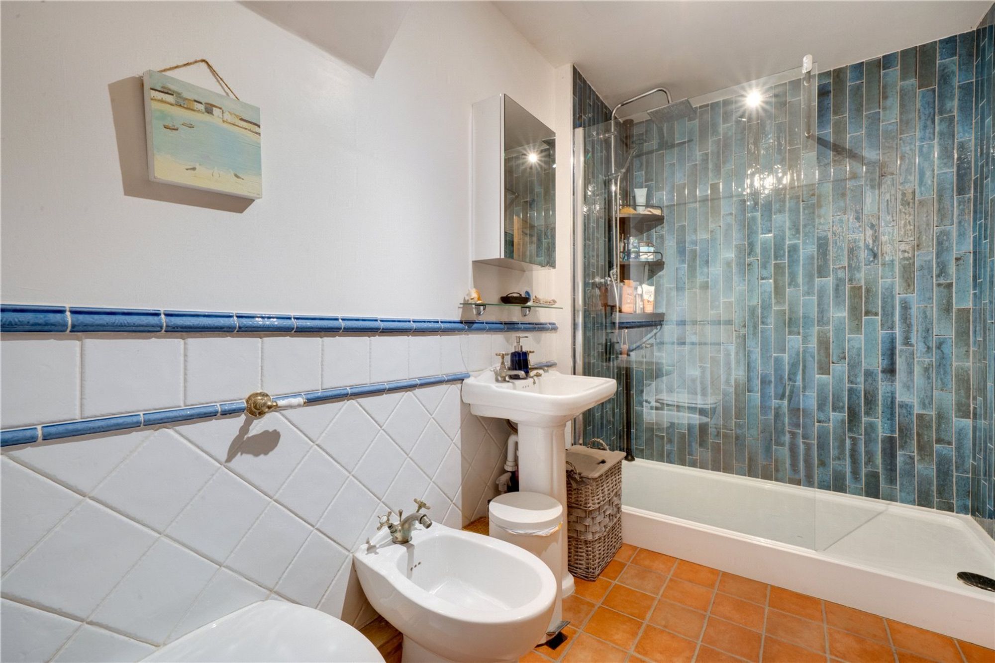 Also on the ground floor is a stylish shower room, which includes a large walk-in shower with rainfall shower head, contemporary basin, WC, and bidet, all presented in an elegant combination of ceramic tiles and vinyl flooring.