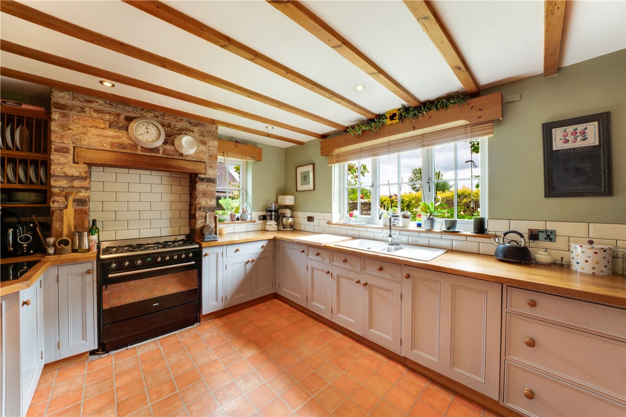 To the right, the kitchen / dining / family room extends the full depth of the property. Designed with both practicality and sociable living in mind, this impressive open-plan room features exposed ceiling beams, inset lighting, and terracotta-style flooring. A feature chimney breast with reclaimed brickwork houses a range cooker, flanked by a traditional plate rack and bespoke units finished with oak worktops. There is ample space for both a dining suite and casual seating, with French doors opening directly onto the rear garden, making this a perfect space for entertaining.