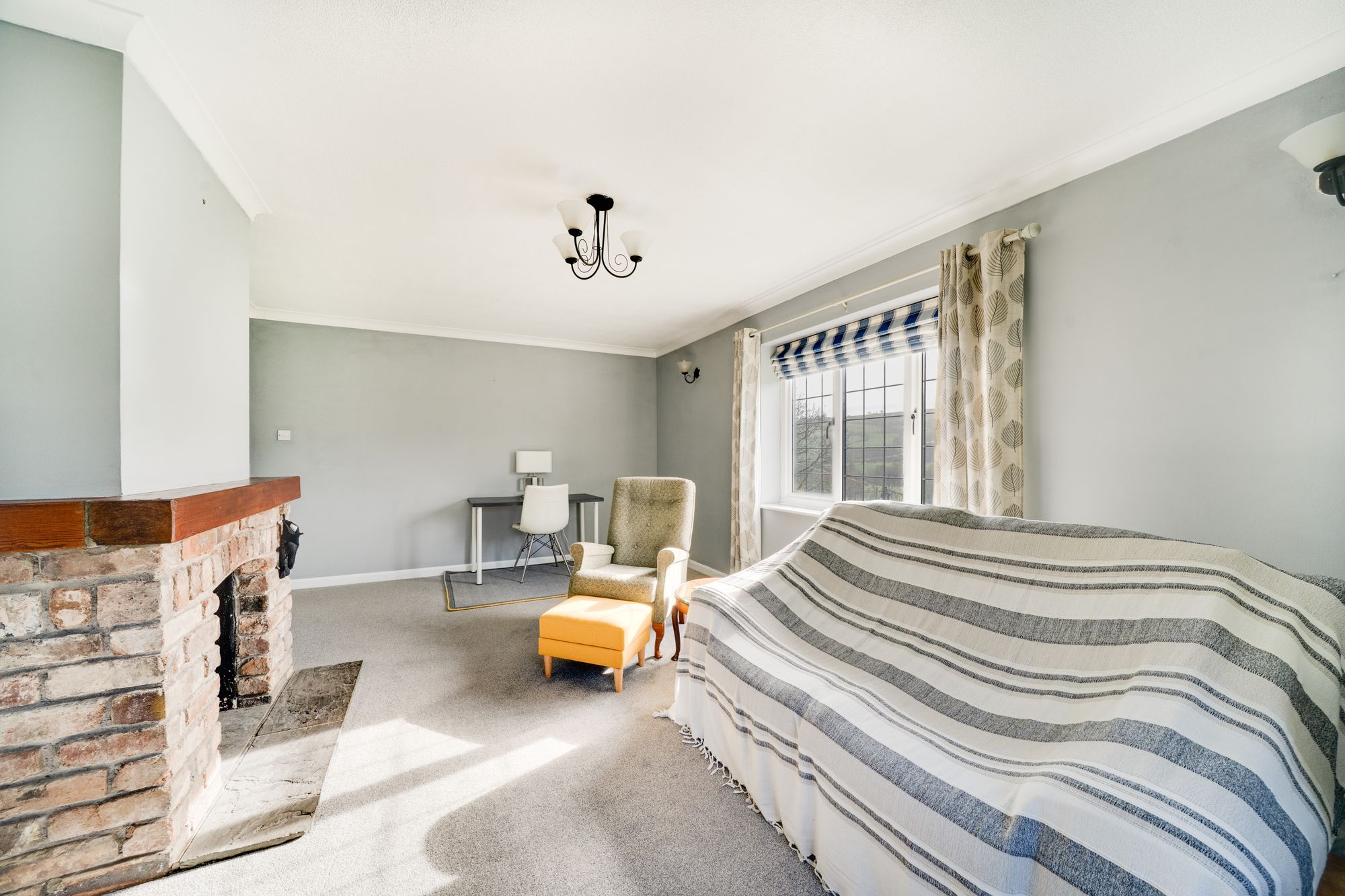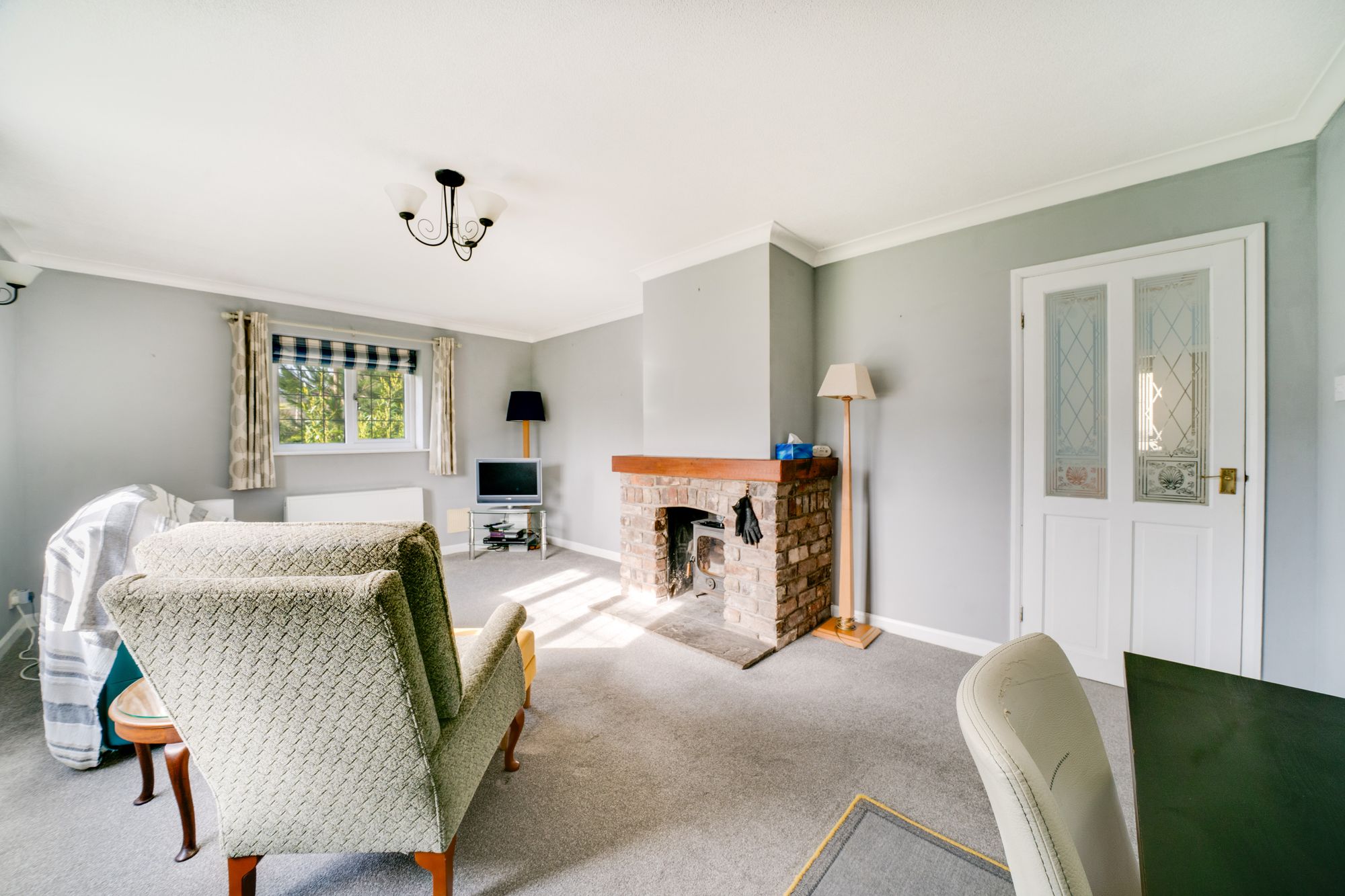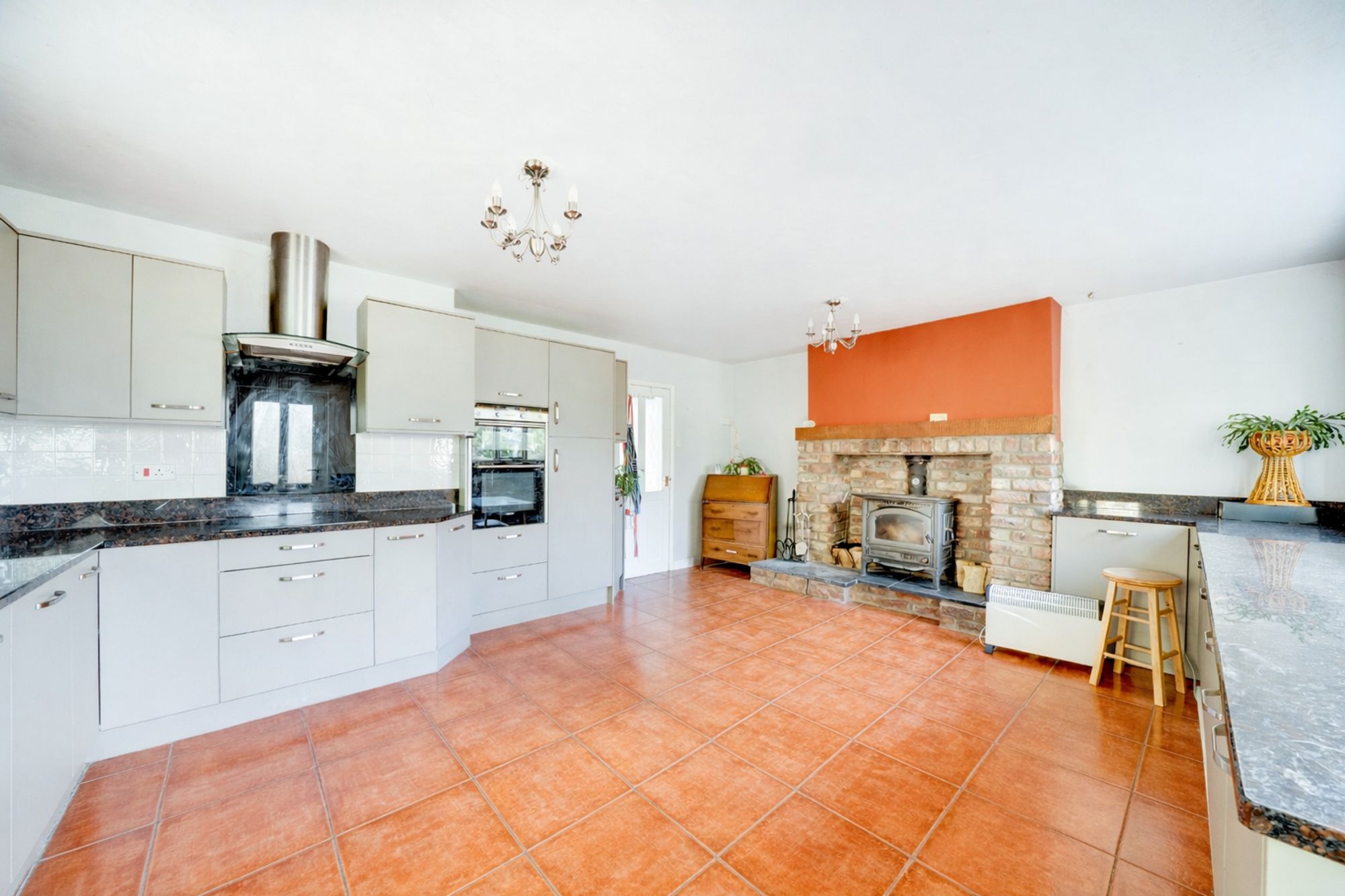 The kitchen and dining room provides a spacious area for everyday living and entertaining, fitted with a range of contemporary units with extensive worktops and integrated appliances. A striking brick fireplace with wood-burning stove forms an attractive focal point to the room. From the kitchen, a side door leads out onto the patio, providing convenient access to the garden.