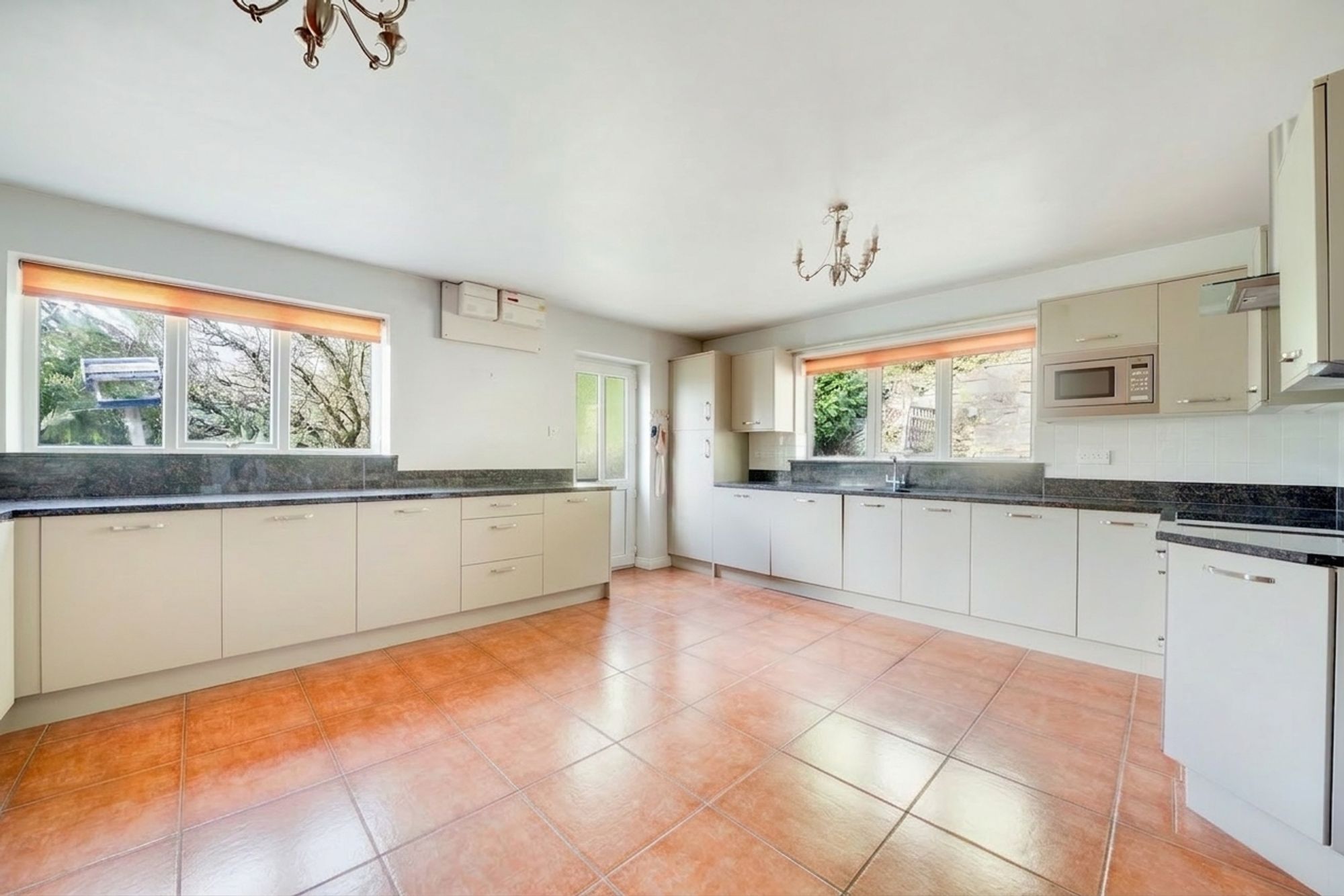 Stairs rise to the first floor, where the main living accommodation takes full advantage of the elevated outlook. The living room is a generous and inviting space, filled with natural light and enjoying pleasant views across the surrounding landscape.