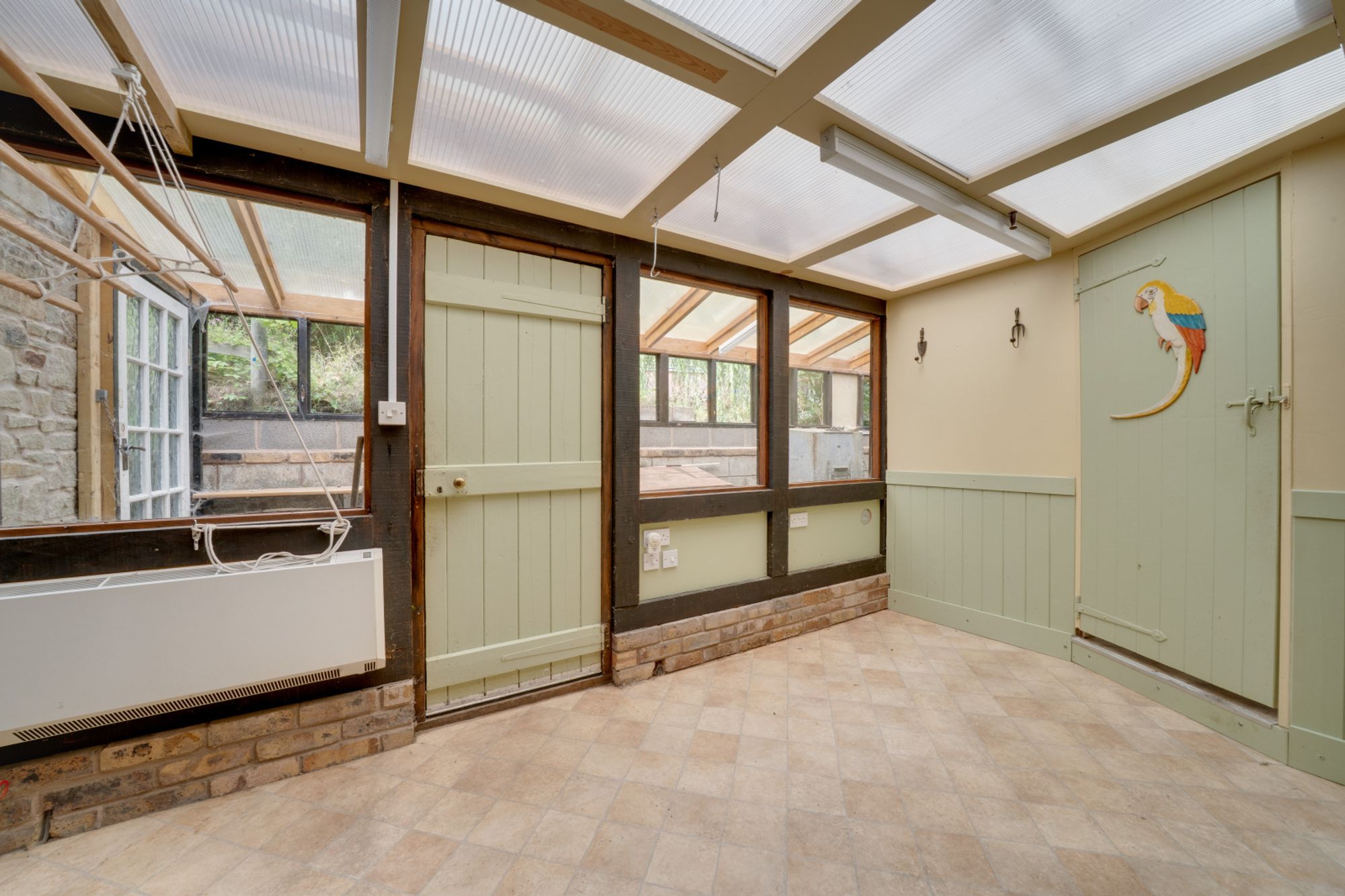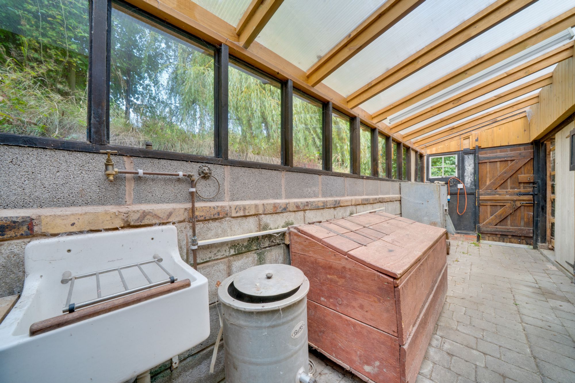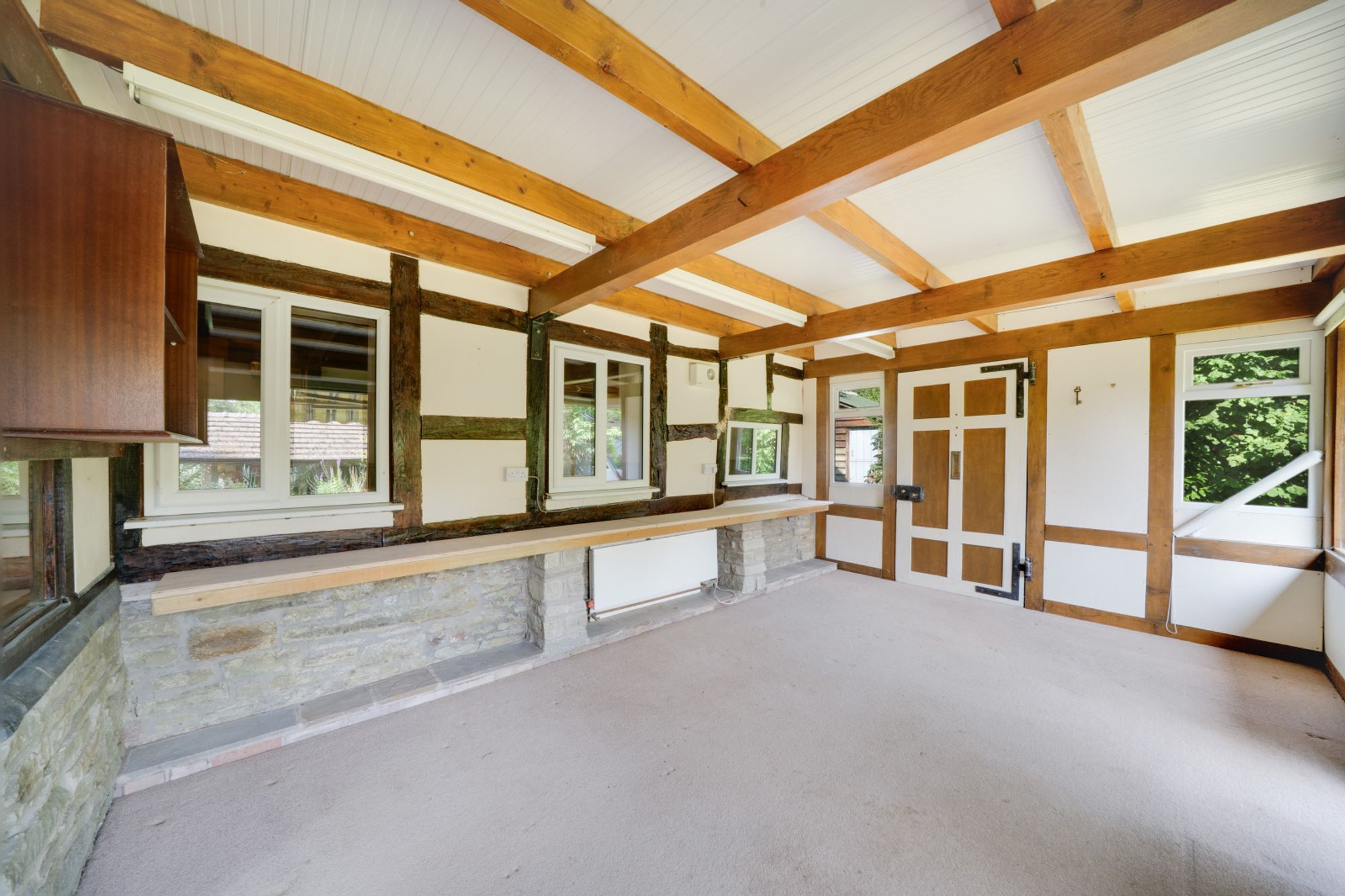 You are welcomed into the property through a glazed door into the spacious Oak framed garden room which had planning granted in 2010 and constructed shortly after. It has features including timber framed walls and exposed stonework, a glazed frontage looking out over the garden and two separate side entrances creates a wonderful bright space to enjoy and watch the wildlife.