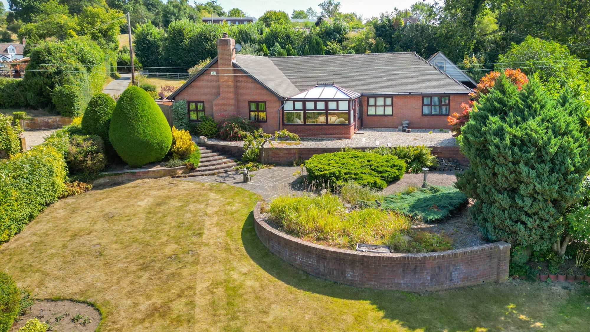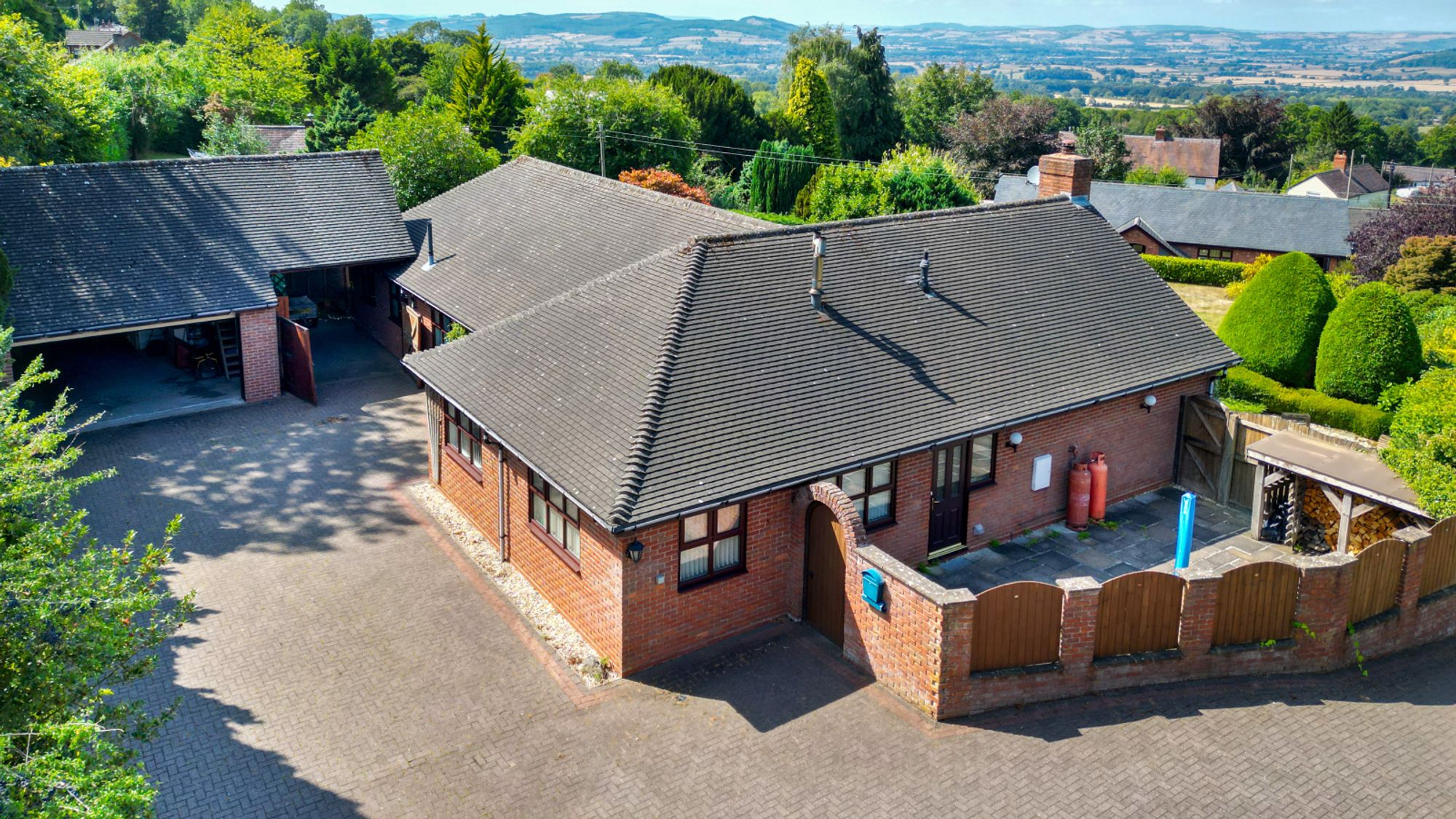 This detached bungalow occupies an elevated position with some of the finest views across the Shropshire countryside. It is approached via a sweeping driveway which provides ample parking and turning space. To the side lies a detached double garage with carport, complete with power, lighting and a useful WC. Above, there is excellent boarded storage space, making it an exceptionally practical addition to the property.