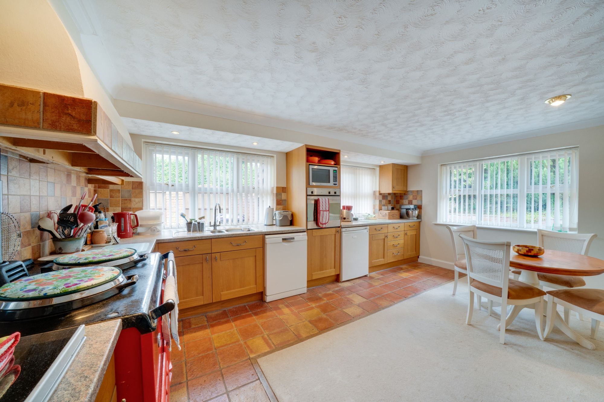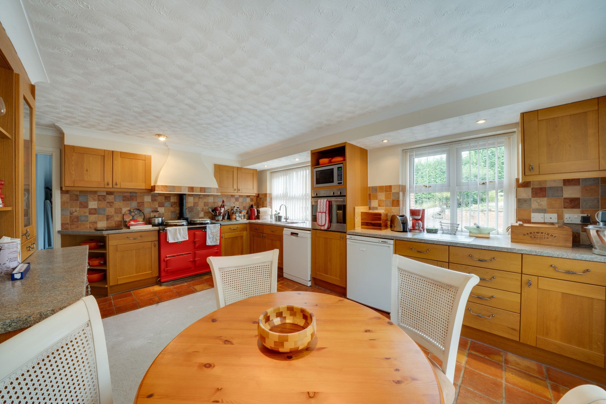 The kitchen and breakfast room is fitted with a range of units, tiled splashbacks and an Aga cooker, with space for informal dining. A separate dining room provides the perfect setting for more formal occasions, while a utility room adds further practicality with additional storage and outside access.
