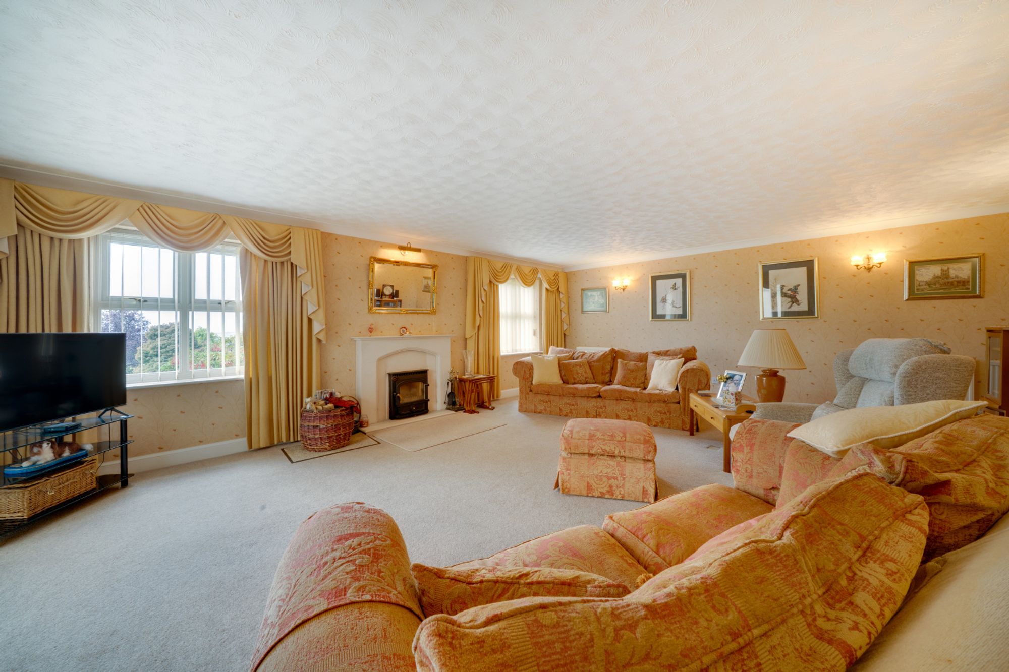 The accommodation is well proportioned and versatile. A welcoming hallway leads into the principal reception rooms, with the sitting room being particularly impressive, enjoying a dual aspect outlook and a feature fireplace. From here, doors open into the conservatory, a bright and inviting room that takes full advantage of the far-reaching views over the gardens and countryside beyond.