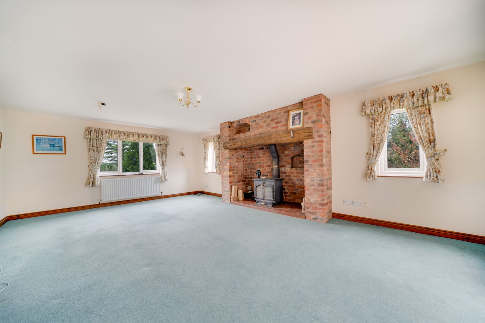 The dining room sits adjacent, providing a comfortable setting for formal meals or family gatherings, while the spacious sitting room features a striking brick fireplace with a wood-burning stove—perfect for colder evenings. From here, double doors open into the conservatory, which overlooks the surrounding greenery and provides access to the garden via external steps.
