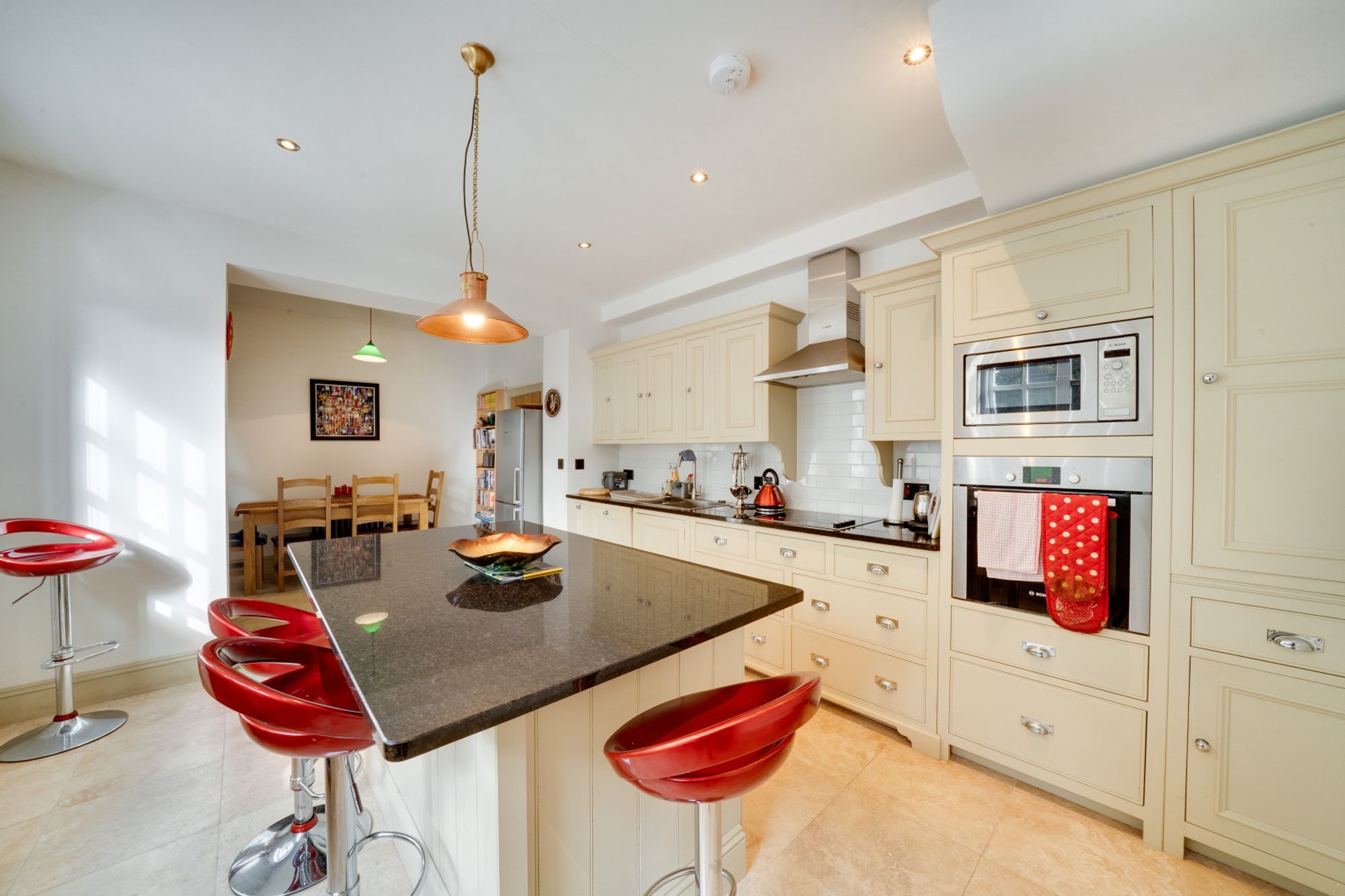 A welcoming porch provides space for boots and coats before leading into the heart of the home – a spacious kitchen/dining room. This sociable family space is fitted with a range of traditional cabinetry, granite worktops, integrated appliances and a central island with breakfast bar, complemented by a bright dining area.