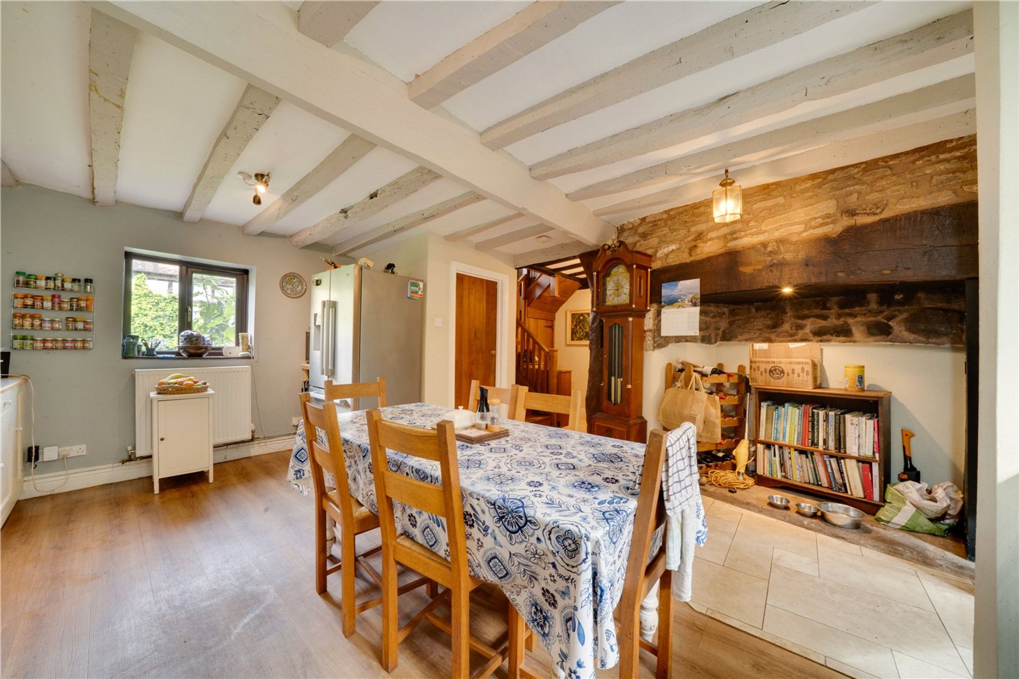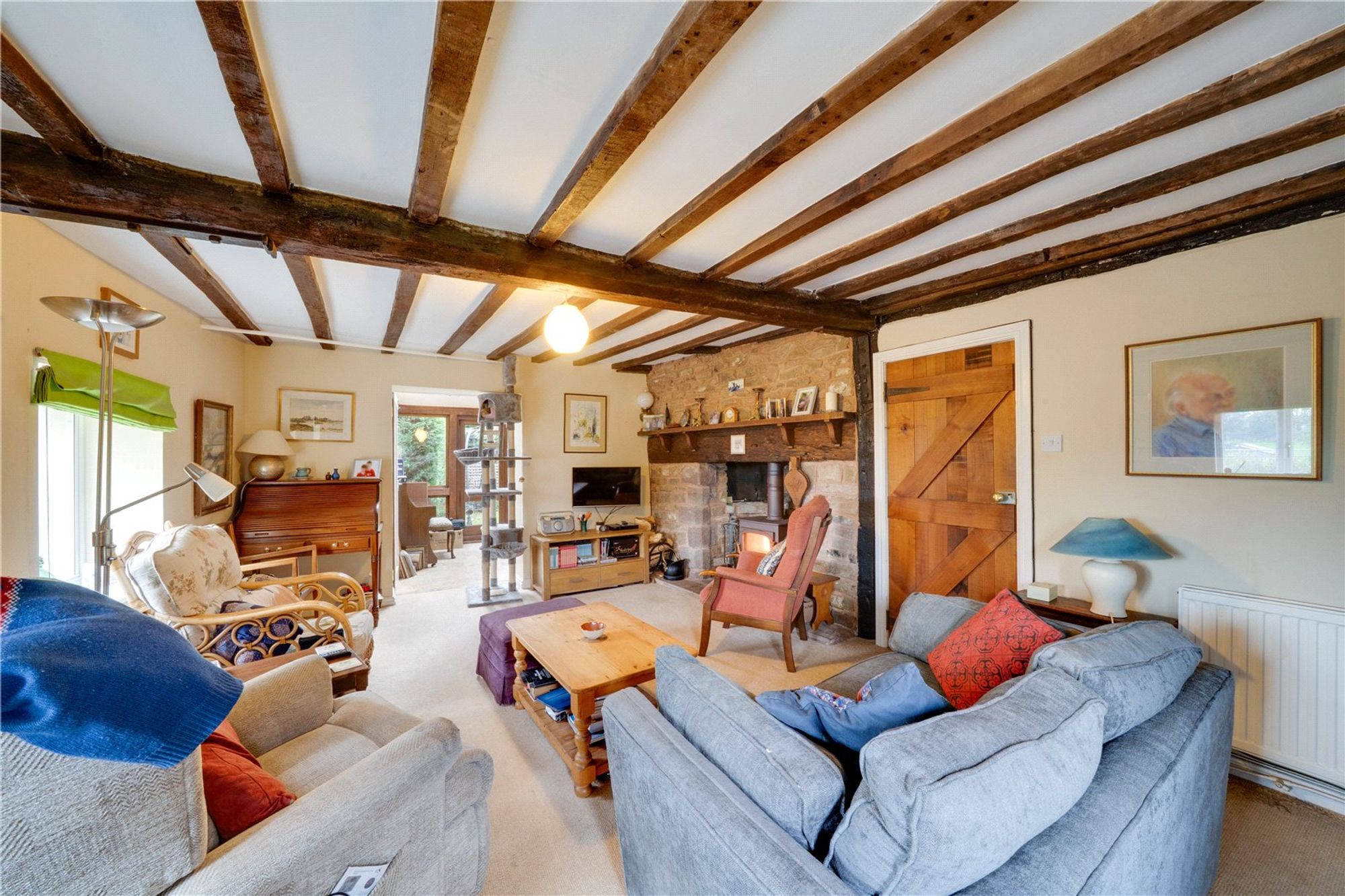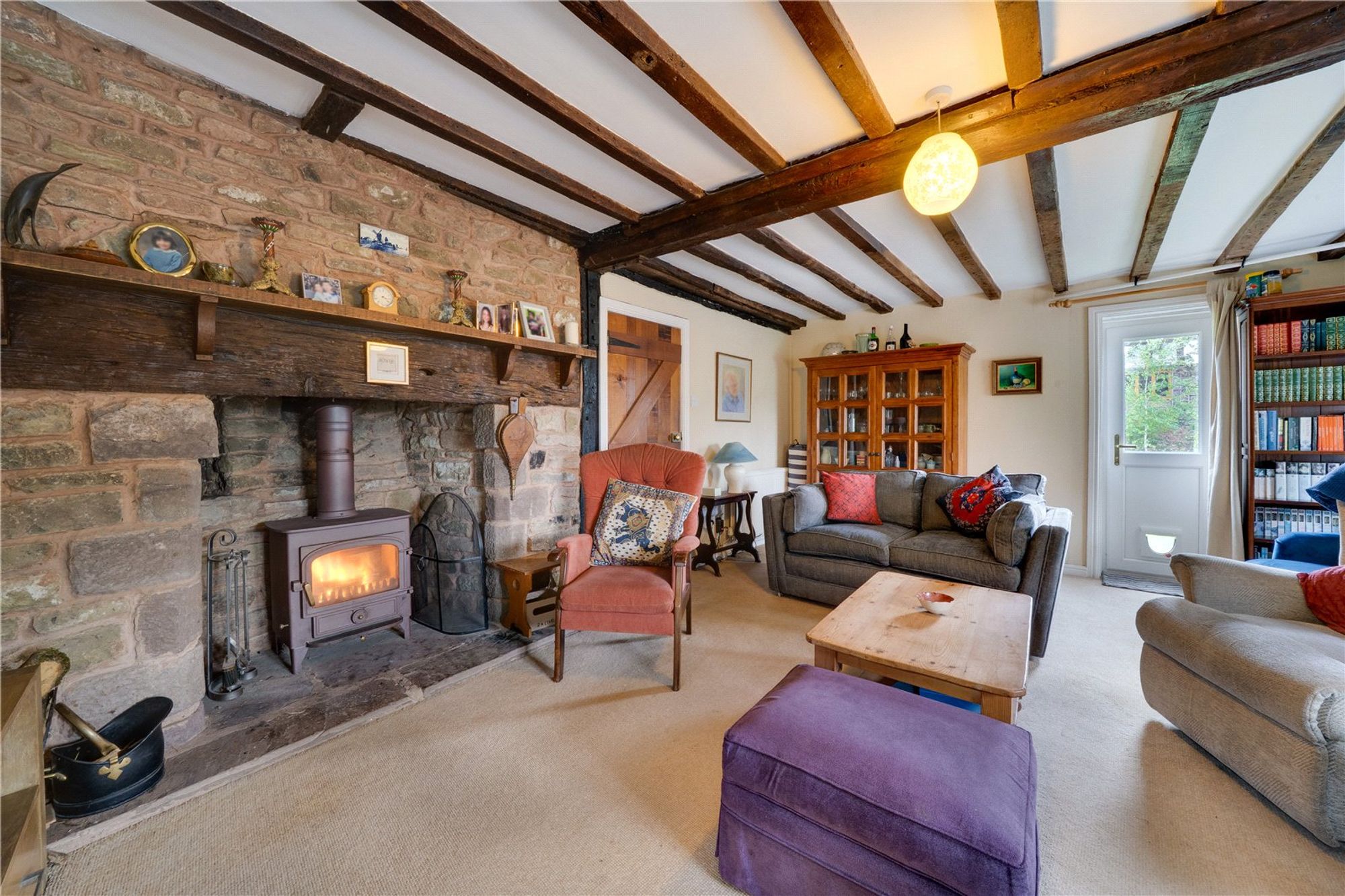 An oak-framed porch leads into the welcoming entrance hall, where exposed timbers immediately set the tone for the character found throughout the home. The kitchen and dining space has been thoughtfully opened to form a sociable and inviting area. Character features such as exposed beams and stonework highlight the property’s heritage. From the hall, a door leads into the sitting room, an inviting and comfortable space centred around a stone fireplace with a Clearview wood-burning stove. Exposed beams and a traditional wooden door enhance the character, while a glazed door opens directly onto the gardens, filling the room with natural light. Adjoining the sitting room is the garden room — a superb addition to the property. Glazed across its whole front, it enjoys wonderful views of the surrounding greenery and creates a tranquil space equally suited to relaxation, entertaining, or use as a home office or studio. Also on the ground floor is a cloakroom with WC and wash basin, adding useful practicality. The staircase and balustrade reflect the heritage of the house and lead to the first floor. Here, two spacious bedrooms are served by both an en-suite and a family shower room, all presented to a high standard. Original beams and exposed stonework continue the character theme, blending period features with modern comfort. A second staircase rises to the top floor, where a further double and a single bedroom/office enjoy elevated views of the gardens and countryside, showcasing the home’s size and versatility. The property is complemented by a patio and a communal lawn to the rear. To the front, a cottage-style garden is laid mainly to lawn and framed by established borders and hedging. The property benefits from a double garage which is fitted with twin opening doors, power, lighting and overhead storage, with ample parking in the shared driveway. Buyers Compliance Administration Fee: In accordance with The Money Laundering Regulations 2007, Agents are required to carry out due diligence on all Clients to confirm their identity, including eventual buyers of a property. The Agents use electronic verification system to verify Clients’ identity. This is not a credit check so will have no effect on credit history though may check details you supply against any particulars on any database to which they have access. By placing an offer on a property, you agree that if your offer is accepted, subject to contract, we as Agents for the seller can complete this check for a fee of £75 inc VAT (£62.50 + VAT) per property transaction, non-refundable under any circumstance. A record of the search will be retained by the Agents.