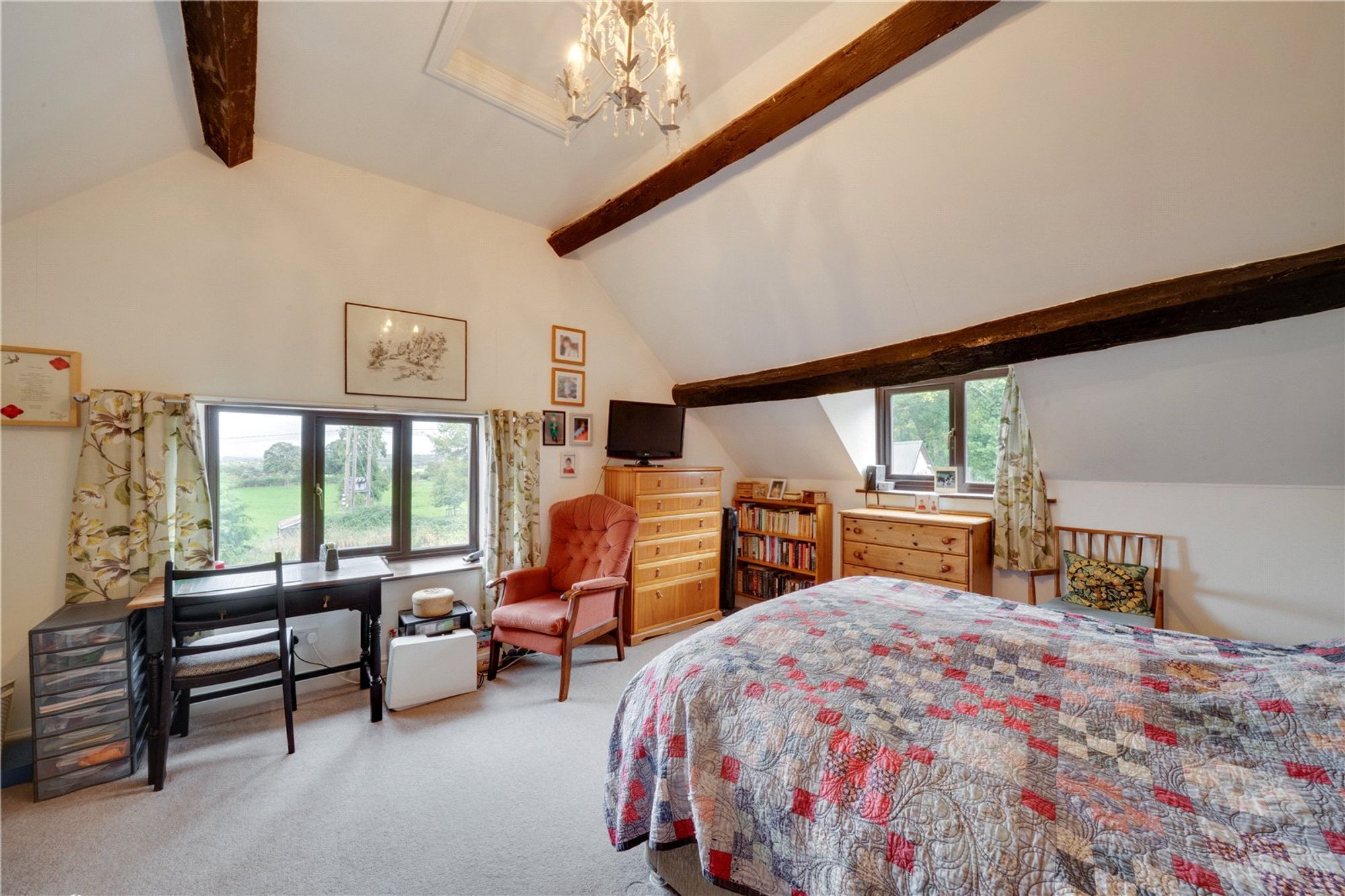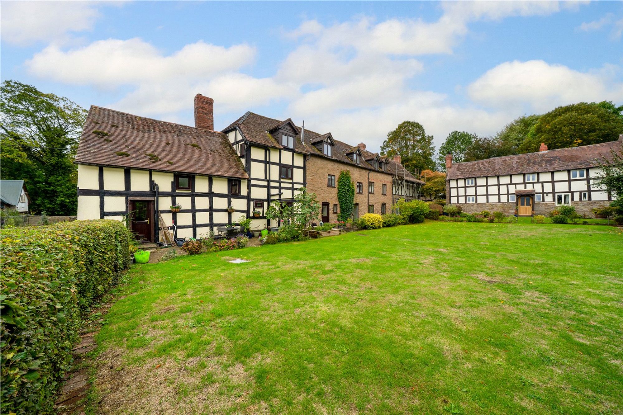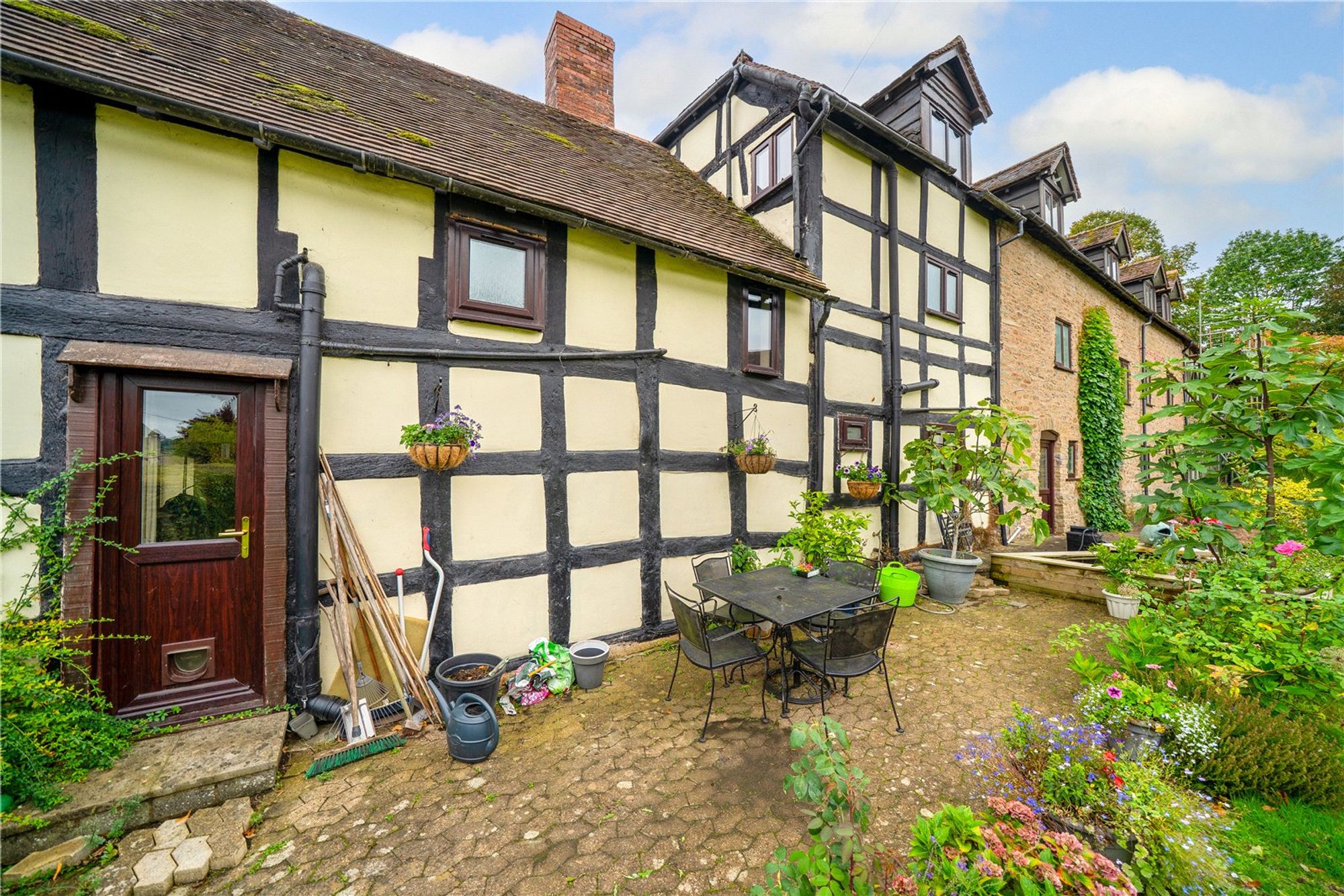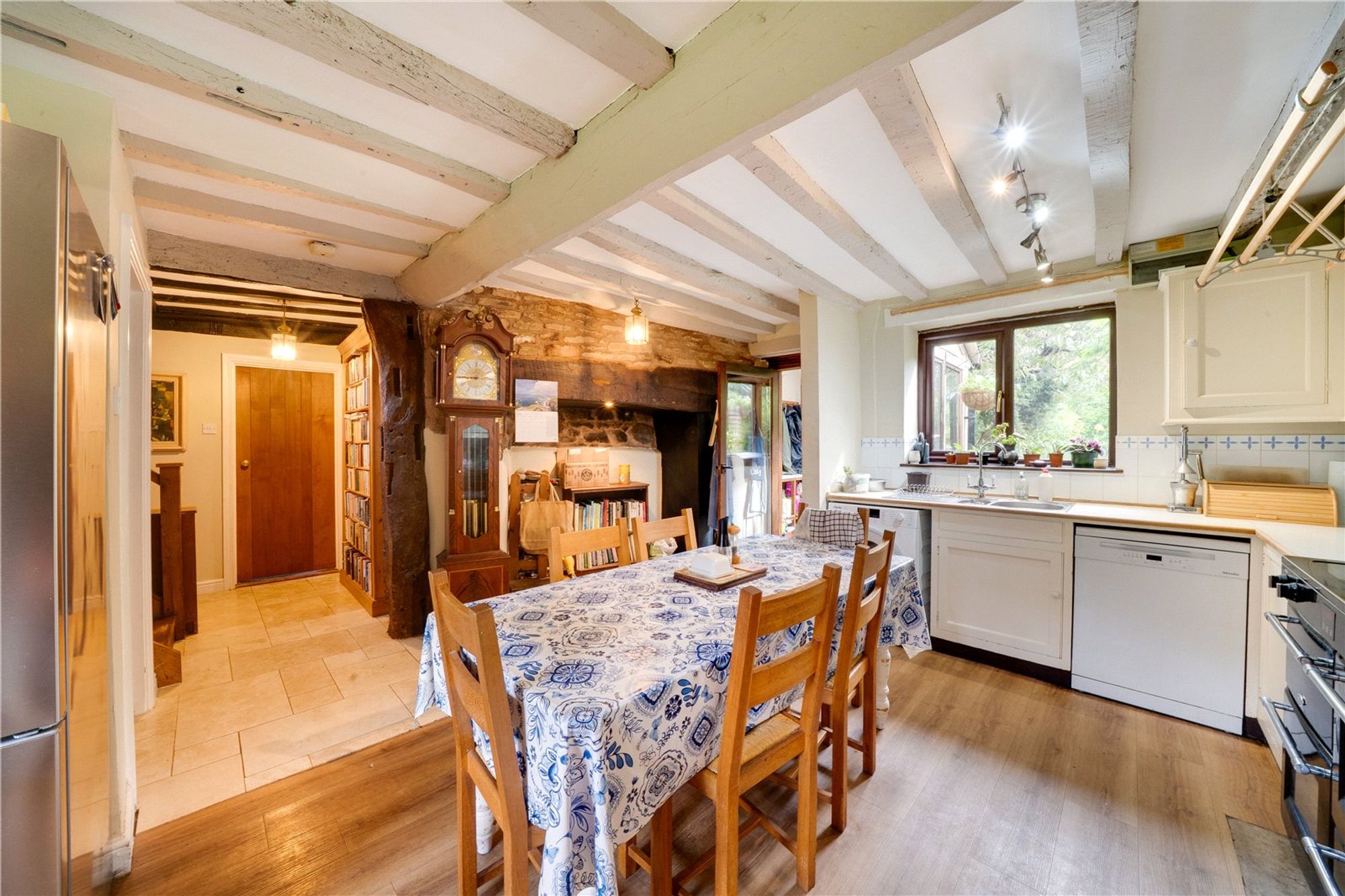 An oak-framed porch leads into the welcoming entrance hall, where exposed timbers immediately set the tone for the character found throughout the home. The kitchen and dining space has been thoughtfully opened to form a sociable and inviting area. Character features such as exposed beams and stonework highlight the property’s heritage. From the hall, a door leads into the sitting room, an inviting and comfortable space centred around a stone fireplace with a Clearview wood-burning stove. Exposed beams and a traditional wooden door enhance the character, while a glazed door opens directly onto the gardens, filling the room with natural light. Adjoining the sitting room is the garden room — a superb addition to the property. Glazed across its whole front, it enjoys wonderful views of the surrounding greenery and creates a tranquil space equally suited to relaxation, entertaining, or use as a home office or studio. Also on the ground floor is a cloakroom with WC and wash basin, adding useful practicality. The staircase and balustrade reflect the heritage of the house and lead to the first floor. Here, two spacious bedrooms are served by both an en-suite and a family shower room, all presented to a high standard. Original beams and exposed stonework continue the character theme, blending period features with modern comfort. A second staircase rises to the top floor, where a further double and a single bedroom/office enjoy elevated views of the gardens and countryside, showcasing the home’s size and versatility. The property is complemented by a patio and a communal lawn to the rear. To the front, a cottage-style garden is laid mainly to lawn and framed by established borders and hedging. The property benefits from a double garage which is fitted with twin opening doors, power, lighting and overhead storage, with ample parking in the shared driveway. Buyers Compliance Administration Fee: In accordance with The Money Laundering Regulations 2007, Agents are required to carry out due diligence on all Clients to confirm their identity, including eventual buyers of a property. The Agents use electronic verification system to verify Clients’ identity. This is not a credit check so will have no effect on credit history though may check details you supply against any particulars on any database to which they have access. By placing an offer on a property, you agree that if your offer is accepted, subject to contract, we as Agents for the seller can complete this check for a fee of £75 inc VAT (£62.50 + VAT) per property transaction, non-refundable under any circumstance. A record of the search will be retained by the Agents.