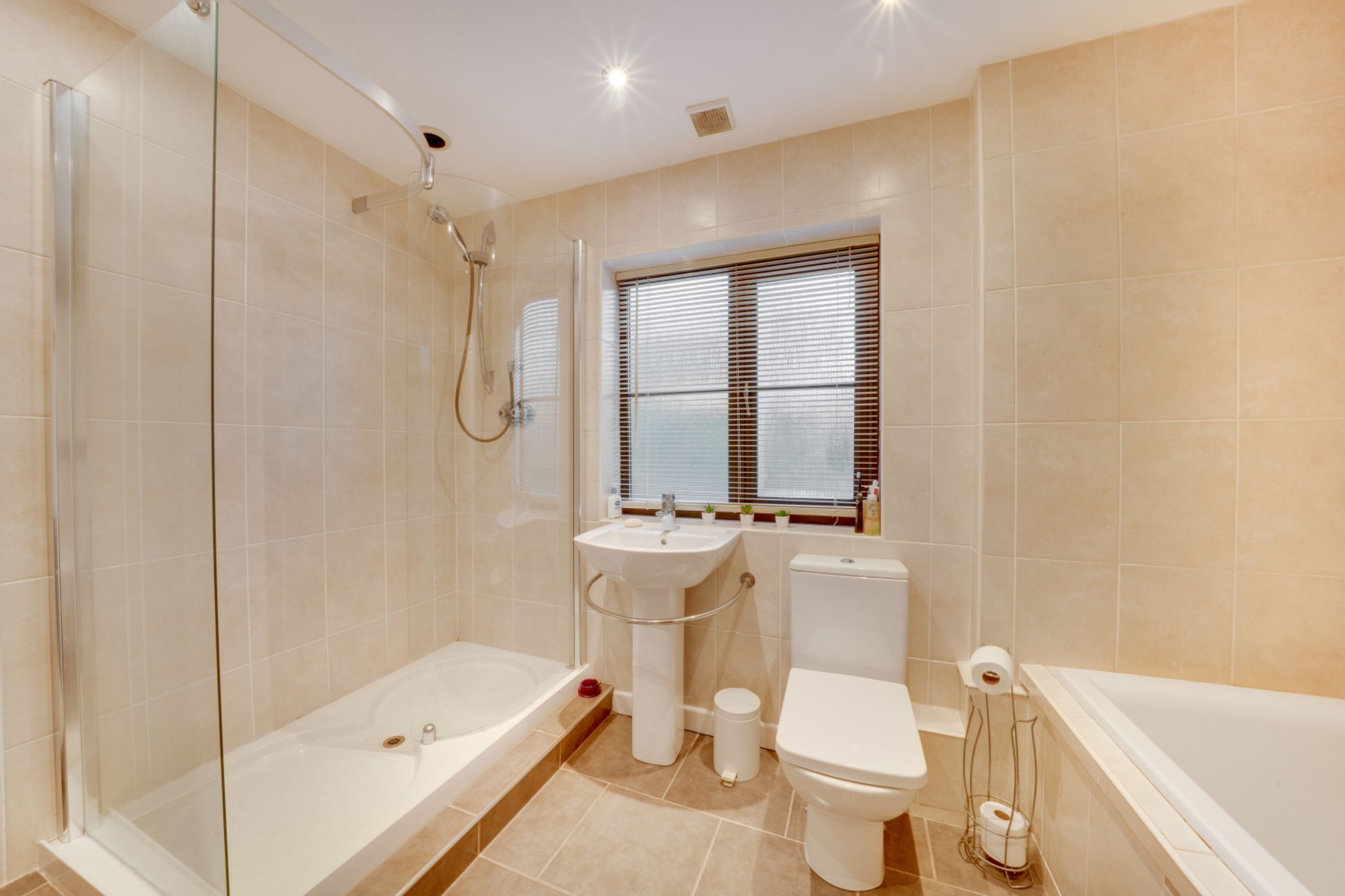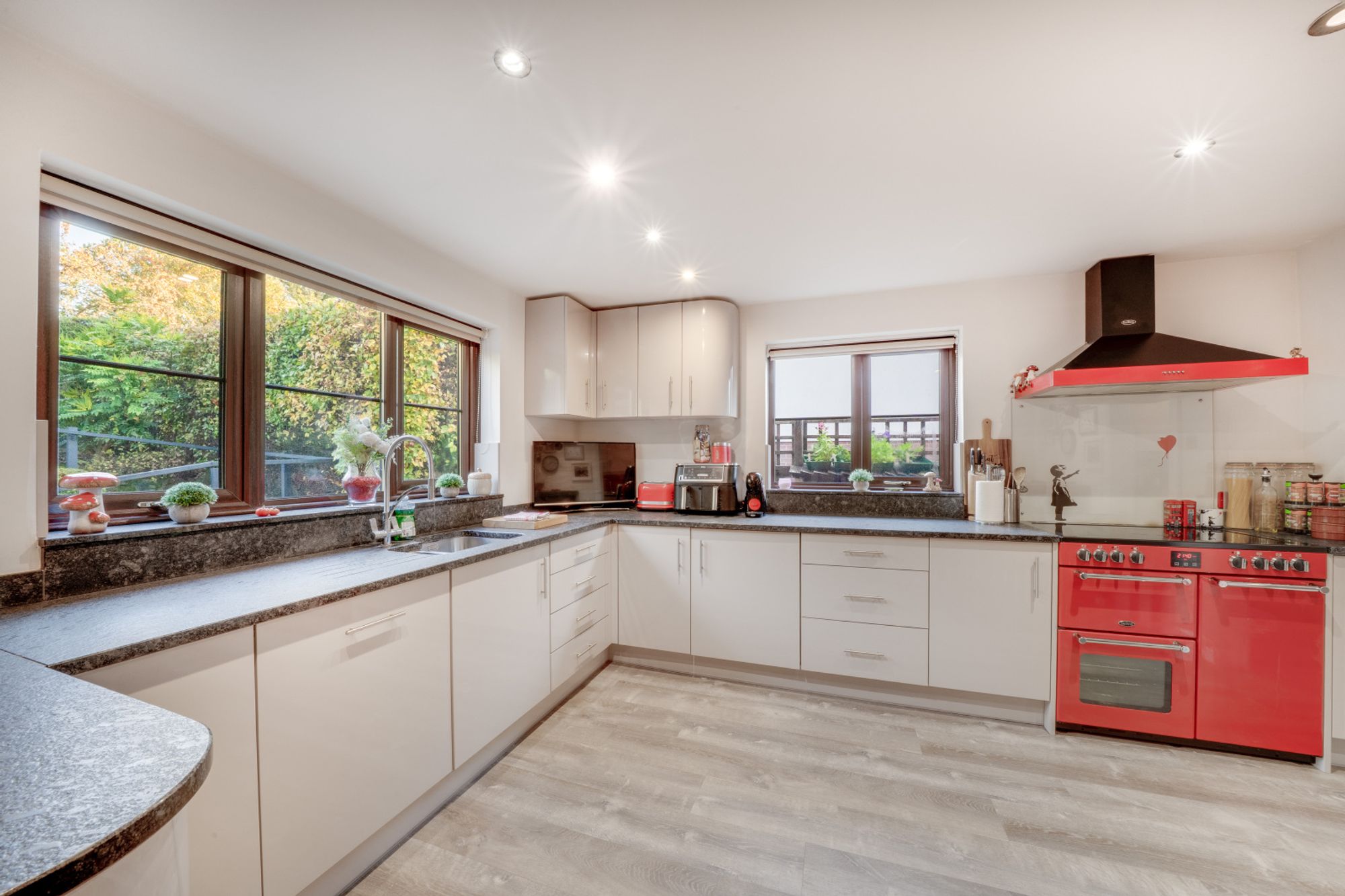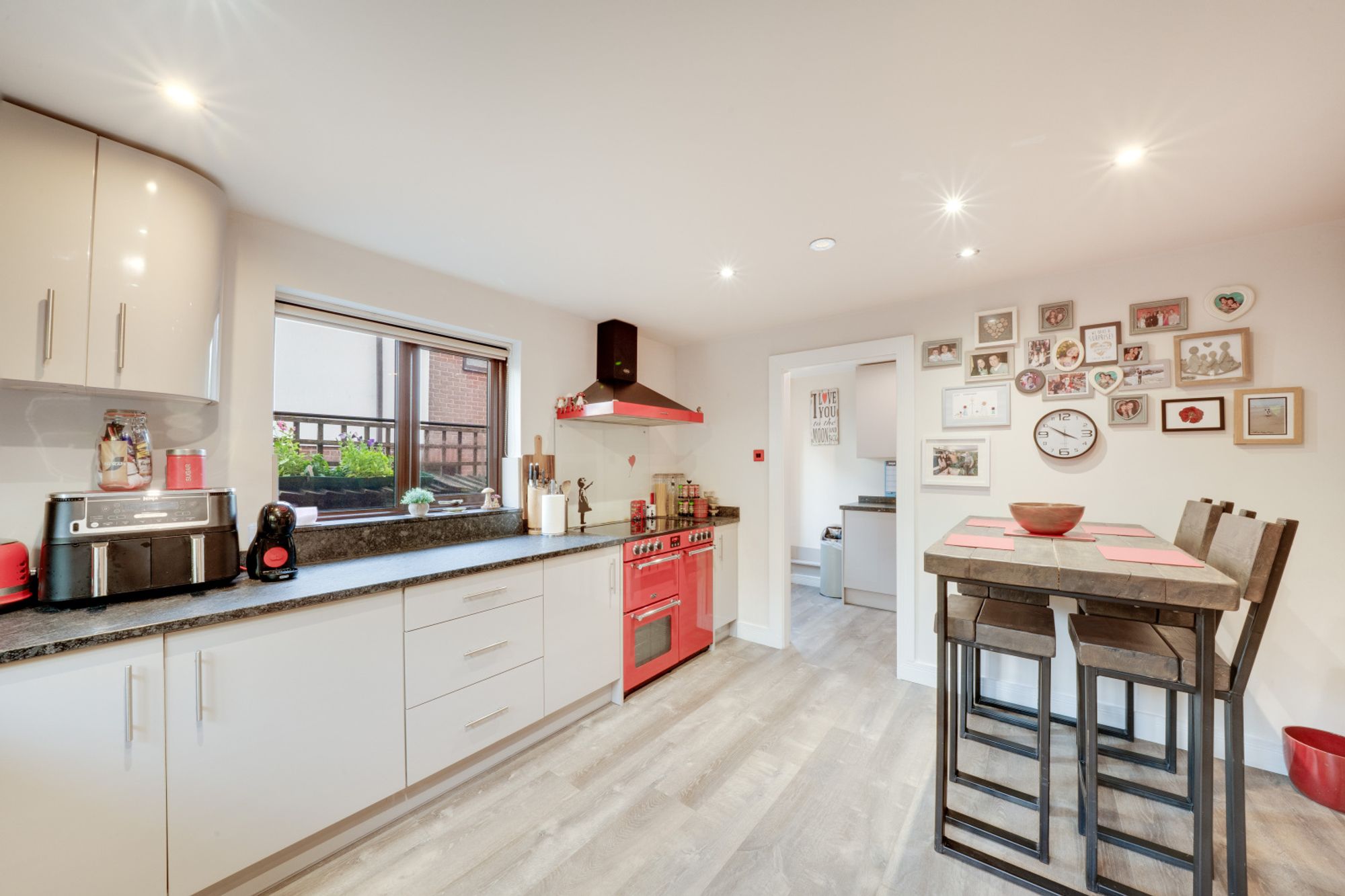 The modern kitchen is to the left of the entrance and comes well-appointed, offering ample worktop areas, fitted units and space for a breakfast table — ideal for those who enjoy cooking and entertaining. Adjacent to the kitchen is a useful utility room, offering plenty of storage and space for appliances, with access to the side of the property.
