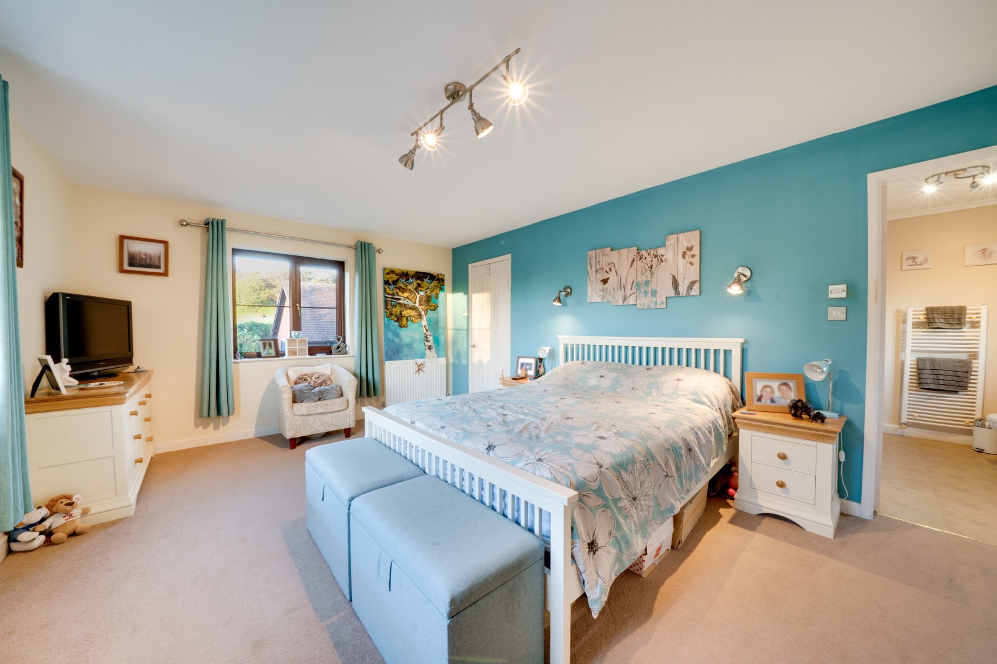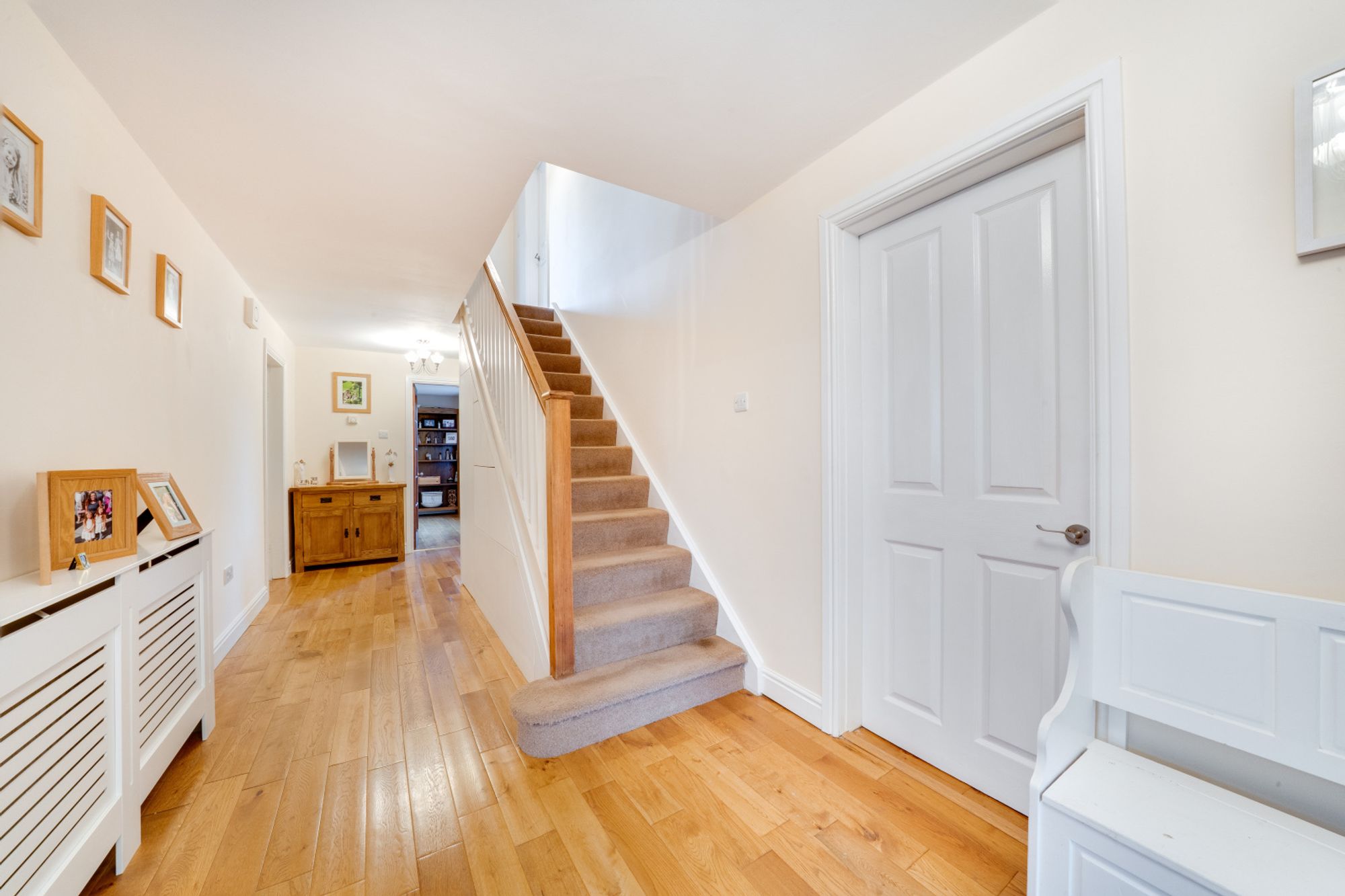 A wide staircase rises to a bright airy landing, giving access to four double bedrooms, a large airing cupboard and family bathroom comprising bath, separate shower cubicle, WC and wash hand basin. The principal bedroom at the back of the home benefits from an en-suite shower room and fitted wardrobes which span the width of the room. All of the remaining bedrooms, are also excellent sizes, and enjoy different aspects looking out over surrounding countryside.